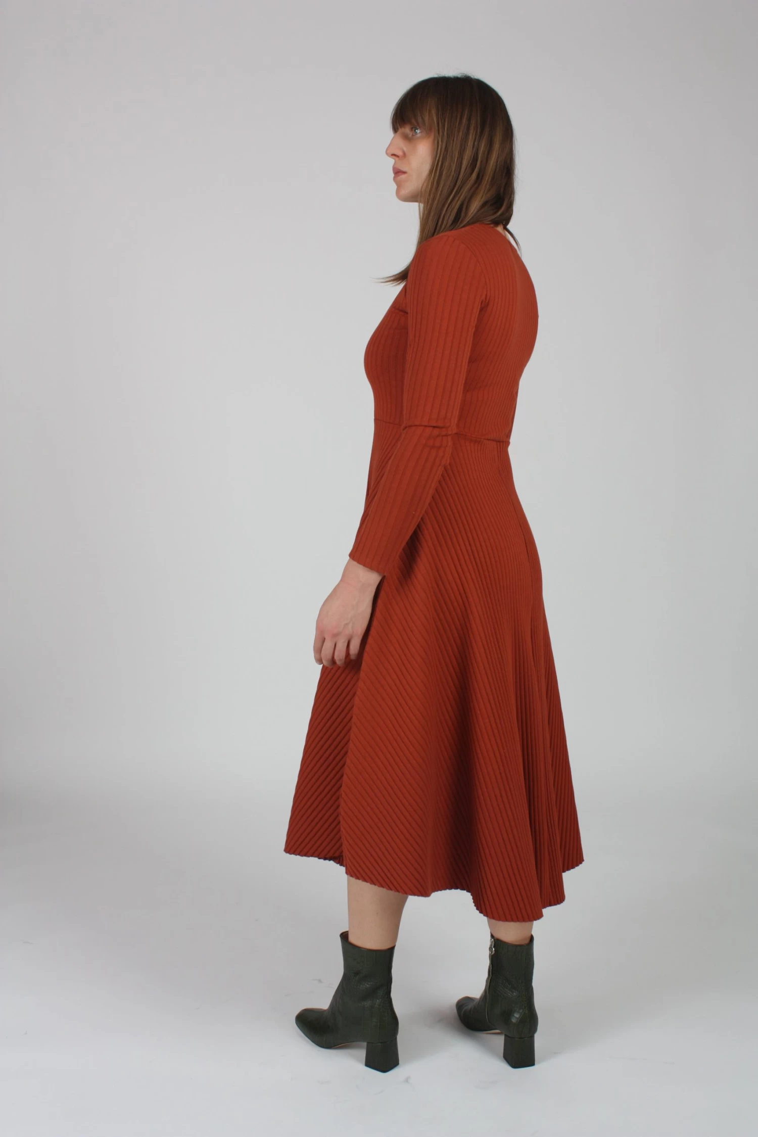 Fitted dress in rich ribbed stretch Pima cotton. Flattering terracotta color, v neckline, fitted bodice and A line skirt.