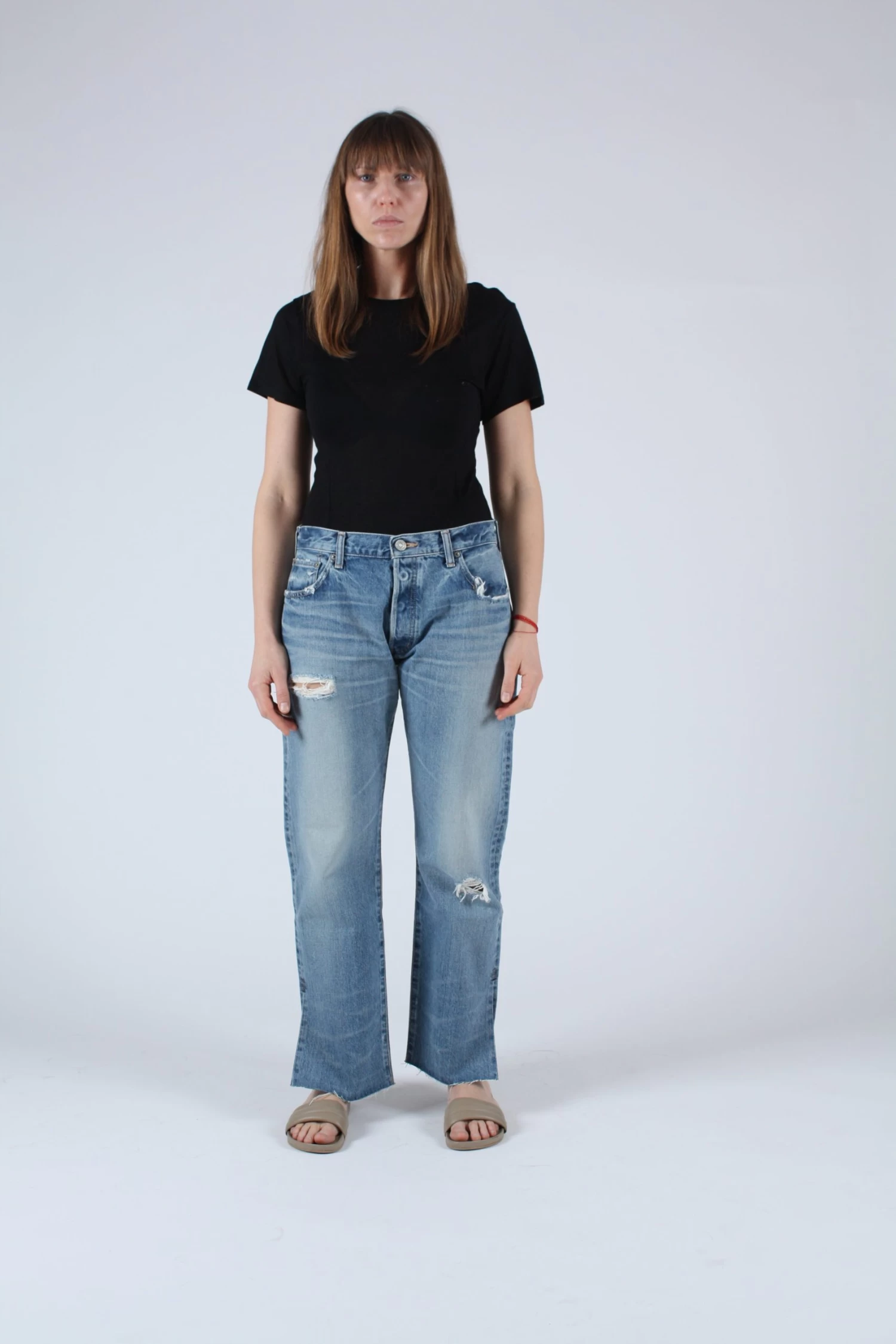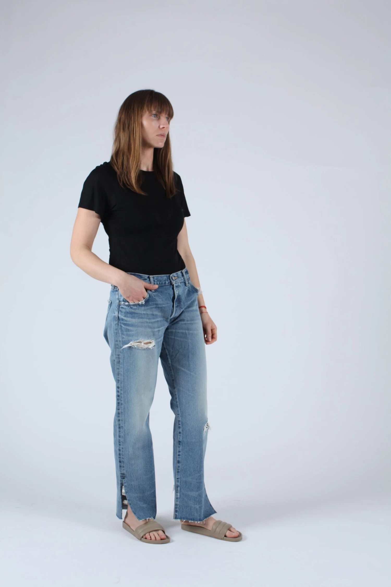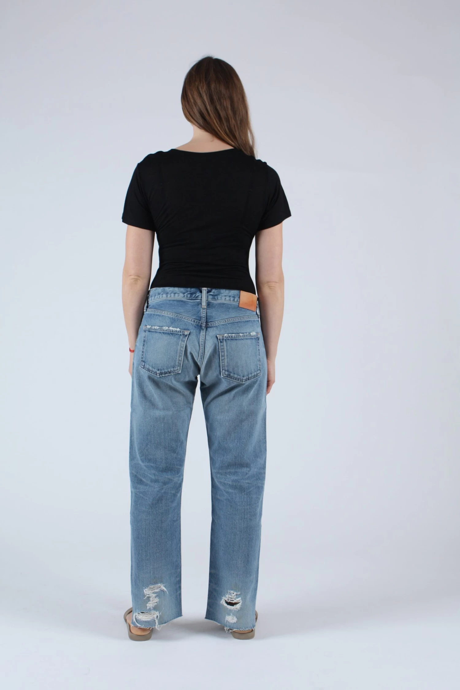 Mid rise staight leg in a blue wash with distressing and ankle slits. Button closure.