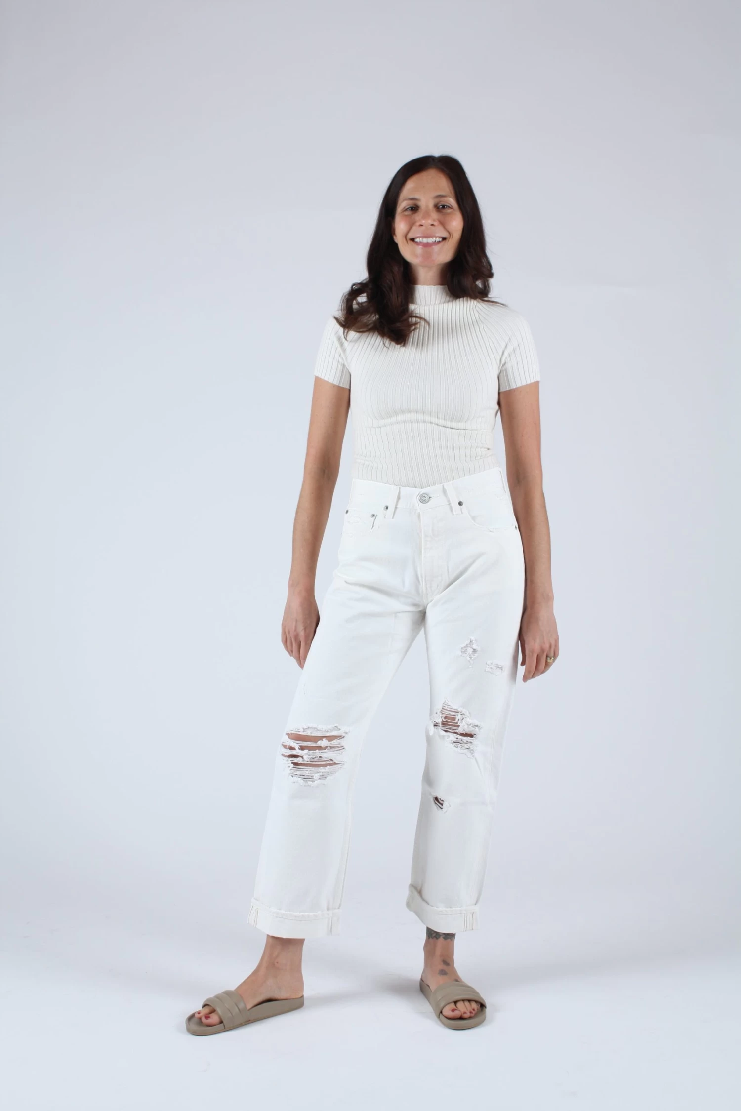 High waisted cuffed straight leg in white. Distressed front and button fly.