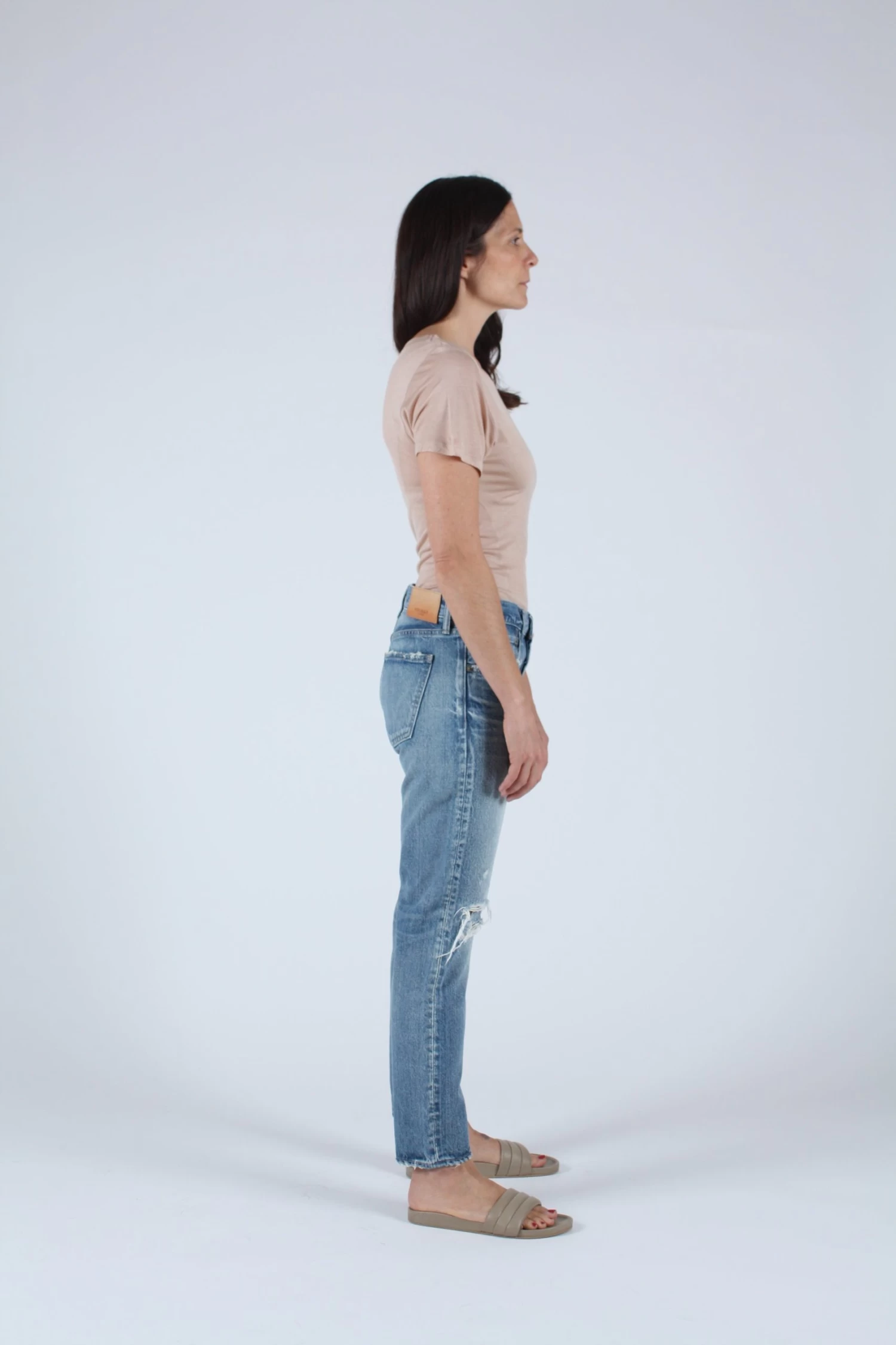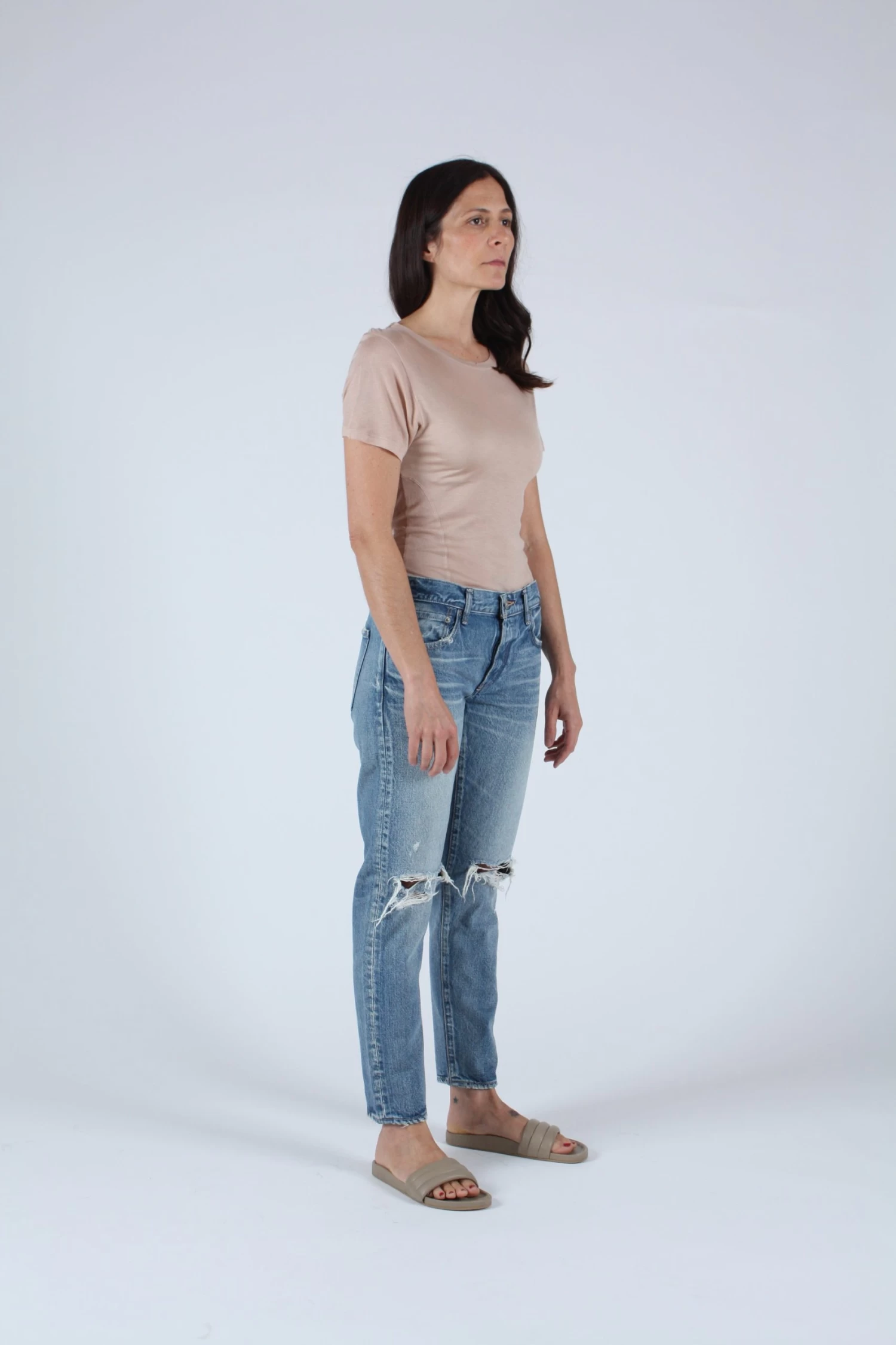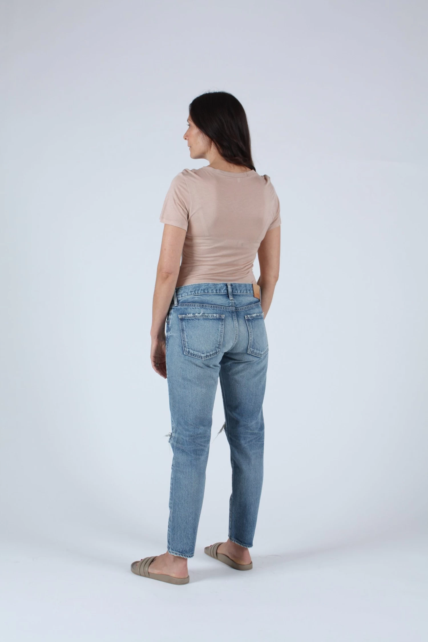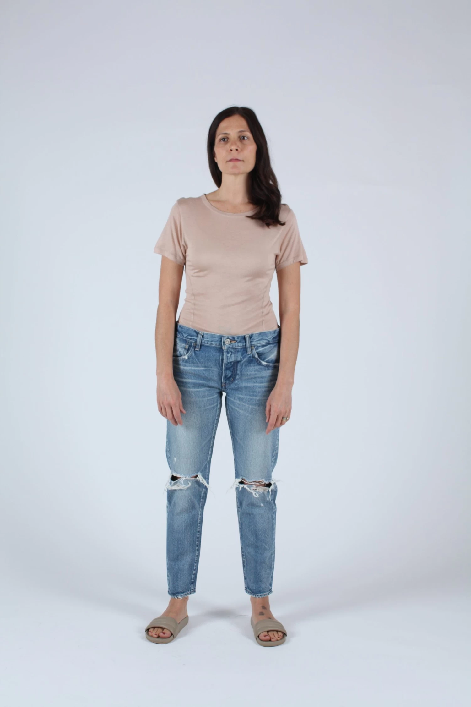 Mid rise tapered jean in light blue with distressed knees.Â