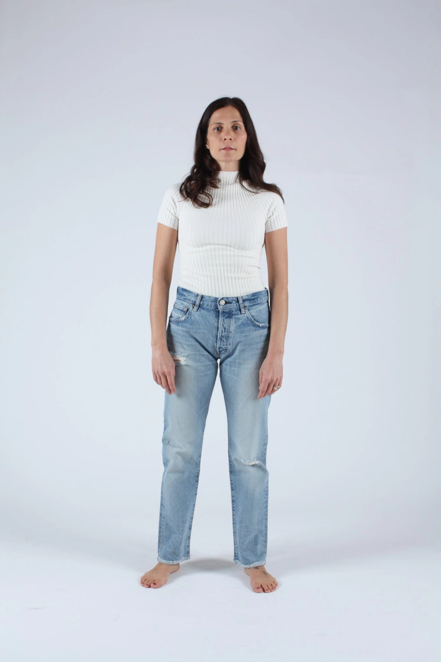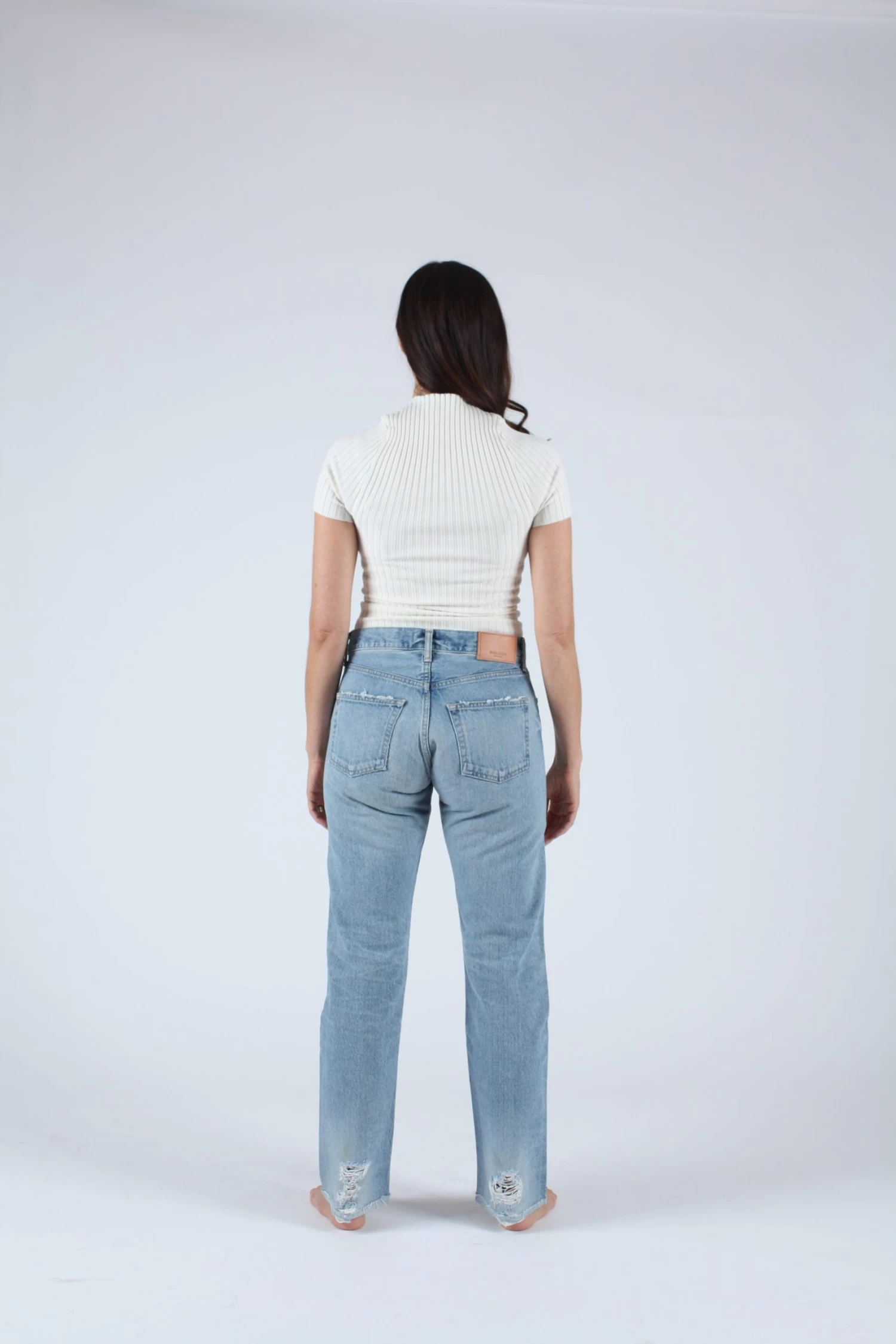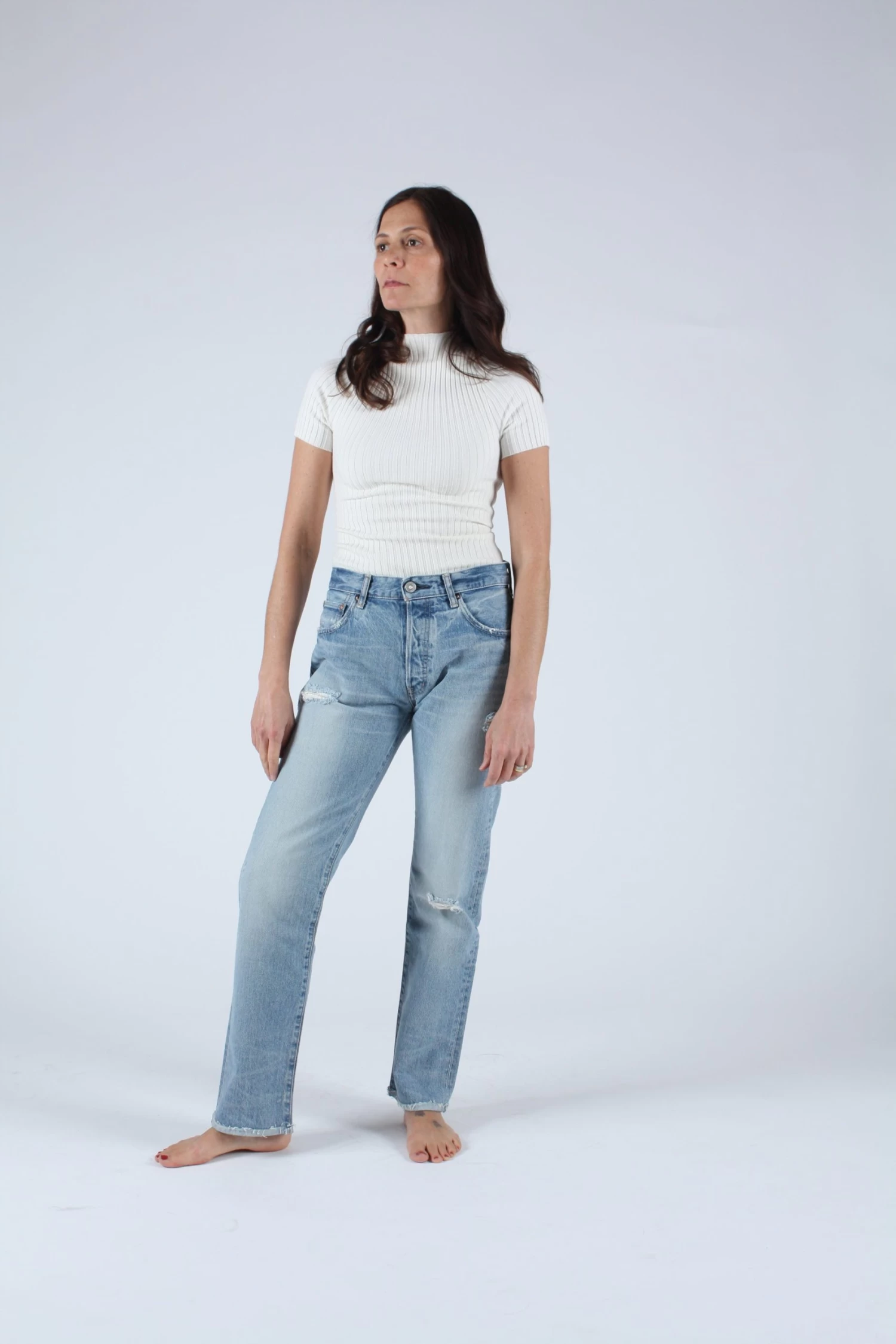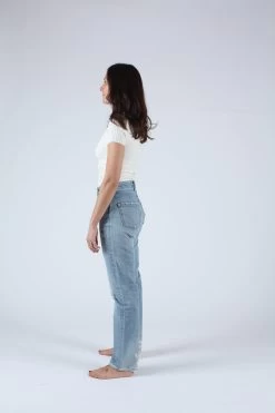 High waisted straight leg in a blue wash with some distressing. Button fly.Â