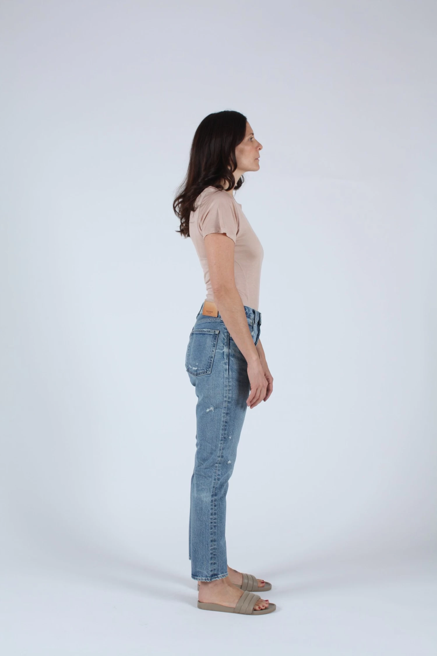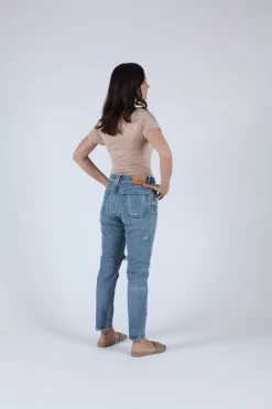 Mid rise tapered leg in a blue wash and light distressing.