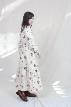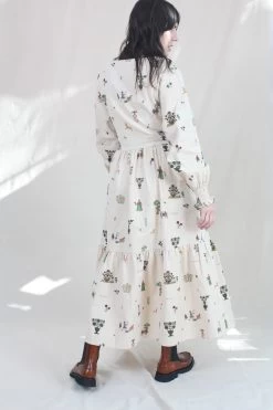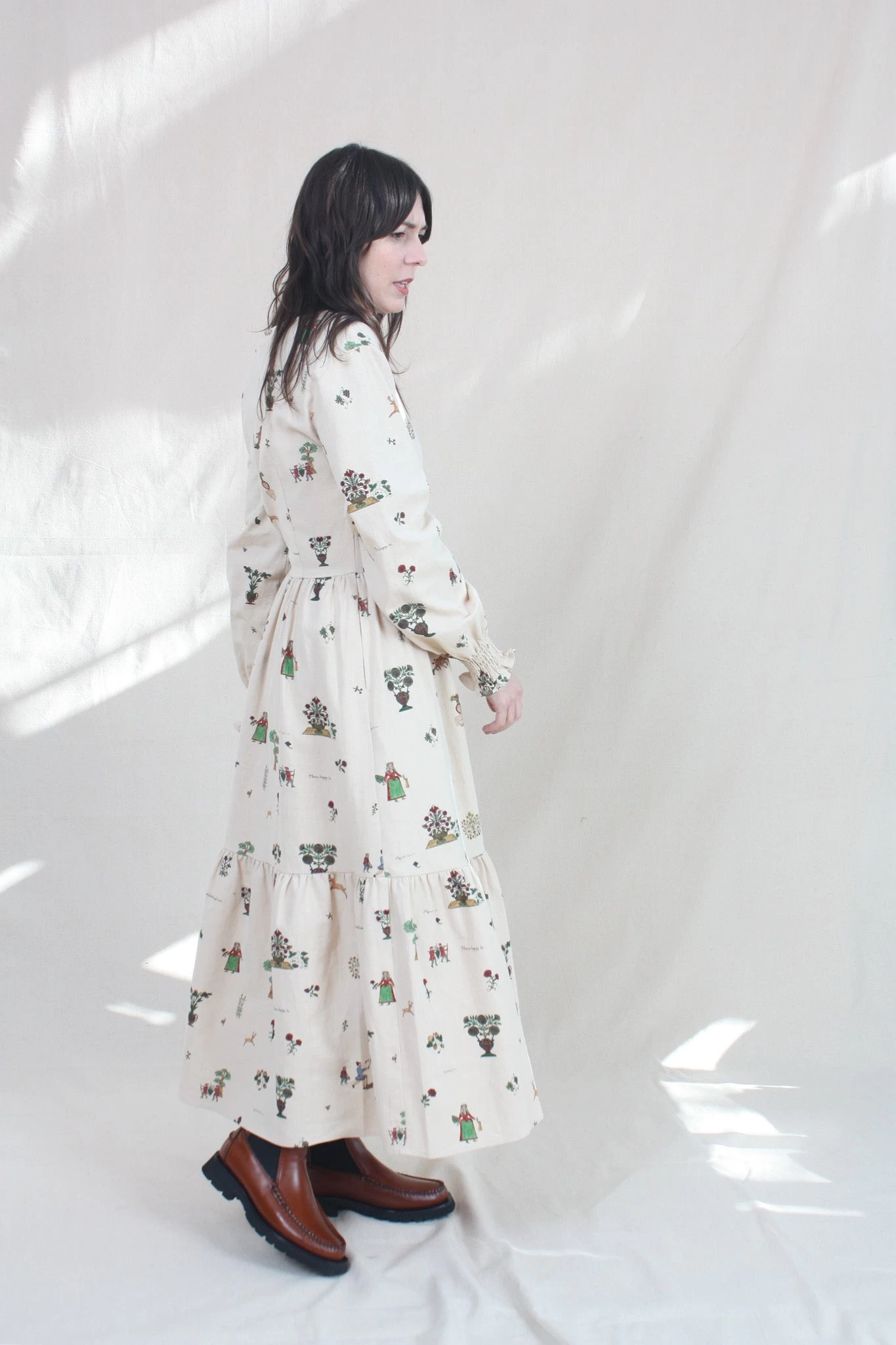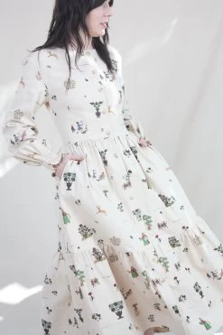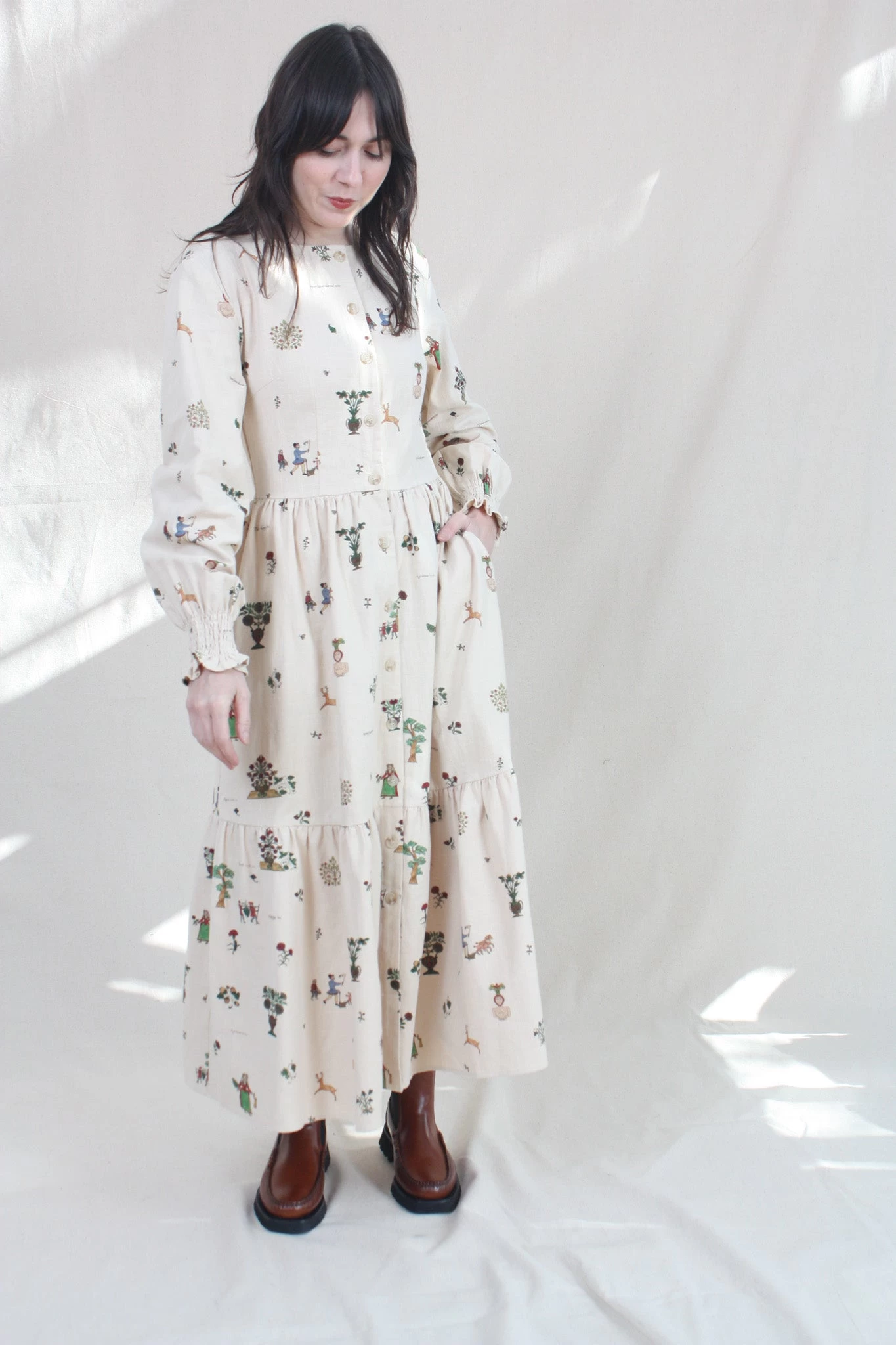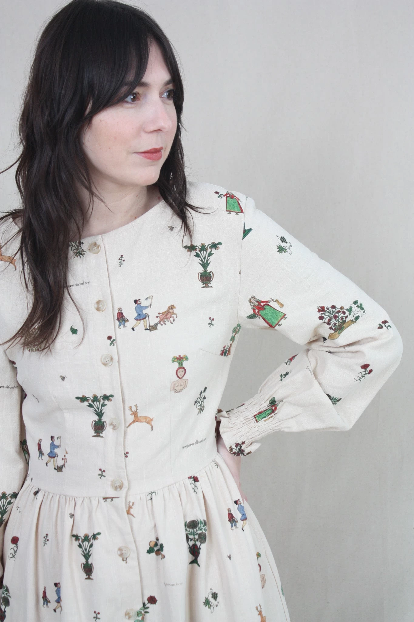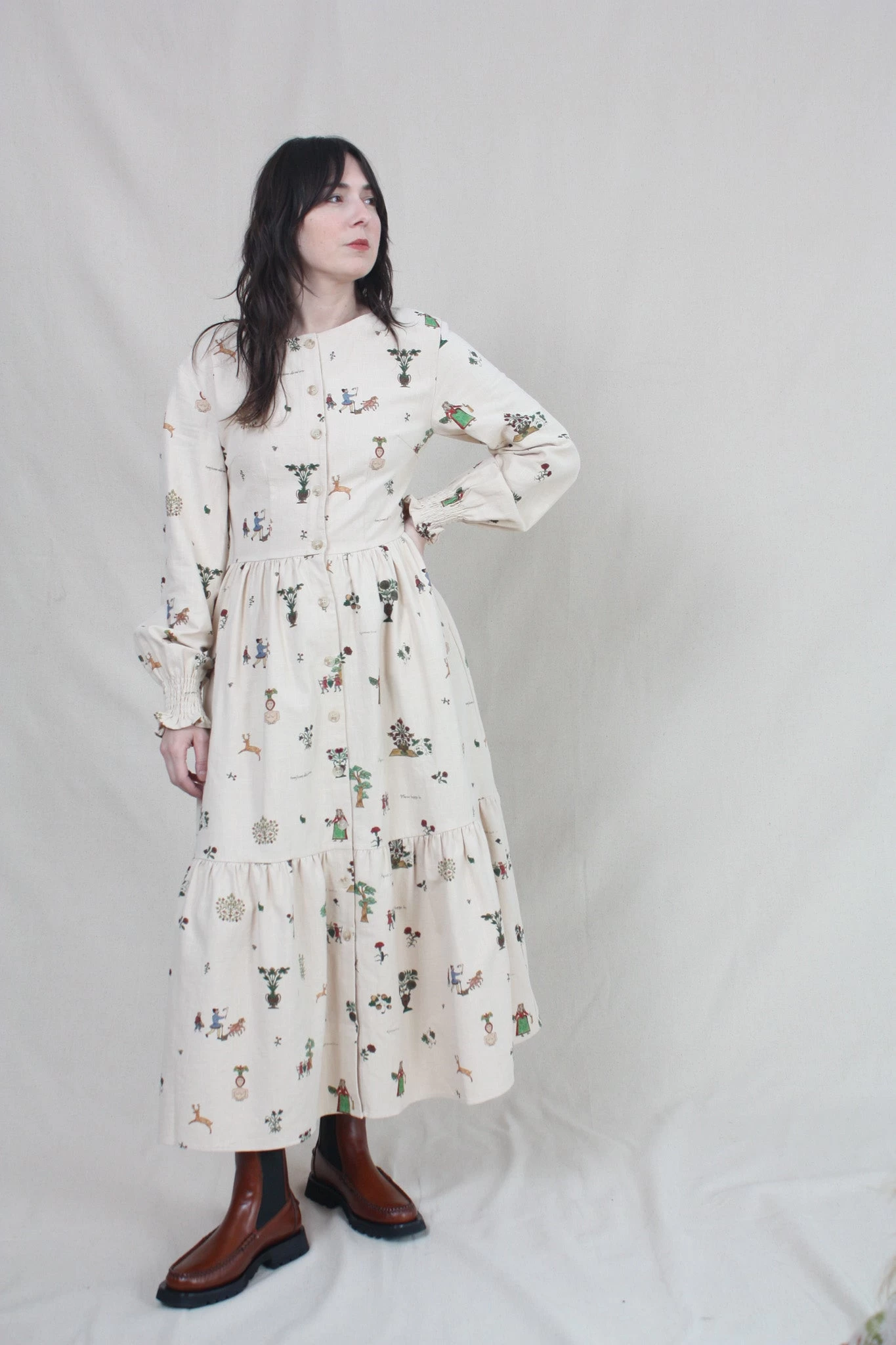 The Myrcia Dress is a long sleeve dress with a round neck, a tortoise shell button opening, and shirred cuffs. Features a gathered waist and a tiered, mid-length skirt which creates subtle volume. The Treasure Print features Medieval pastoral scenes and Olde English poetry.
