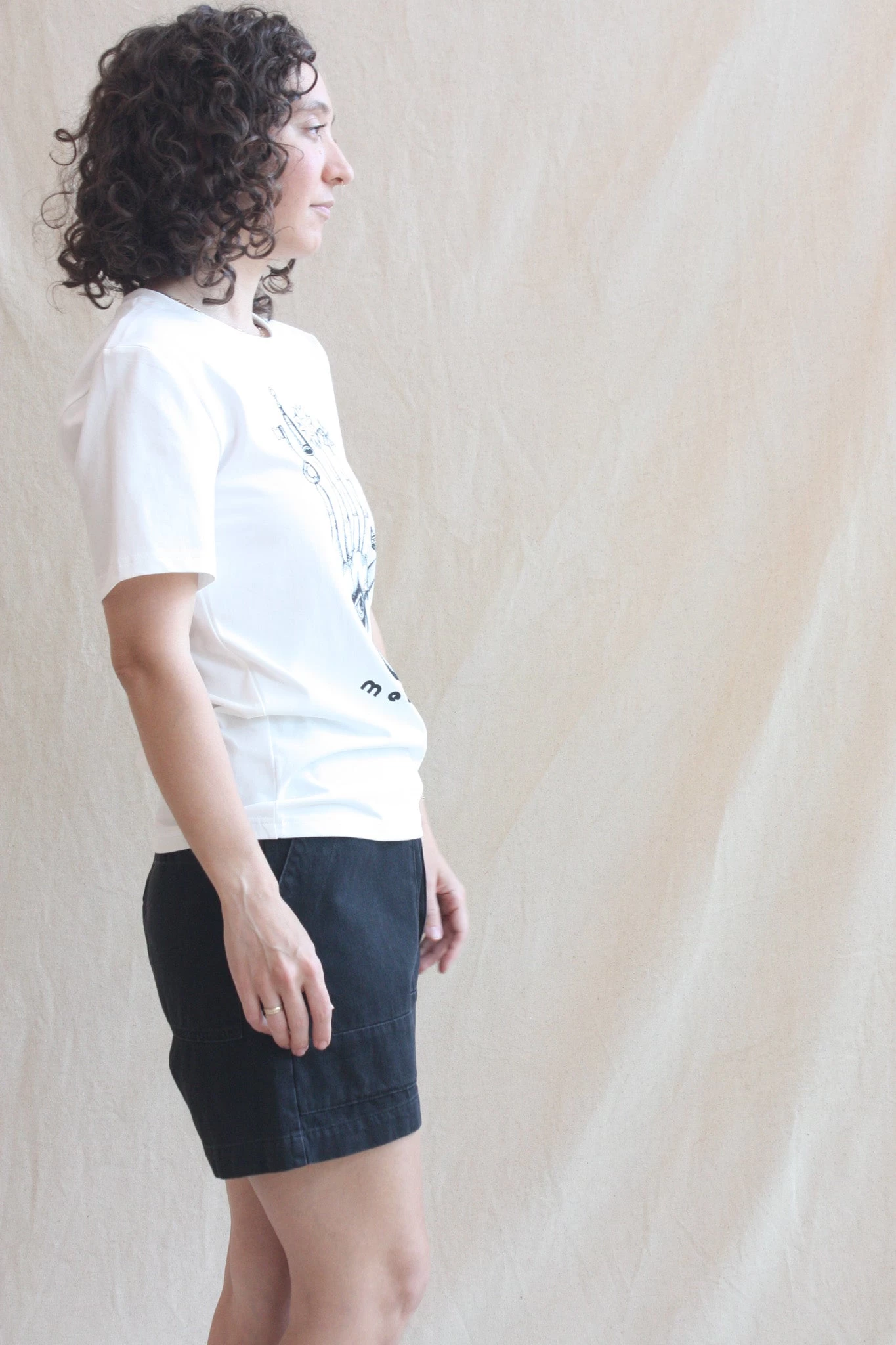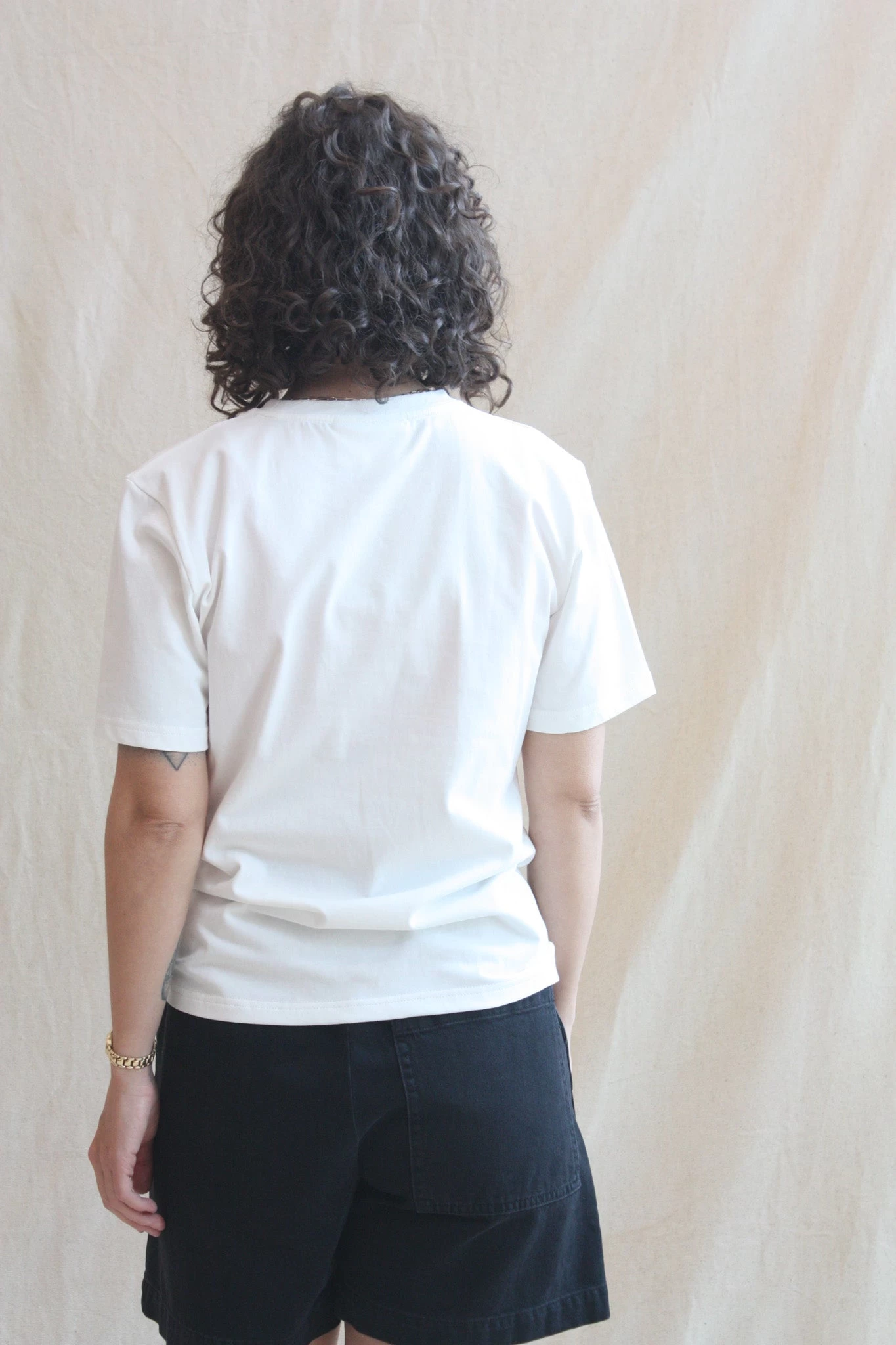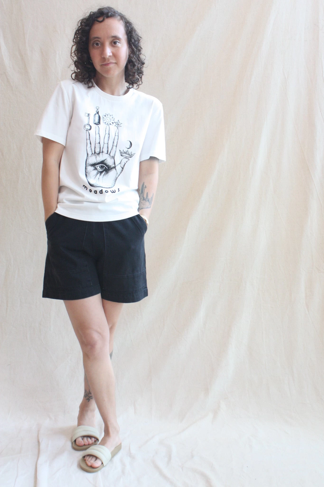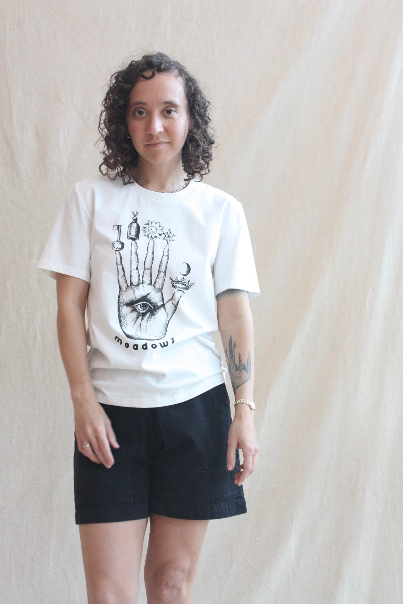 Fitted off white t-shirt with printed black Mystic Hand illustration on front.