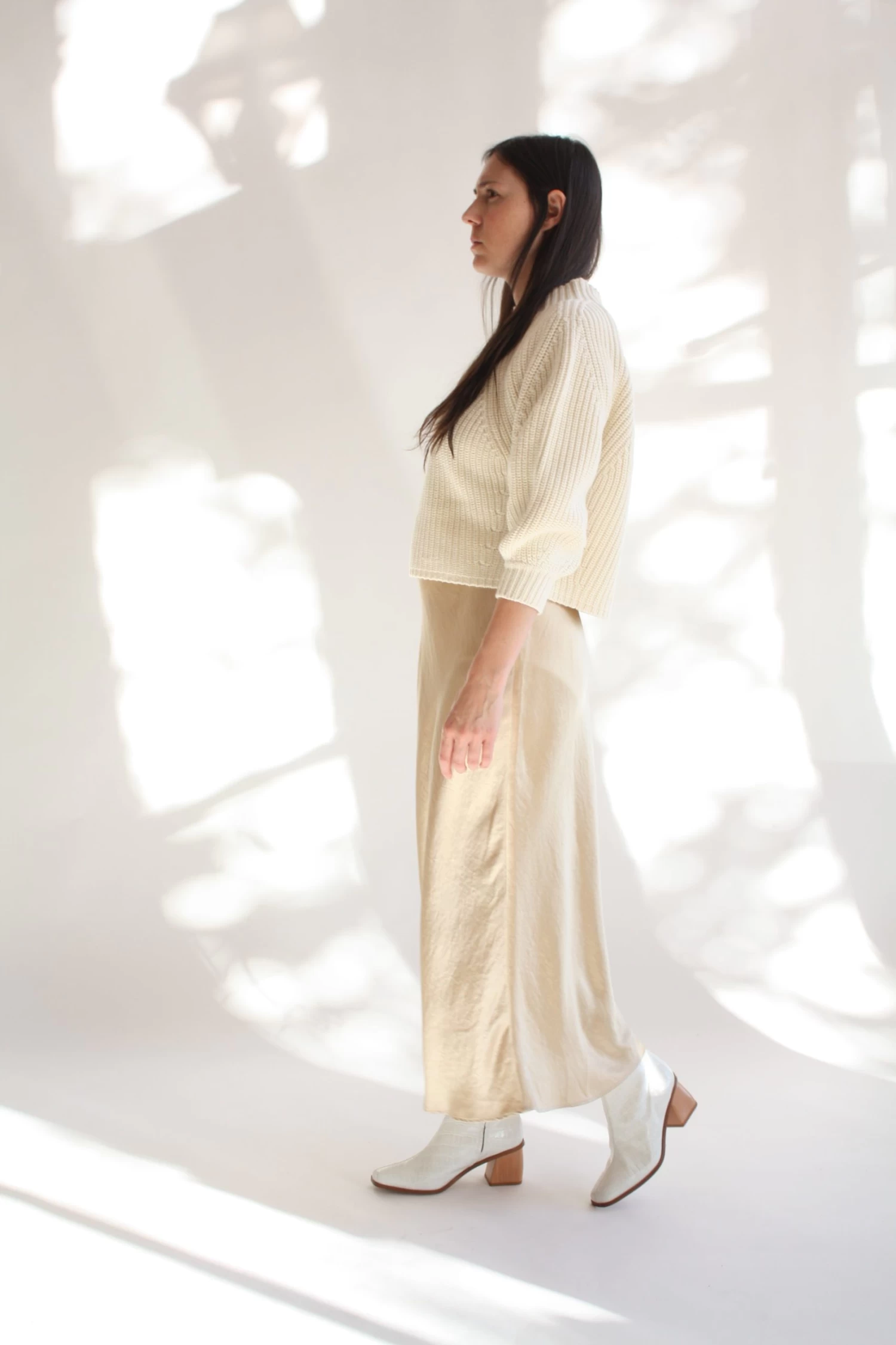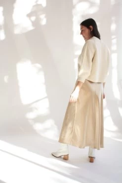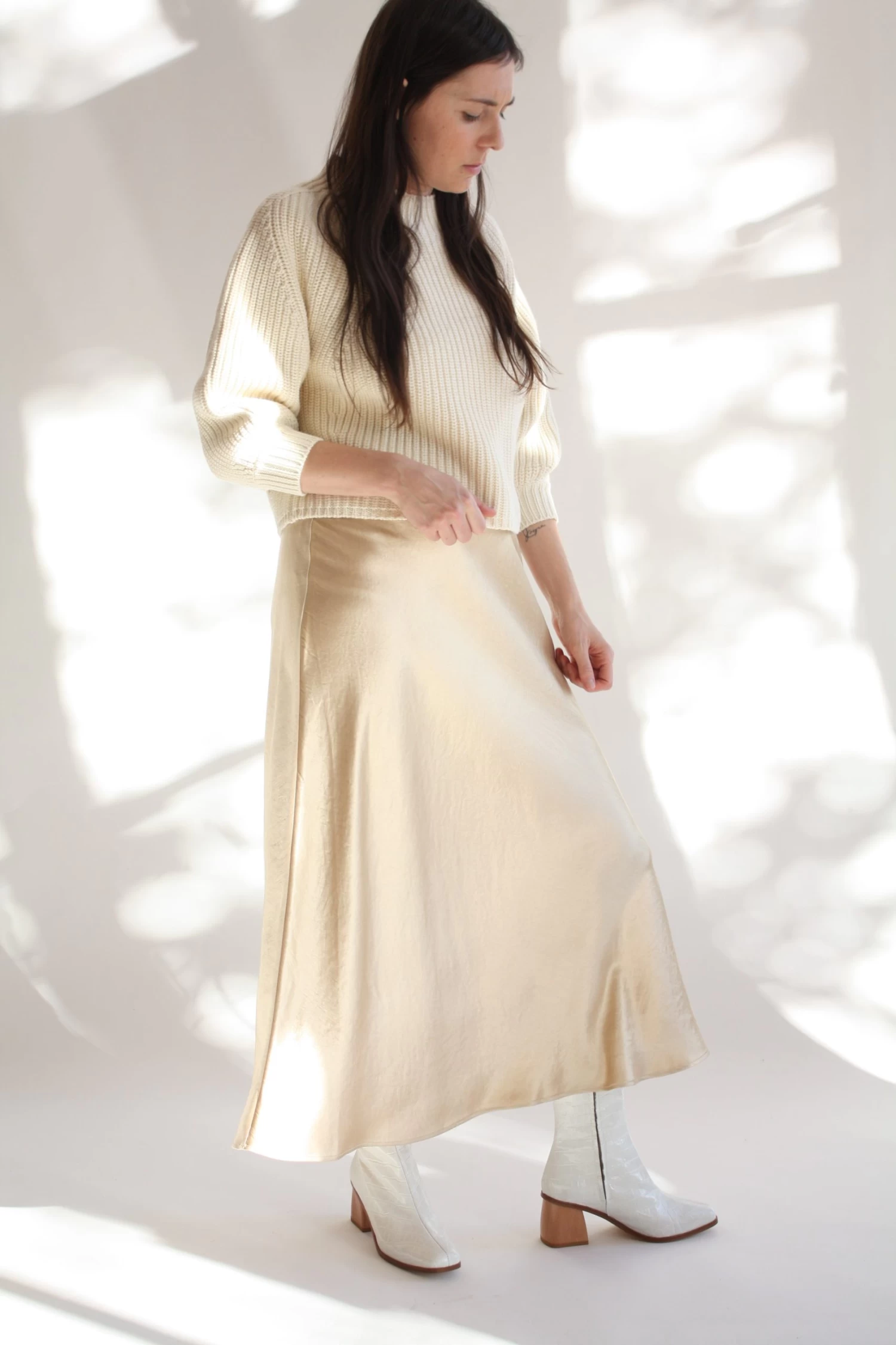 A classic ankle-length bias cut skirt with invisible zipper.