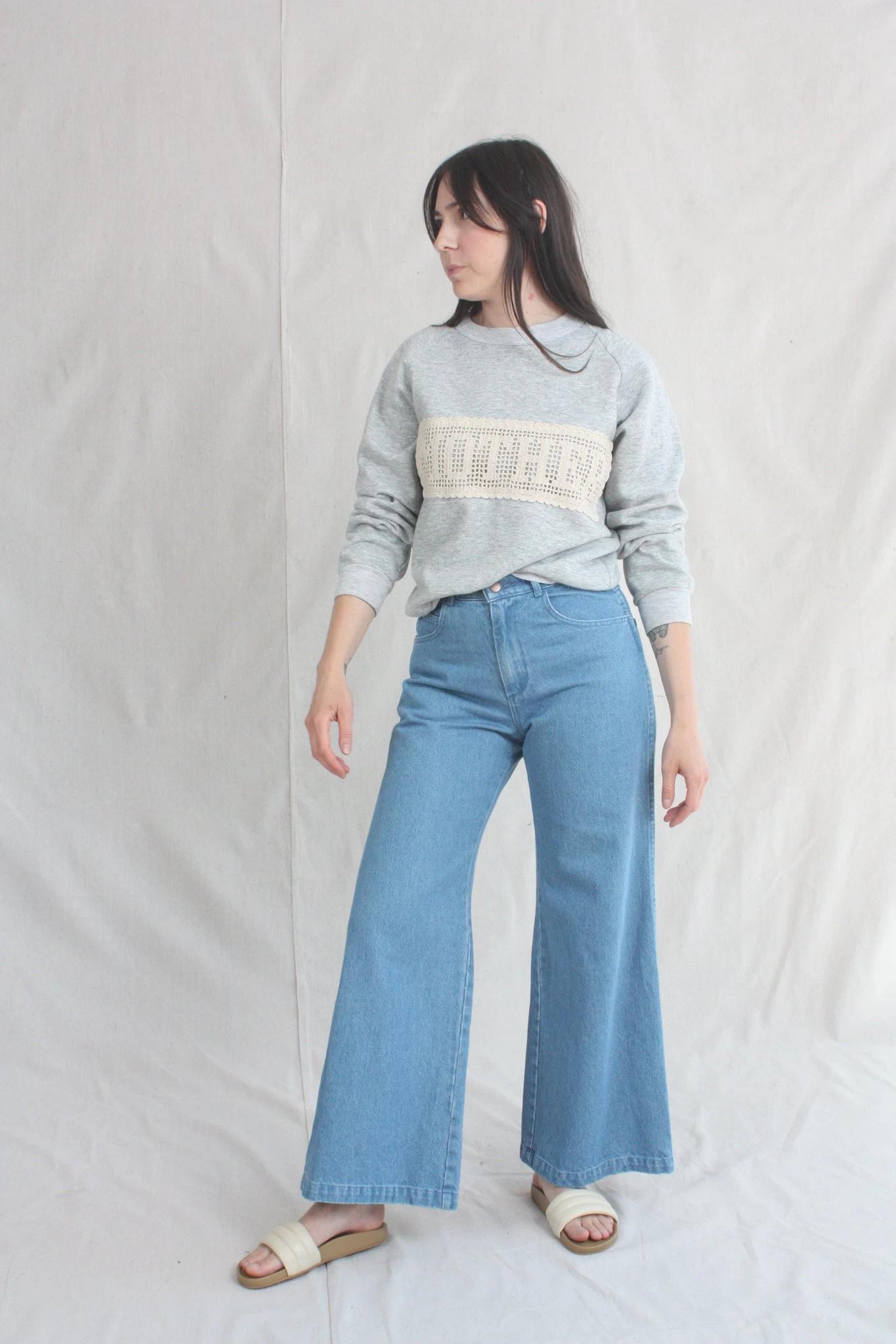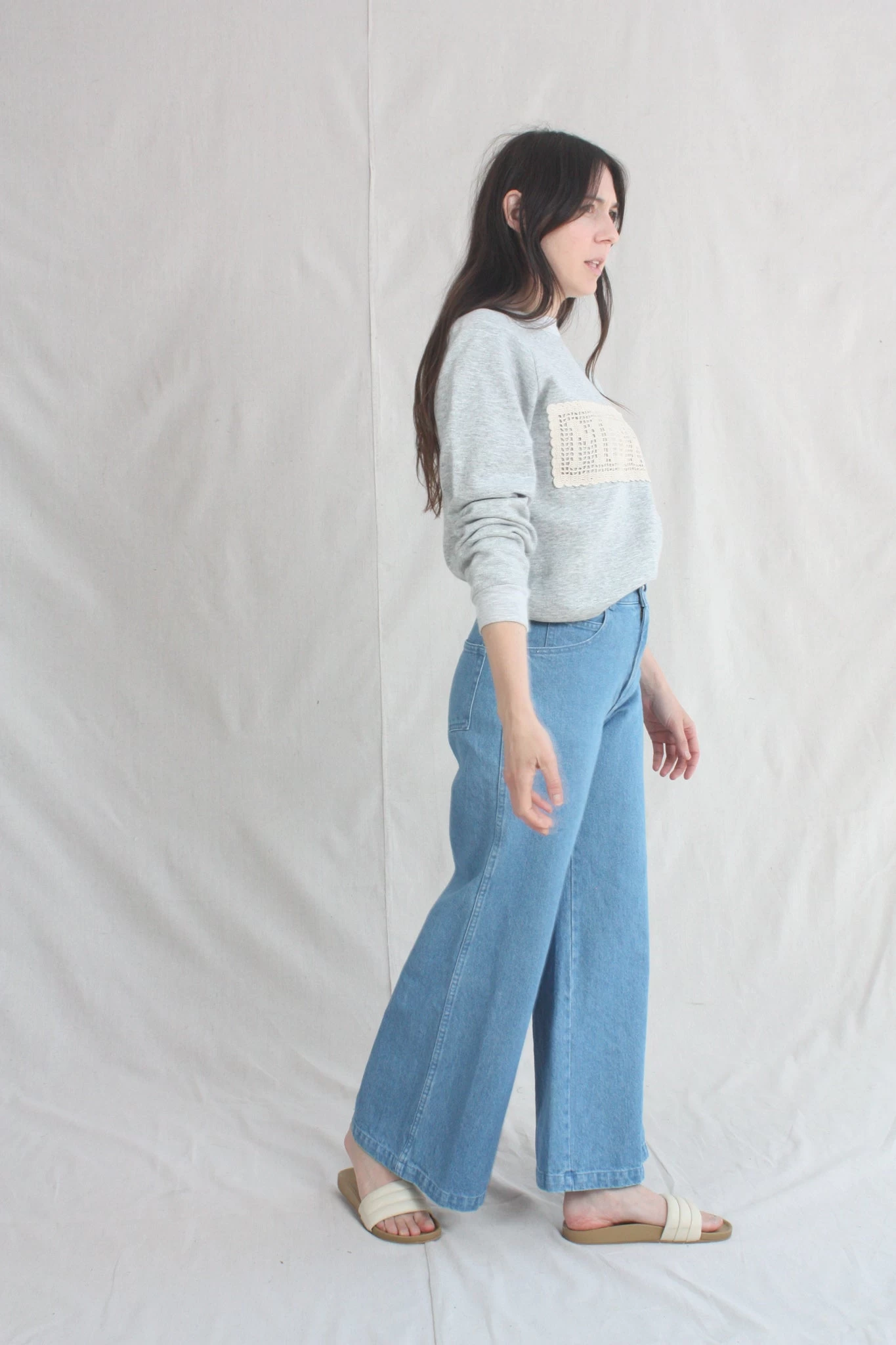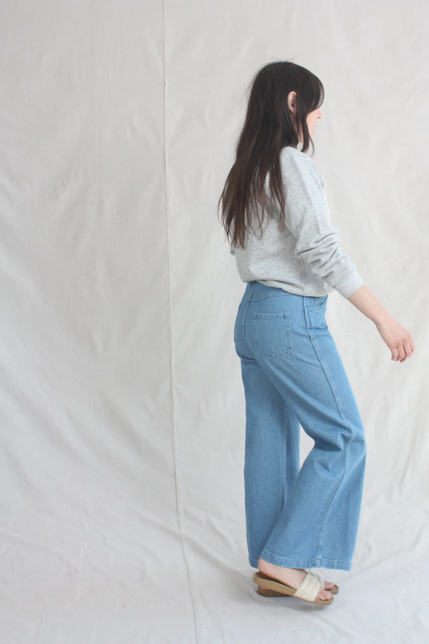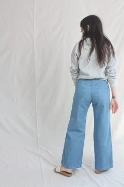 The Nelly has a high-rise fit through the torso, with a wide-leg silhouette from the thigh down. 100% cotton denim holds you in, but eases up in all the right places with repeated wear.Β Rinsed dark blue on the right leg and a light blue from the reverse side of the denim on the left. 12β rise. Each pair is given a quick wash to shake out some of the initial stiffness of raw denim.