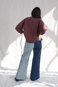The Nelly has a high-rise fit through the torso, with a wide-leg silhouette from the thigh down. 100% cotton denim holds you in, but eases up in all the right places with repeated wear.Β Rinsed dark blue on the right leg and a light blue from the reverse side of the denim on the left. 12β rise. Each pair is given a quick wash to shake out some of the initial stiffness of raw denim.