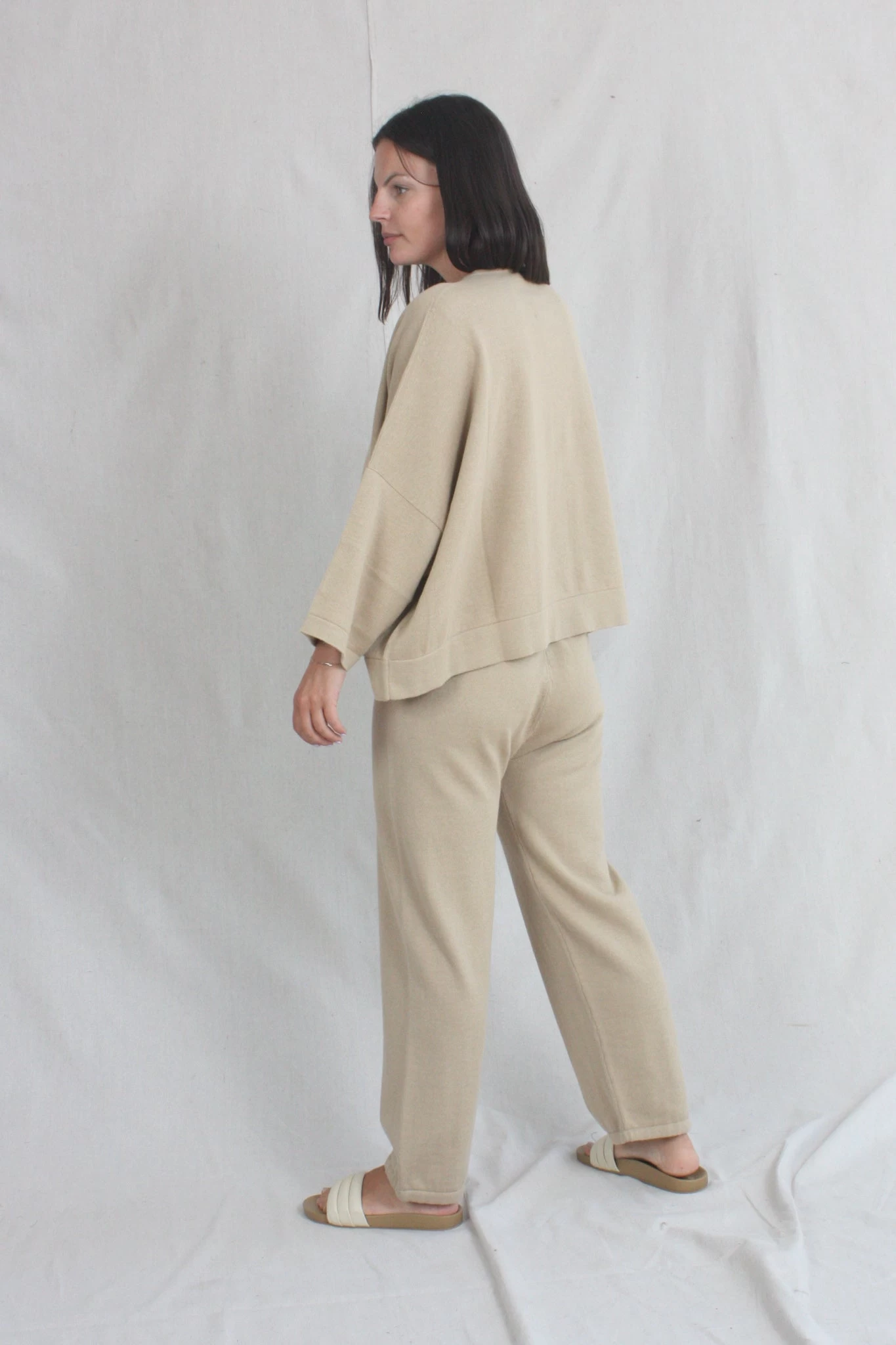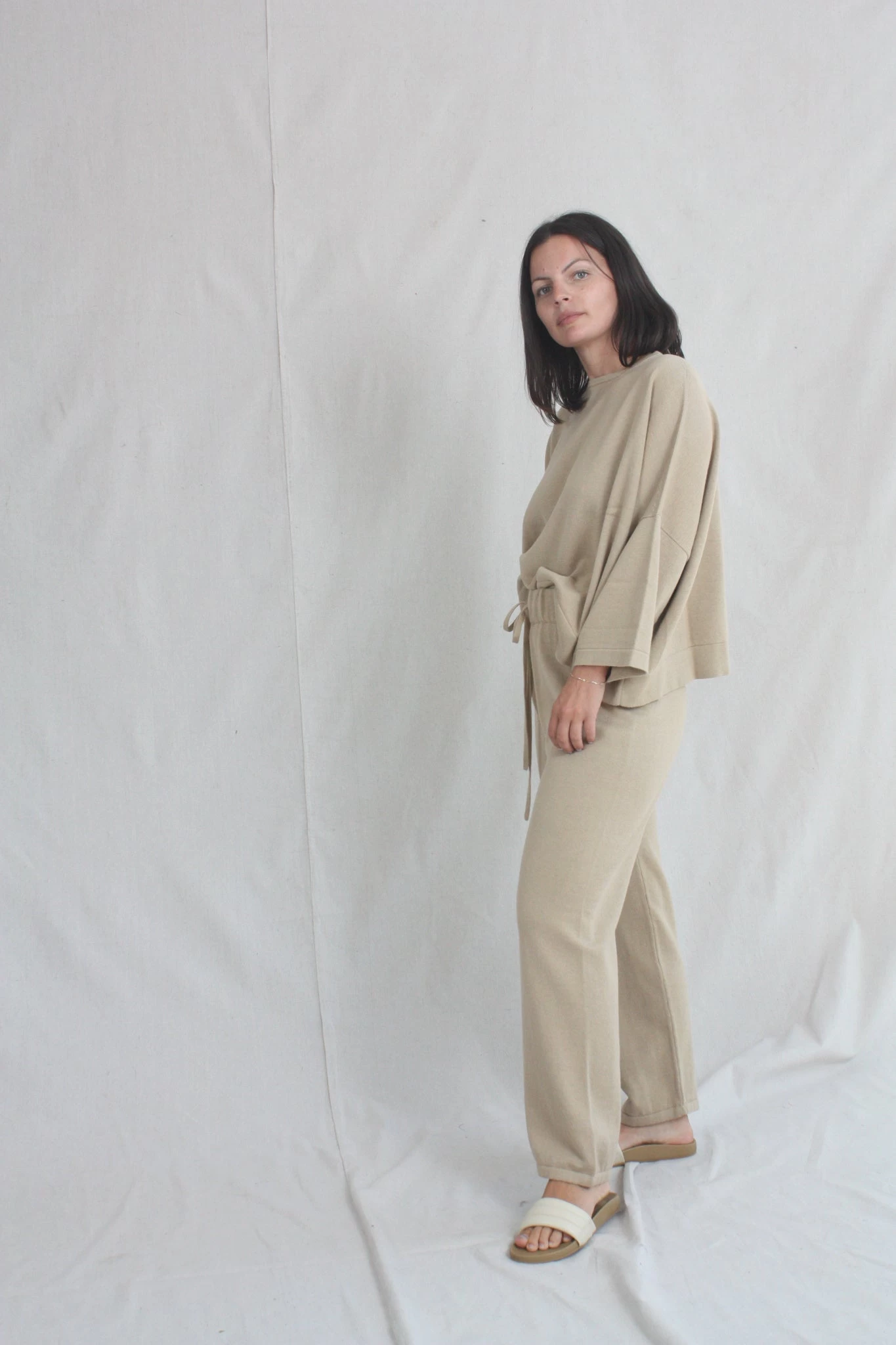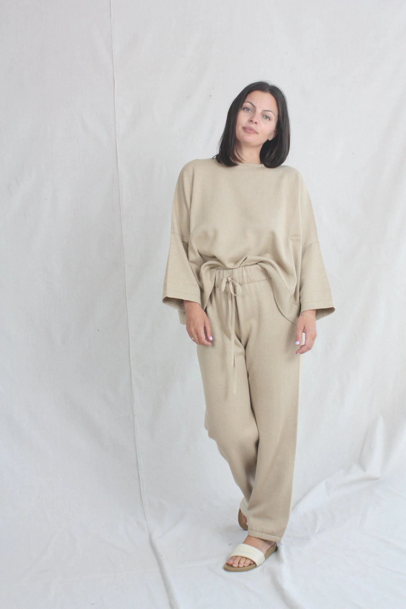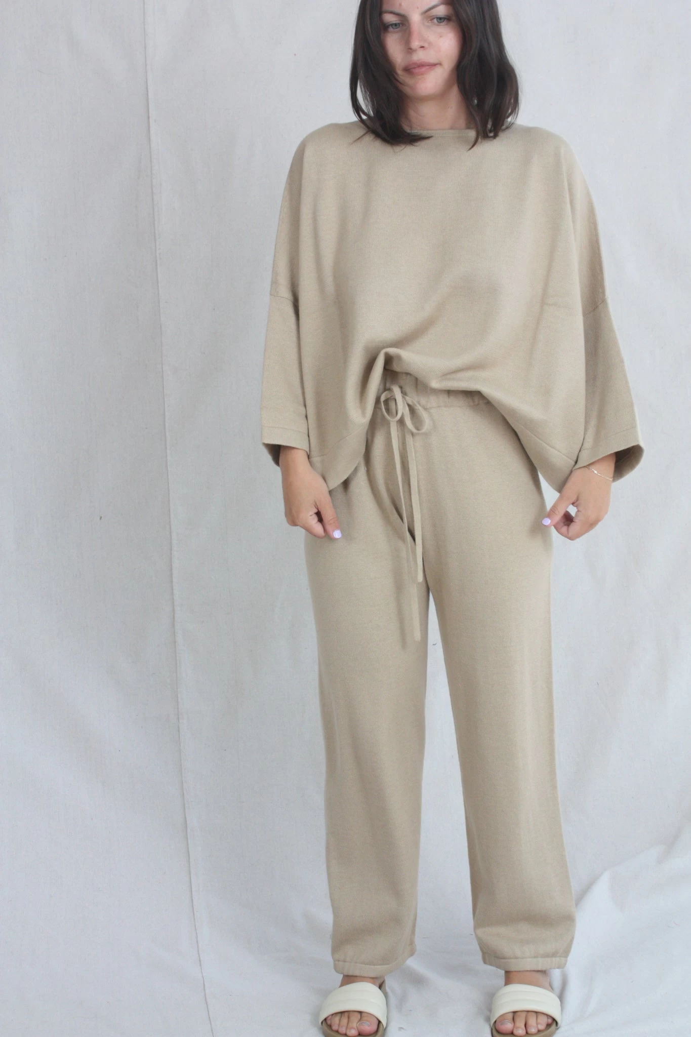 Relaxed pant in a mid gauge knit. Elastic waist with drawstring and elastic button cuff.