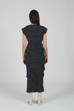 The New Delirium Dress is a long, gathered dress in our Solid Pucker fabric. Gathered seams run across the chest and side body creating a fitted column shape. The high neck and cap sleeves have a muted quality that provide counterpoint to the meandering seams. Back zipper closure. Slight stretch. Column shape