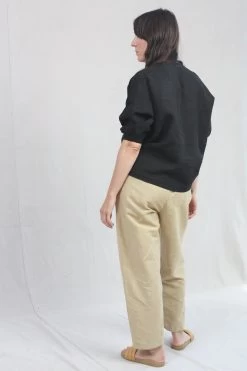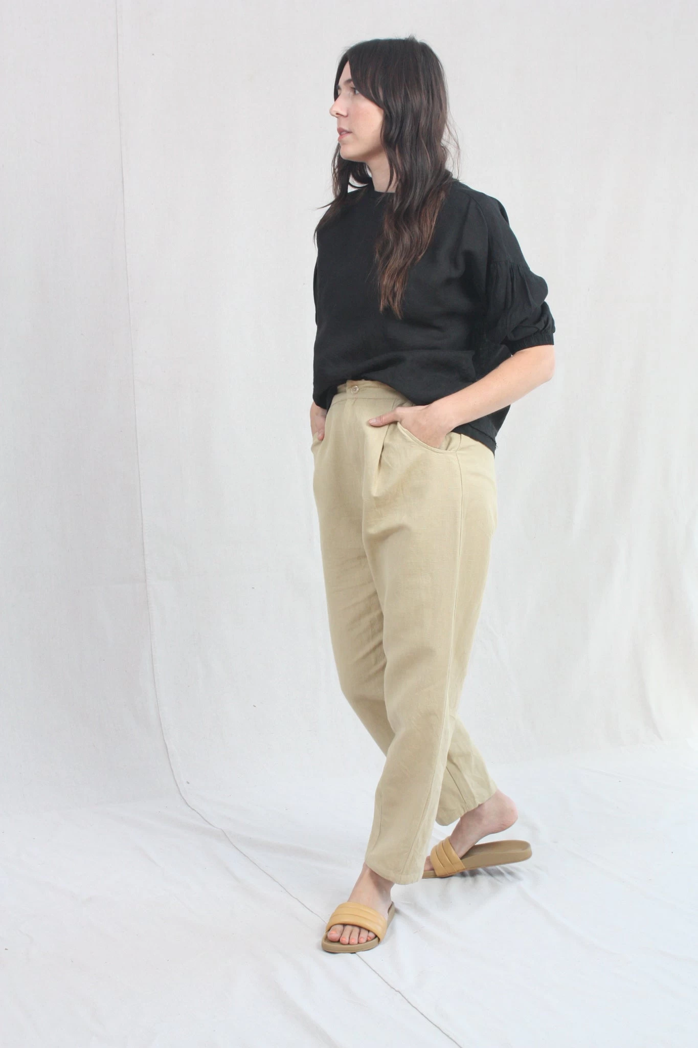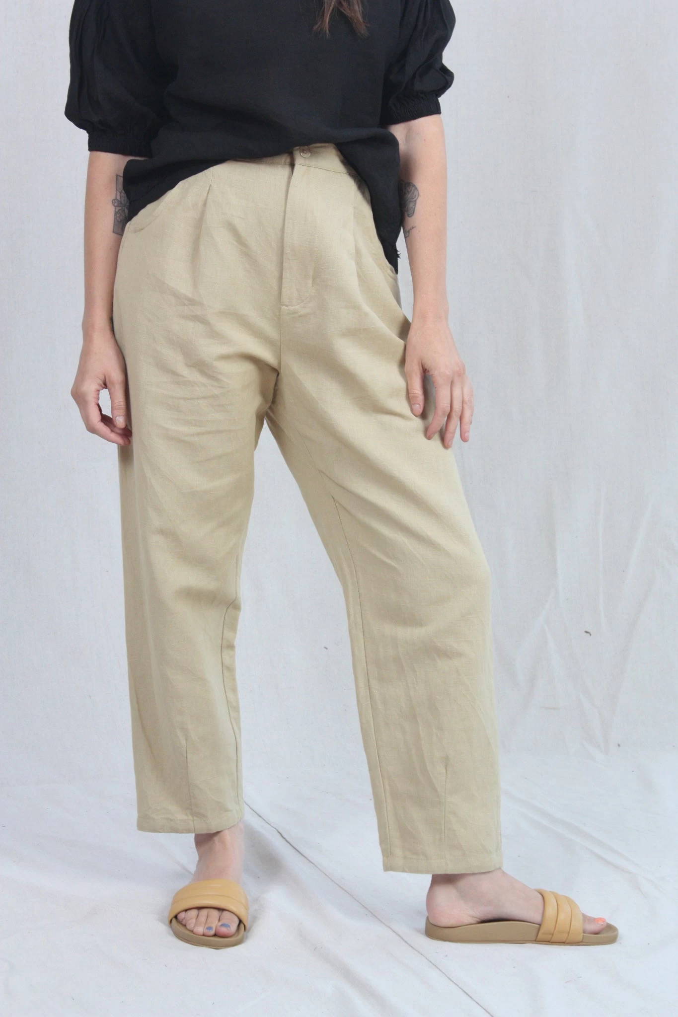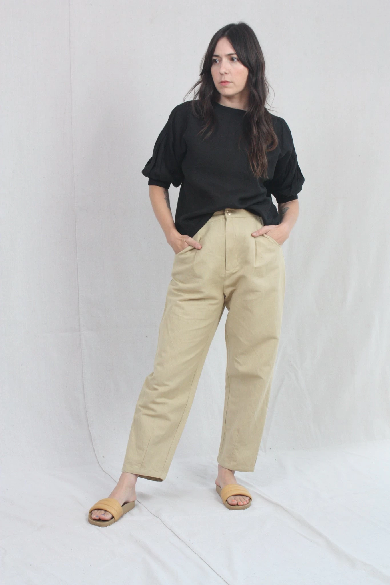 Easy, relaxed pant with pleat detail at front, rounded front pocket and one back pocket. Tapered leg with dart at bottom front, elastic at back waist.Â