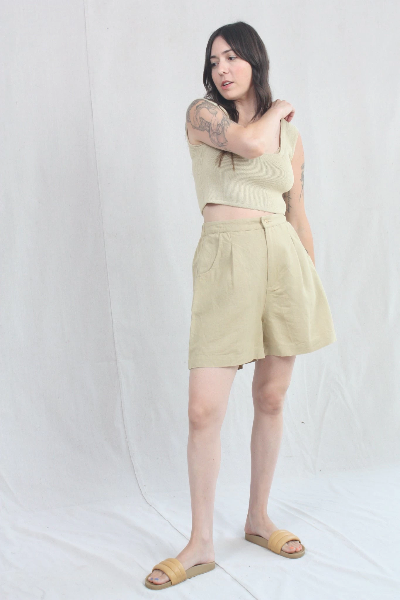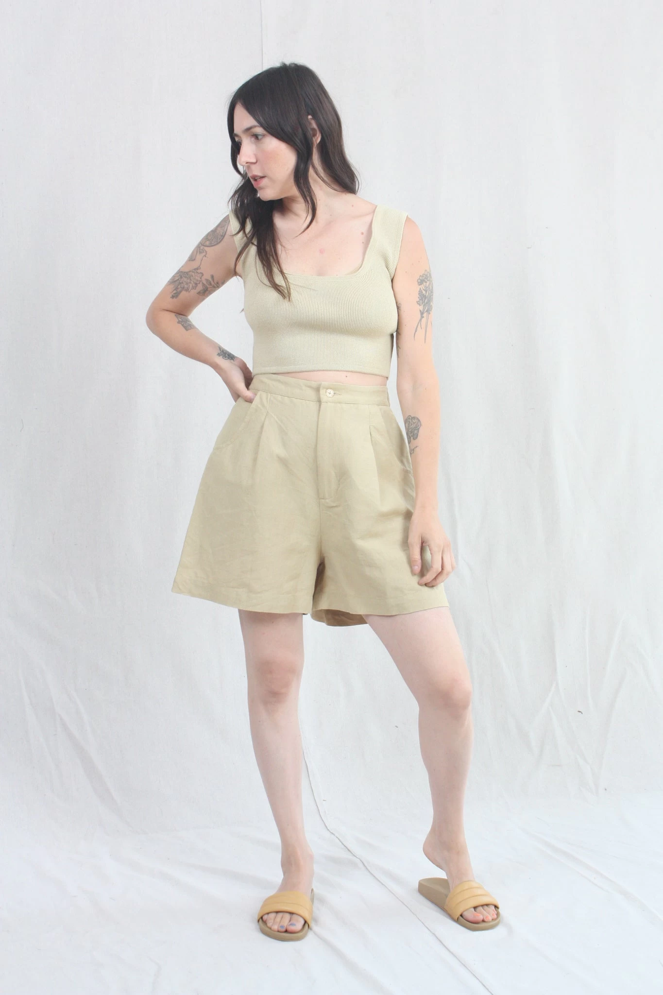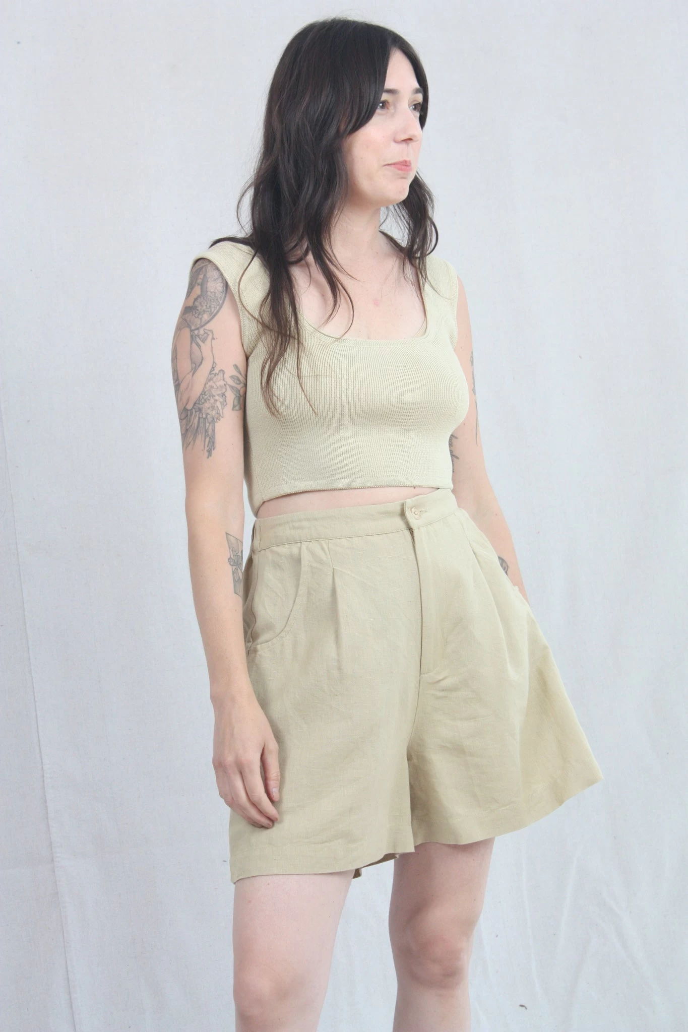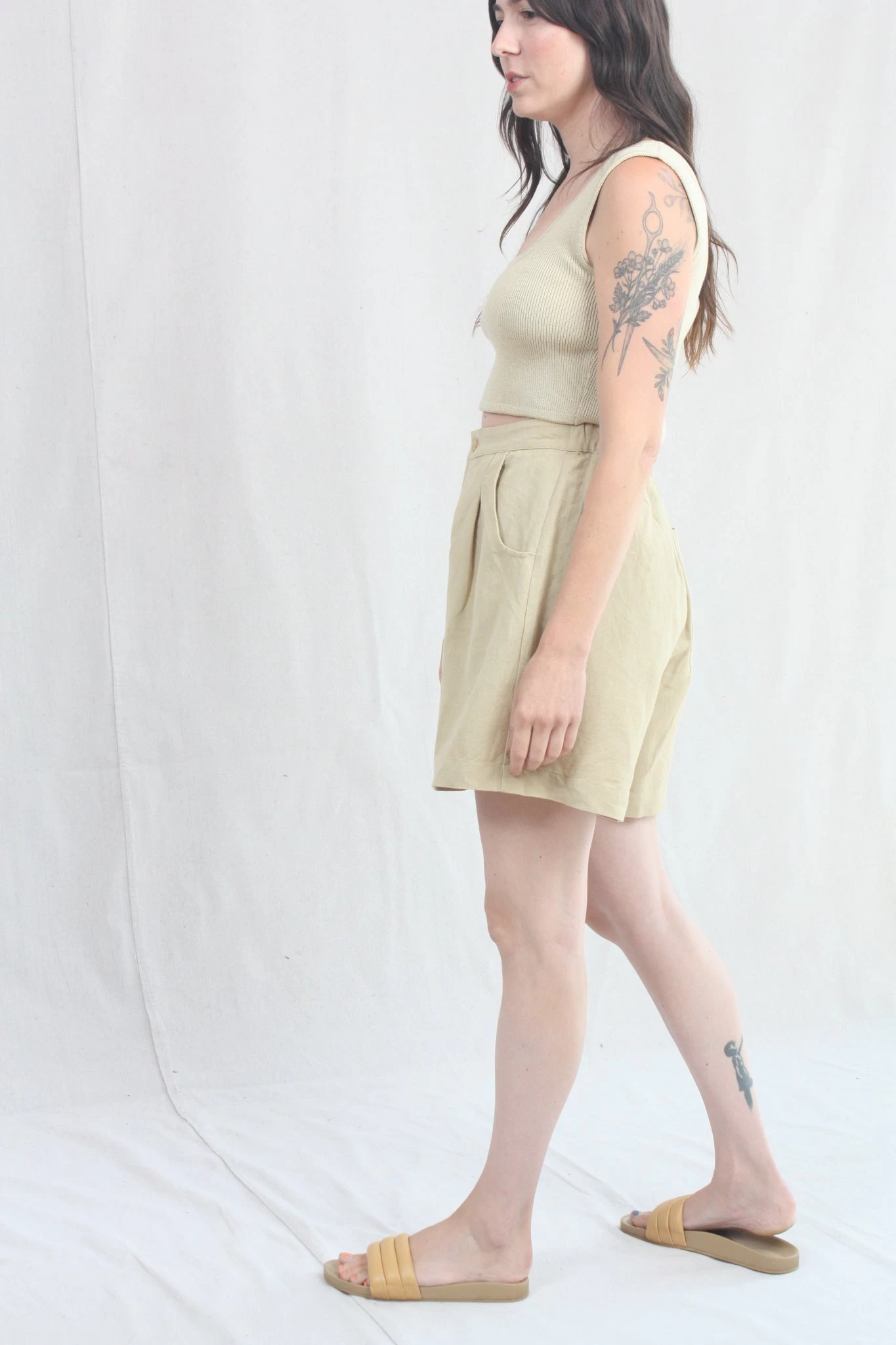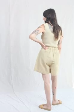 Easy, relaxed short with pleat detail at front, rounded front pocket and one back pocket. The pant has elastic at back waistband so the waist is adjustable.Â