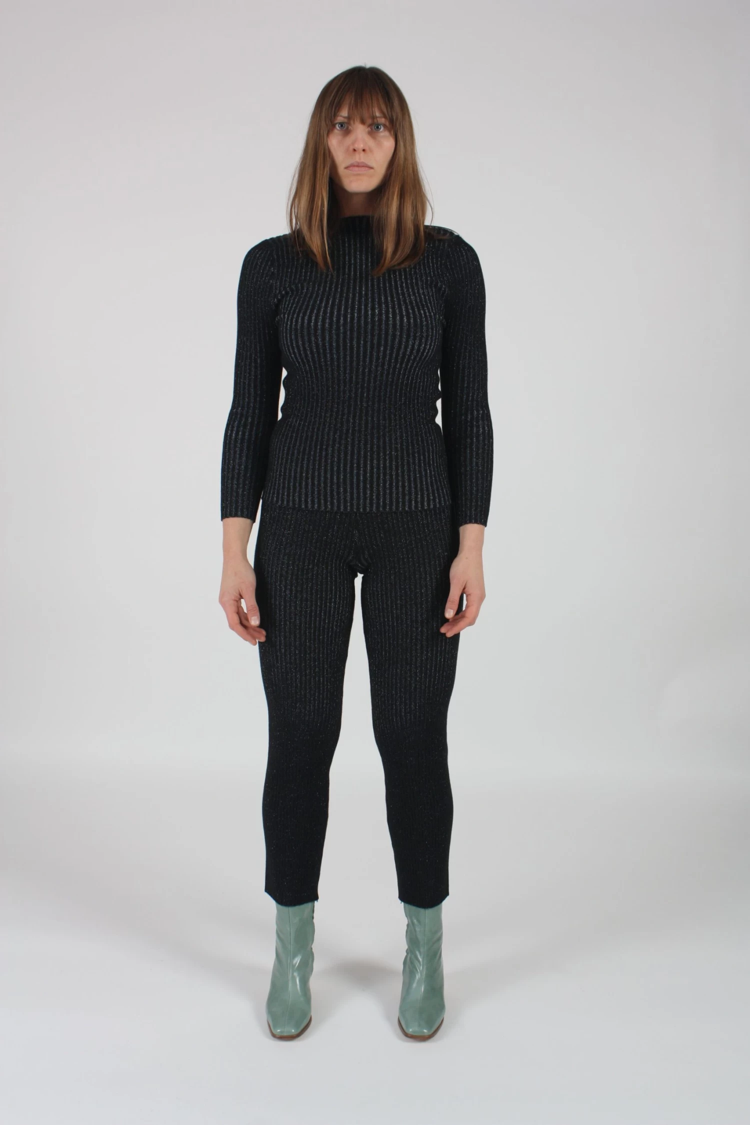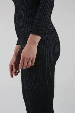 Shrunken ribbed layer pant with a straight-leg trouser fit and high-waist. Onyx and blue glitter.