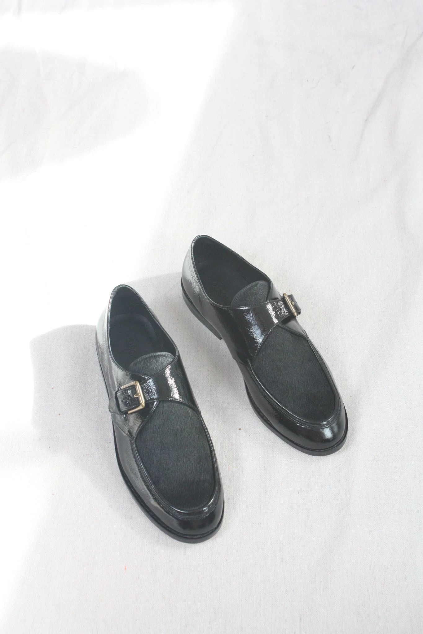 The Noor is an elevated take on a classic monk strap shoe. With a ¾” block heel and single adjustable closure, the Noor is made in black patent leather with a pony hair upper. Makes for an excellent addition to any outfit and can be dressed up or down. Fits true to size.