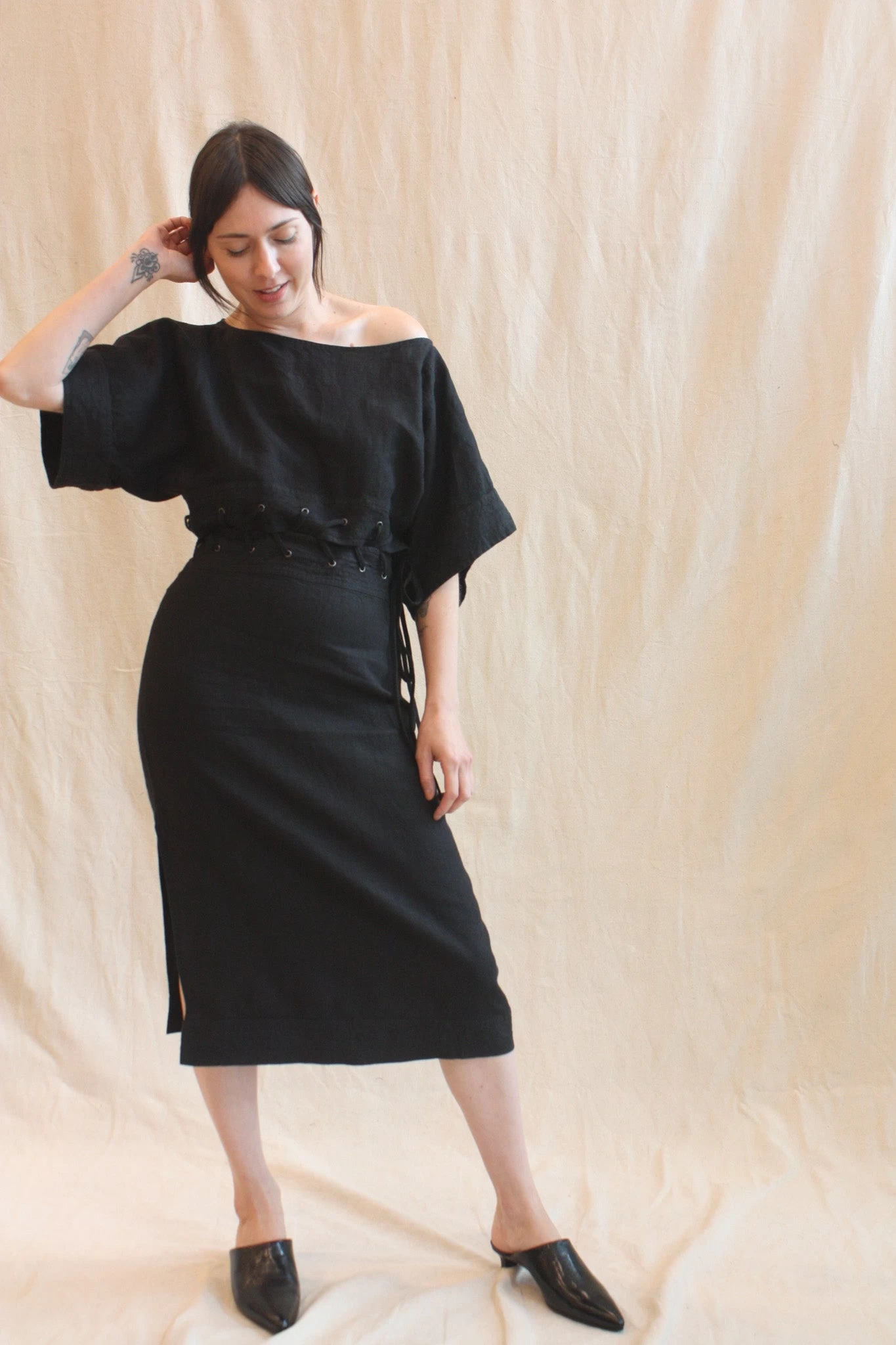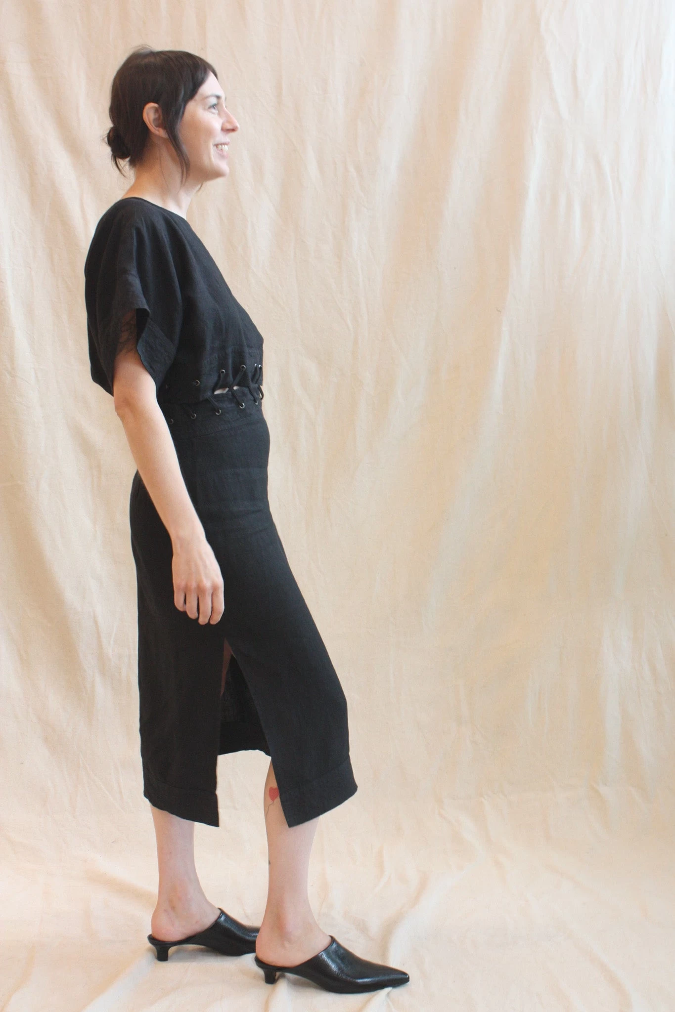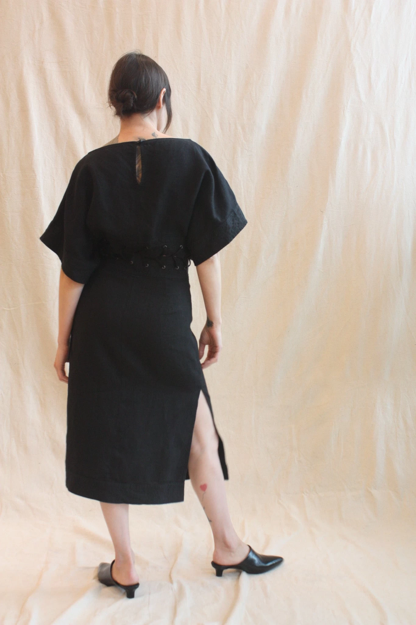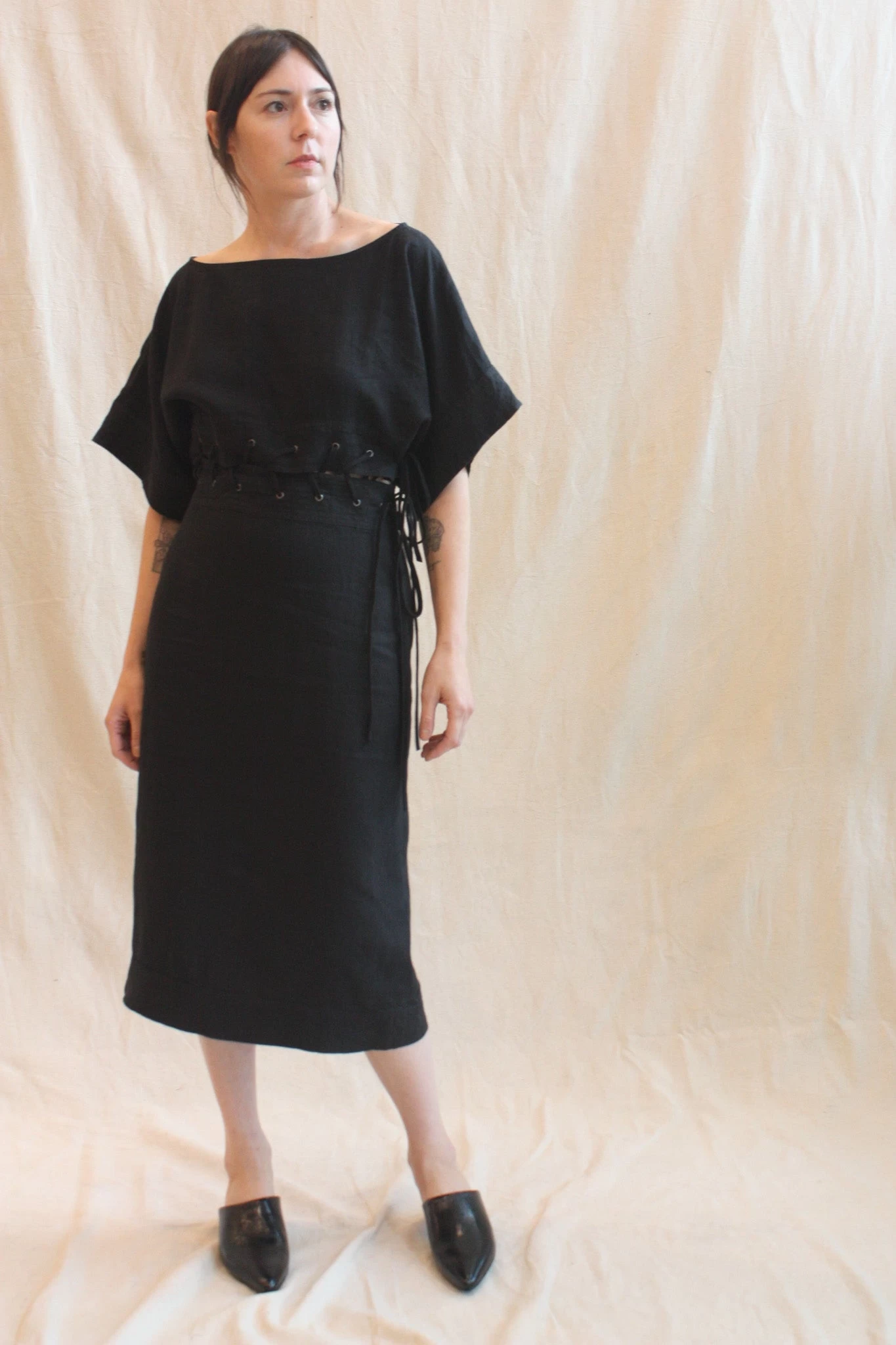 Boatneck dolman-sleeve dress with a pencil skirt in heavyweight linen, featuring peekabo lacing at the waist. This style sits off the body at the top and is a touch more fitted through the hip, with a side slit for ease of movement. Keyhole and button detail at back of neck. Invisible side zipper at skirt.