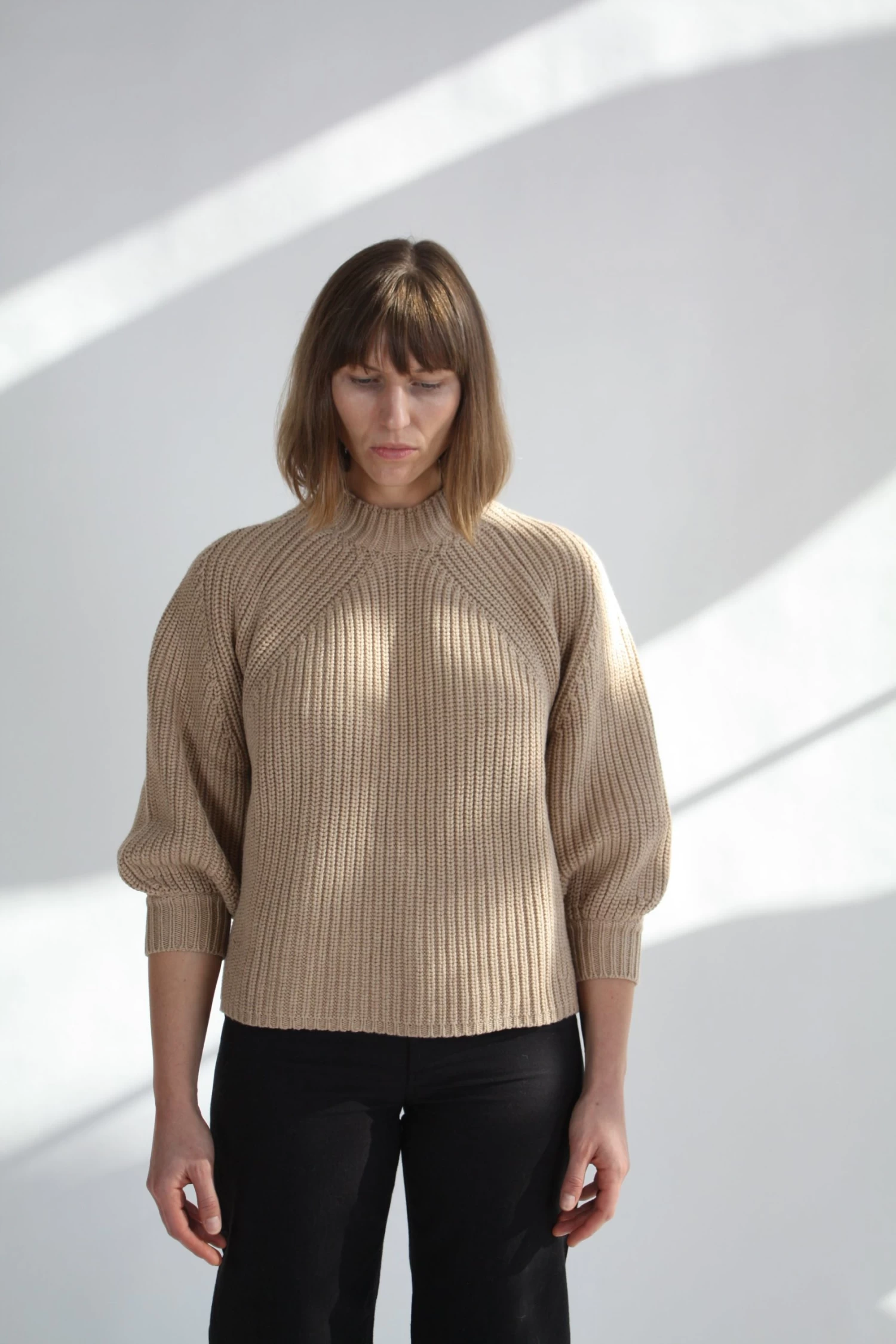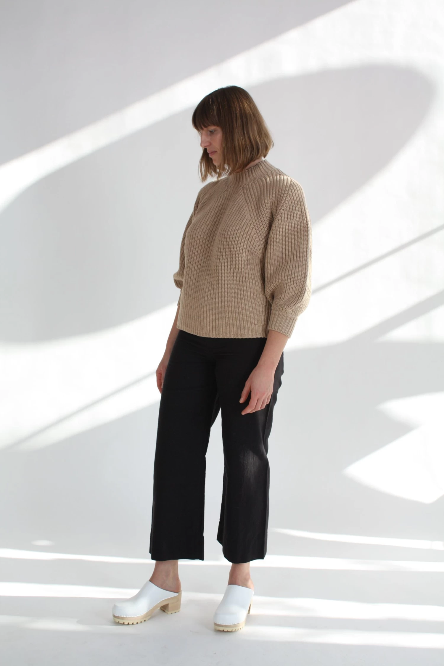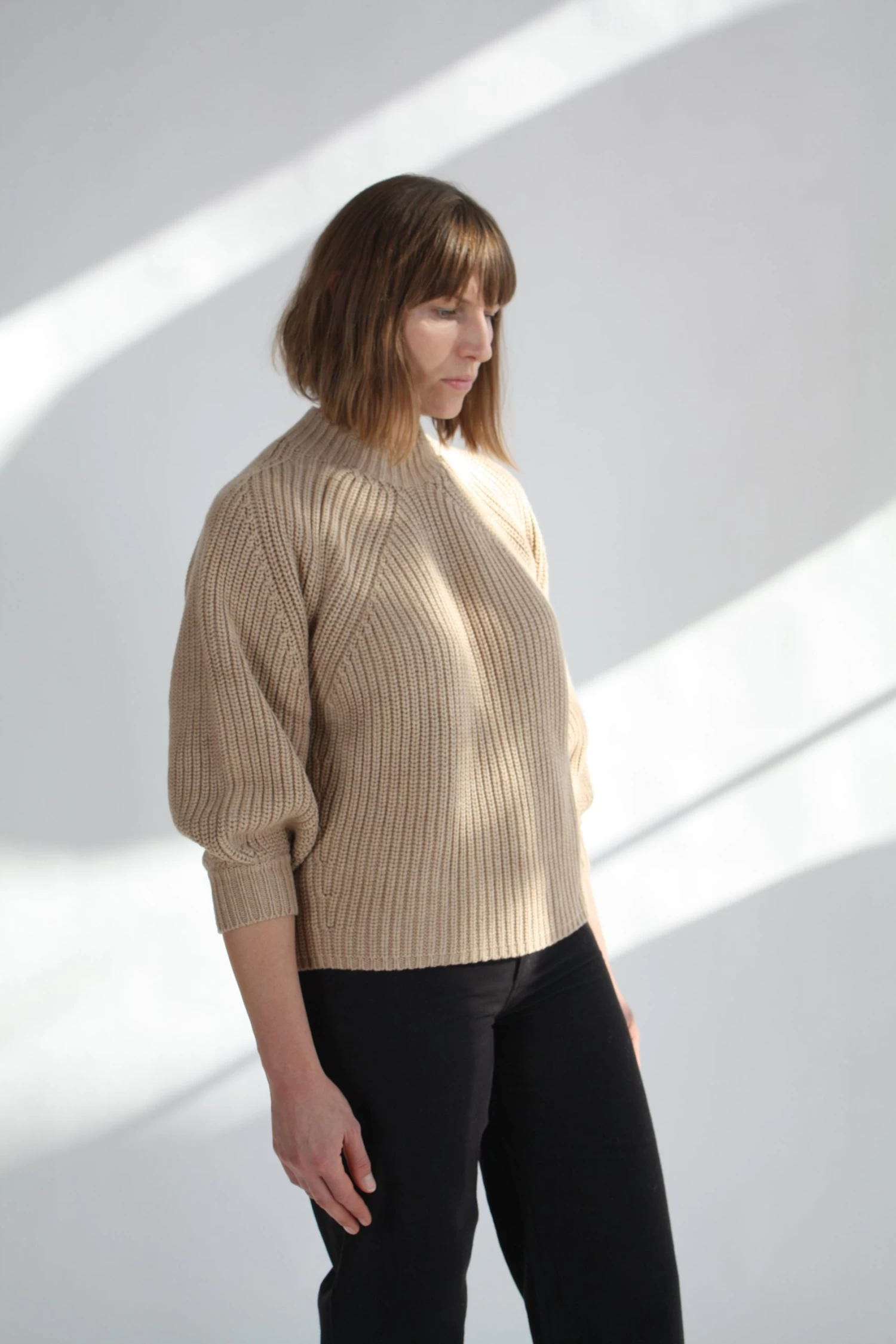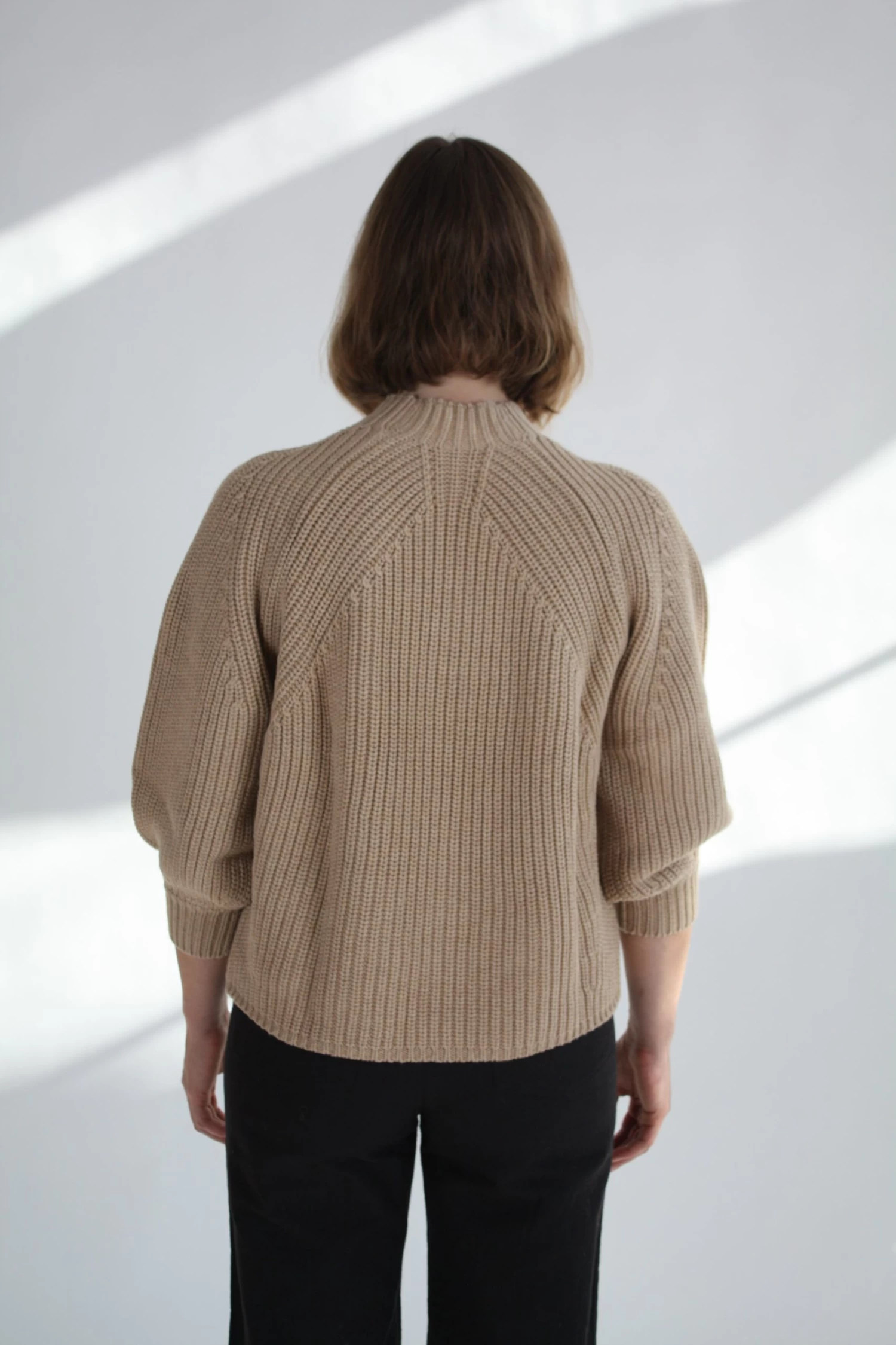 Minimal silhouette with a relaxed and cool fit. Ribbed throughout in a soft cotton-cashmere blend. Cropped length with slight puff sleeve that pushes just past the elbow.