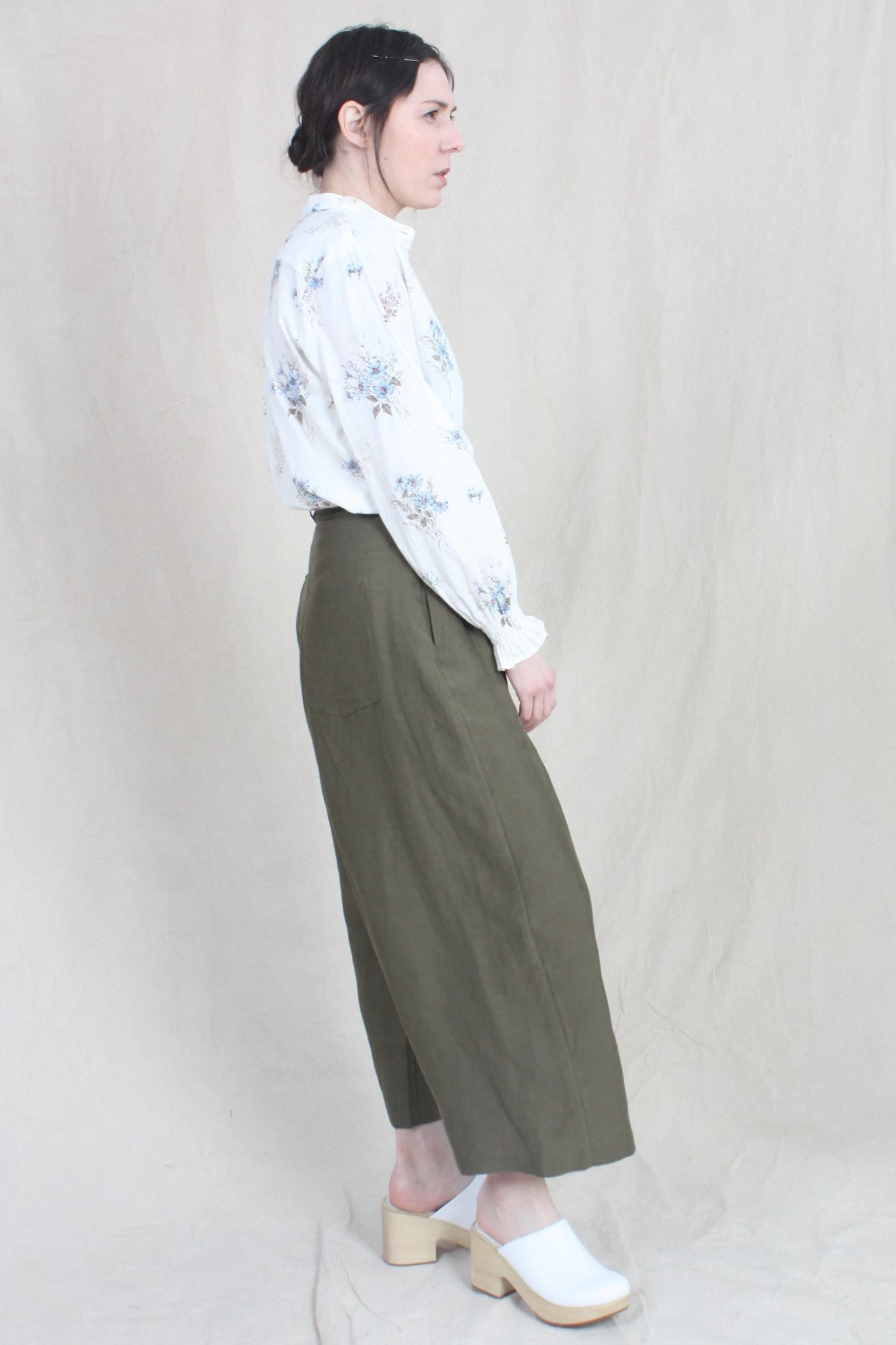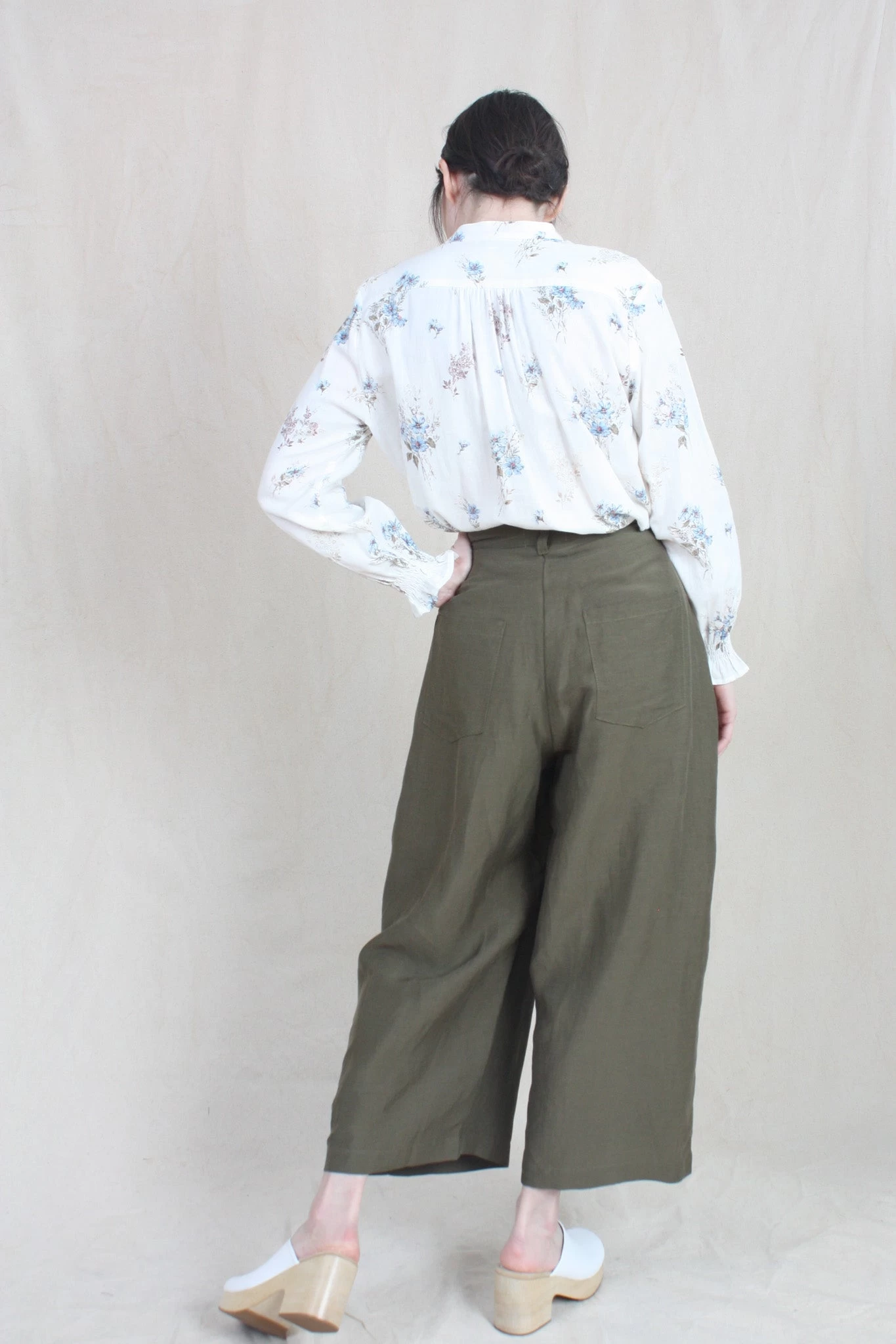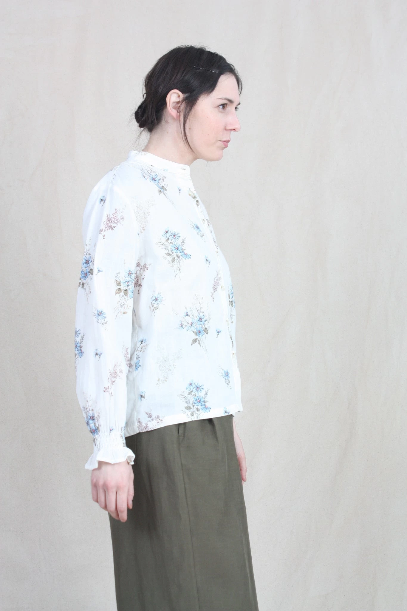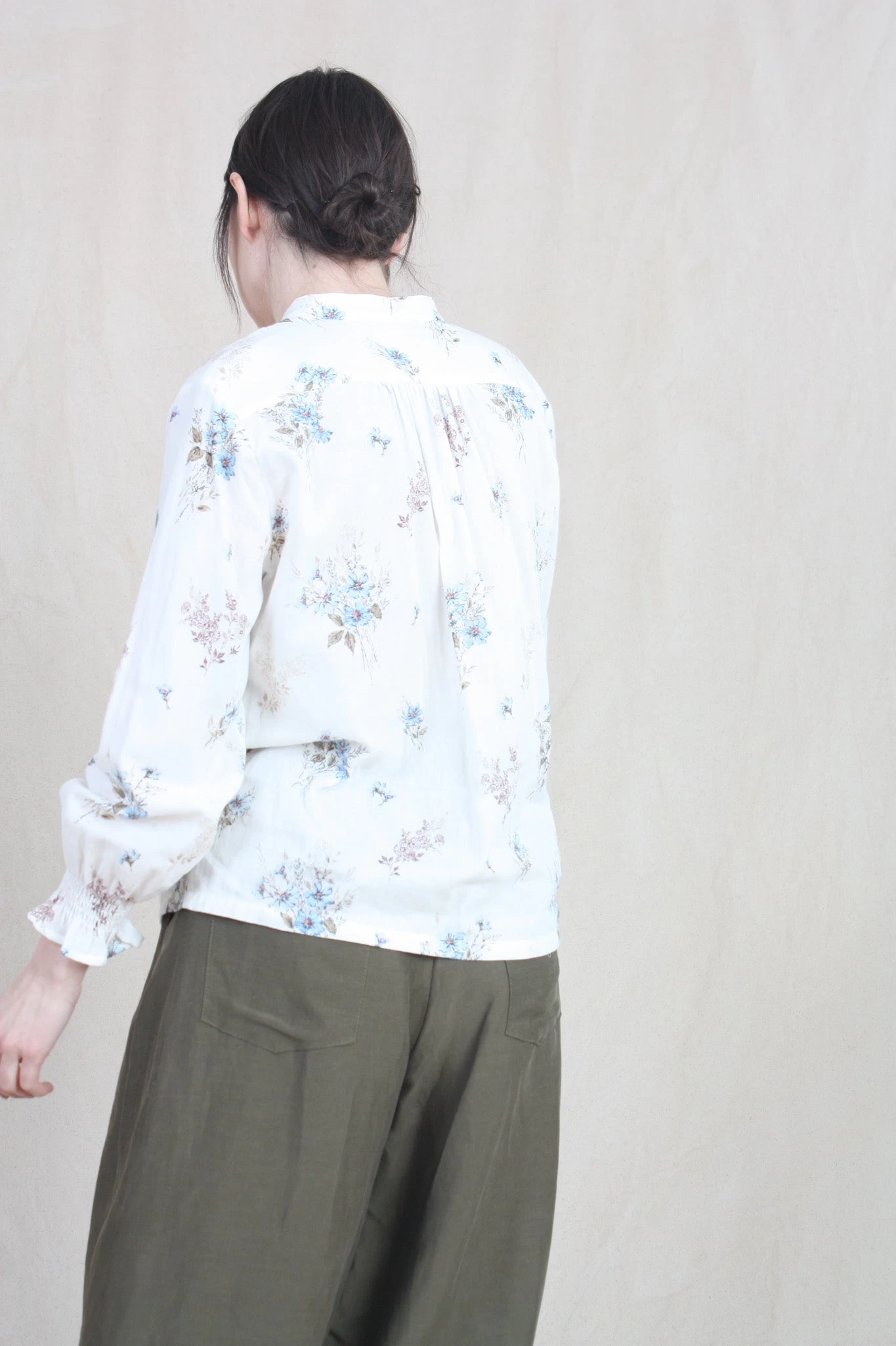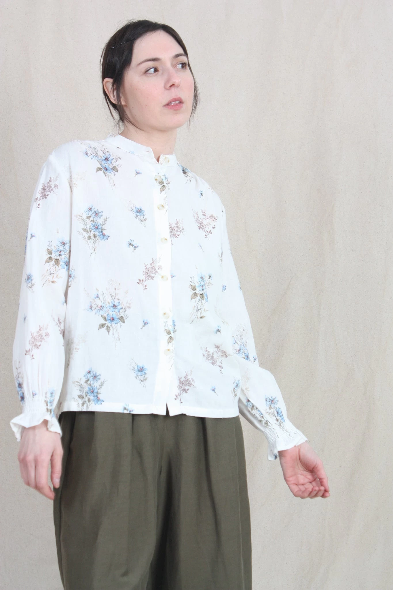 Long sleeve shirt with collarless neckline and button down closure. Finished with shirred cuff detail and gathers on shoulder.