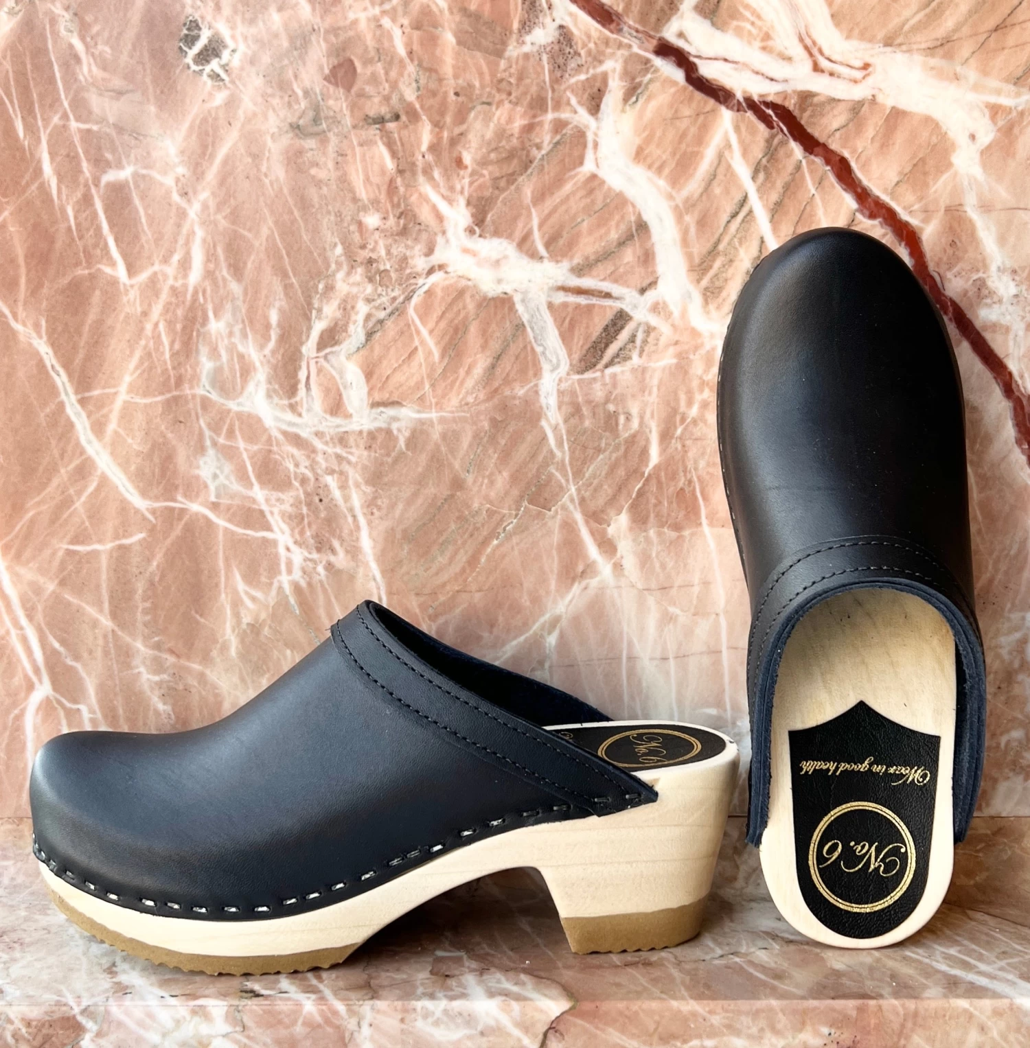 No.6’s bestselling clog style on a mid heel base. Indigo leather upper. Stitched collar, rounded toe, and open back. Lacquered, lightweight wooden base. Unlined.