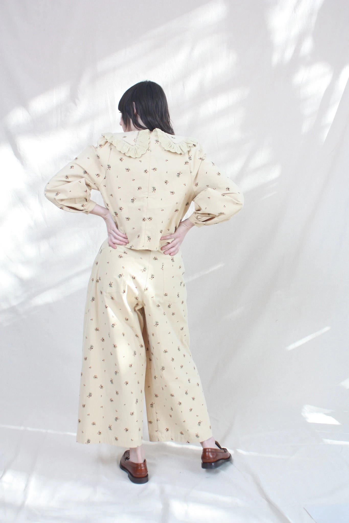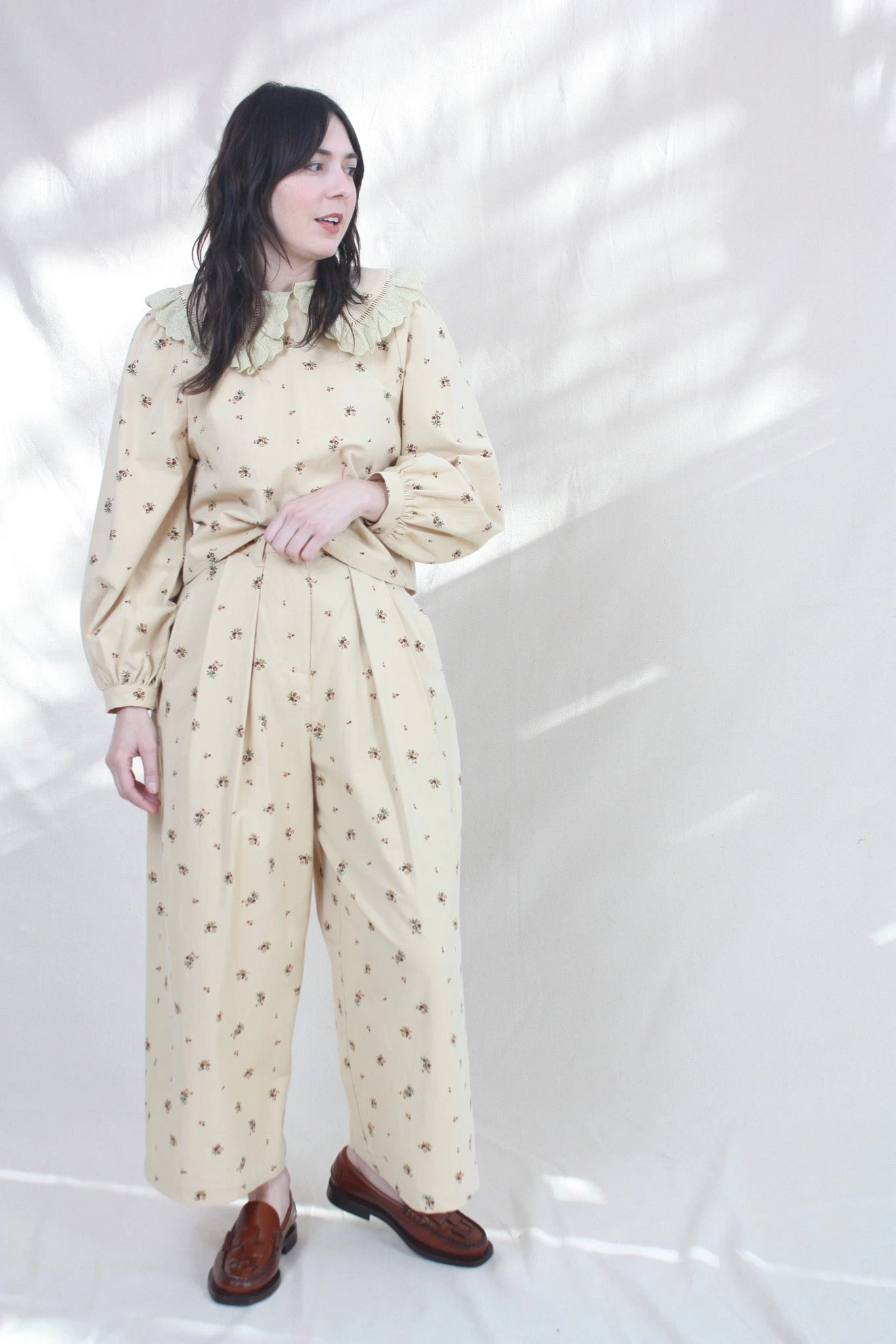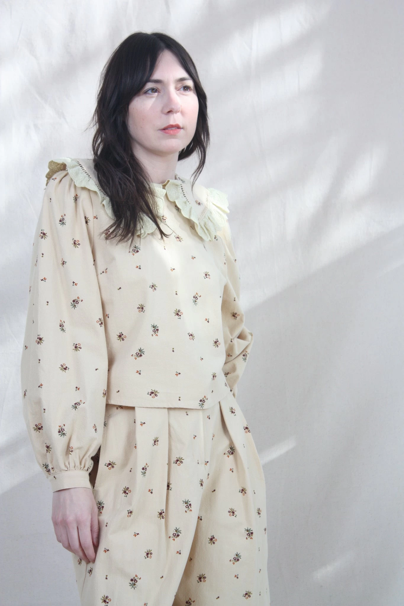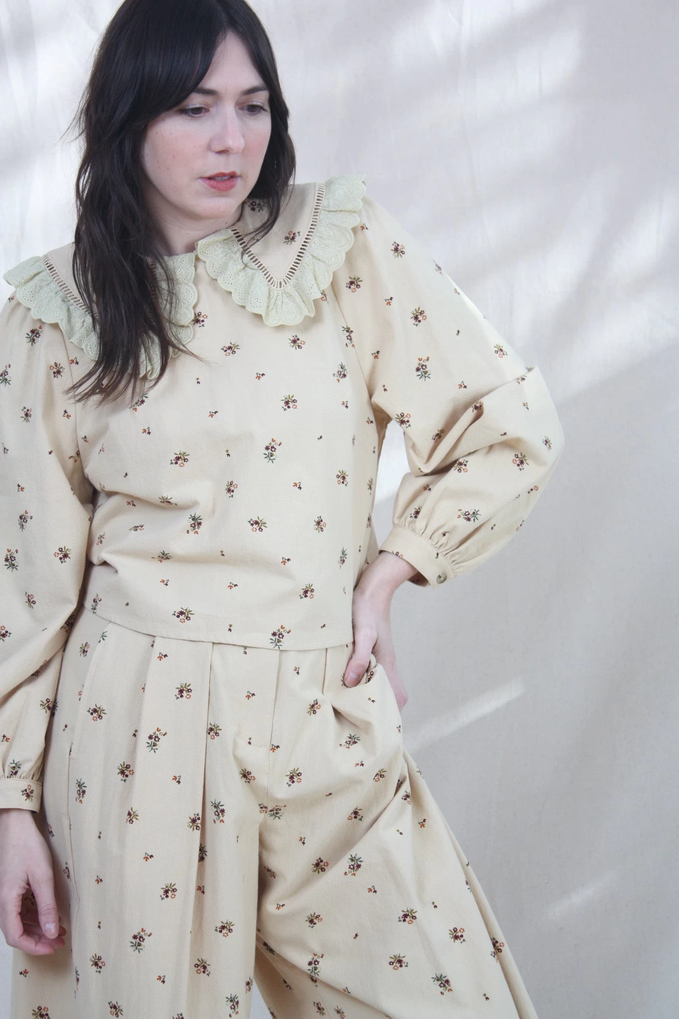 Straight cut slightly cropped shirt with a large frilled collar. Long sleeves and gathered shoulders and cuffs in Meadows’ limited edition Autumn Posy print.