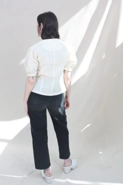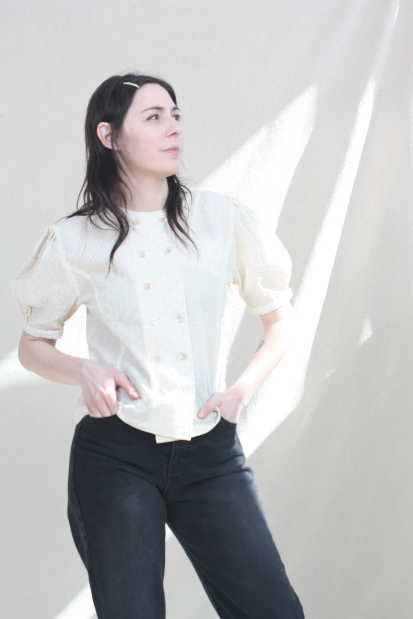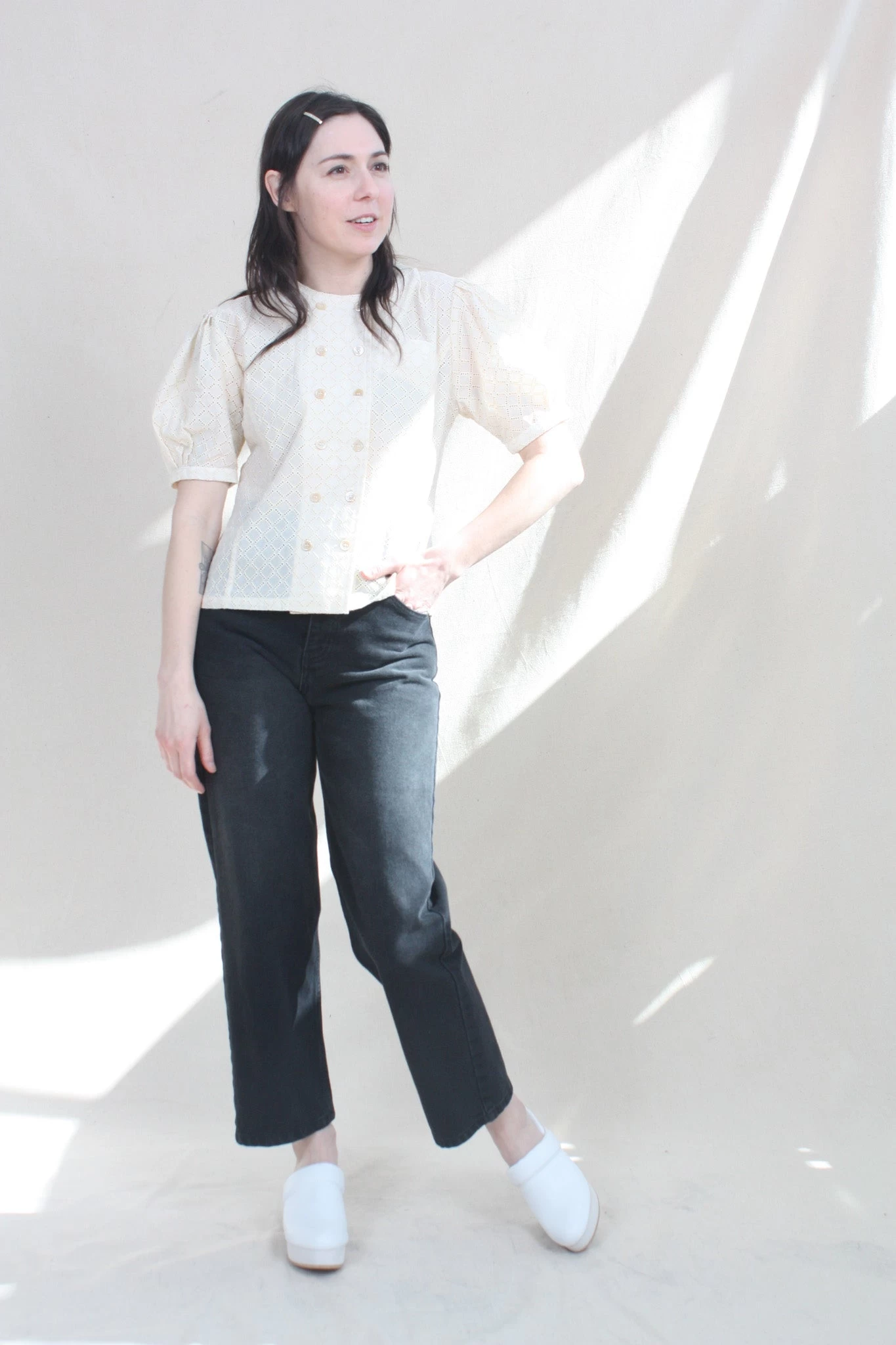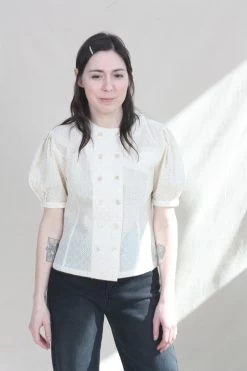 The Olga Shirt is a double-breasted short sleeve blouse with a slightly puffed sleeve and princess seaming through the bodice. Features a coin pocket at the chest and a rounded neckline. Unlined.