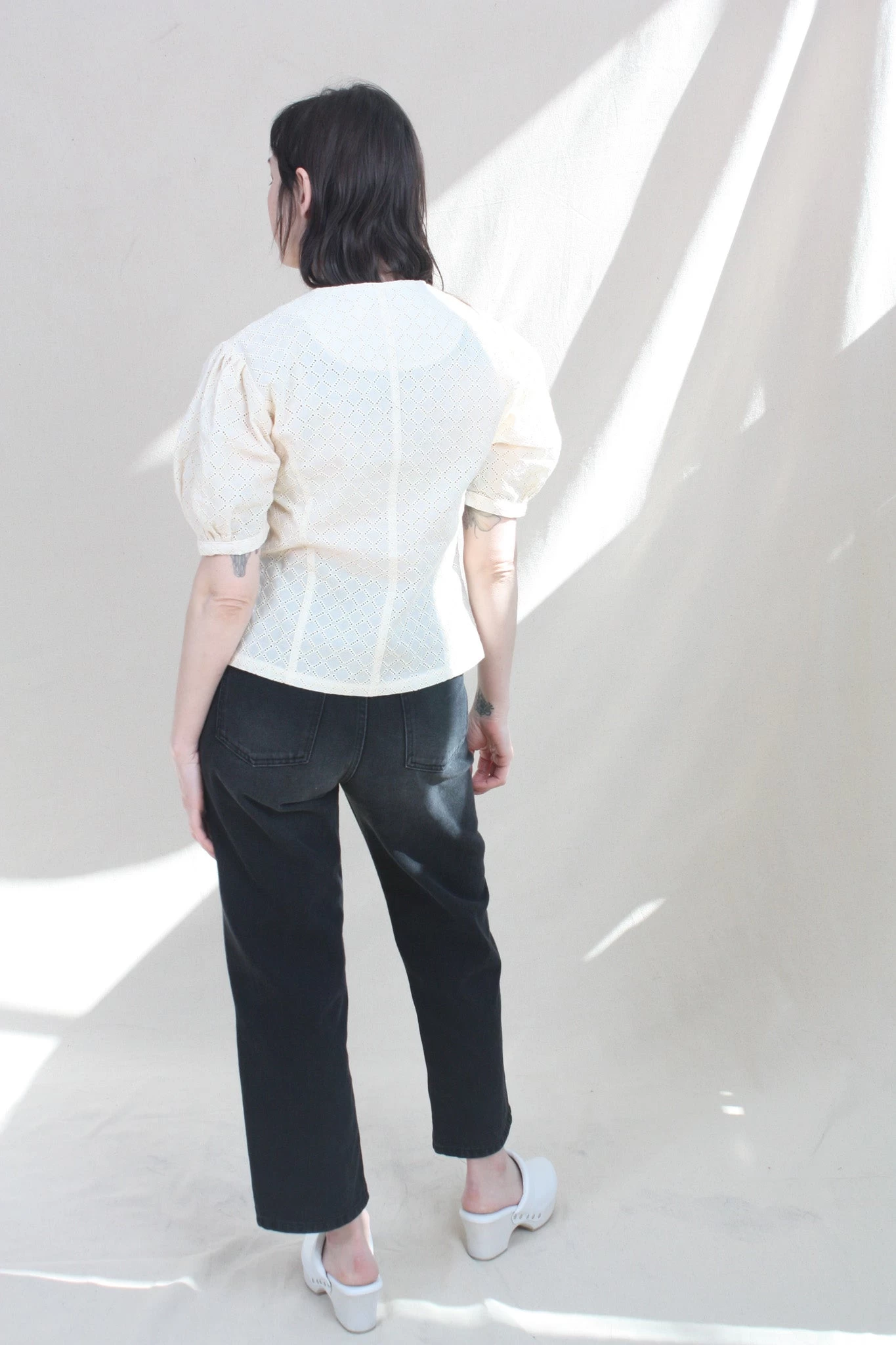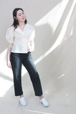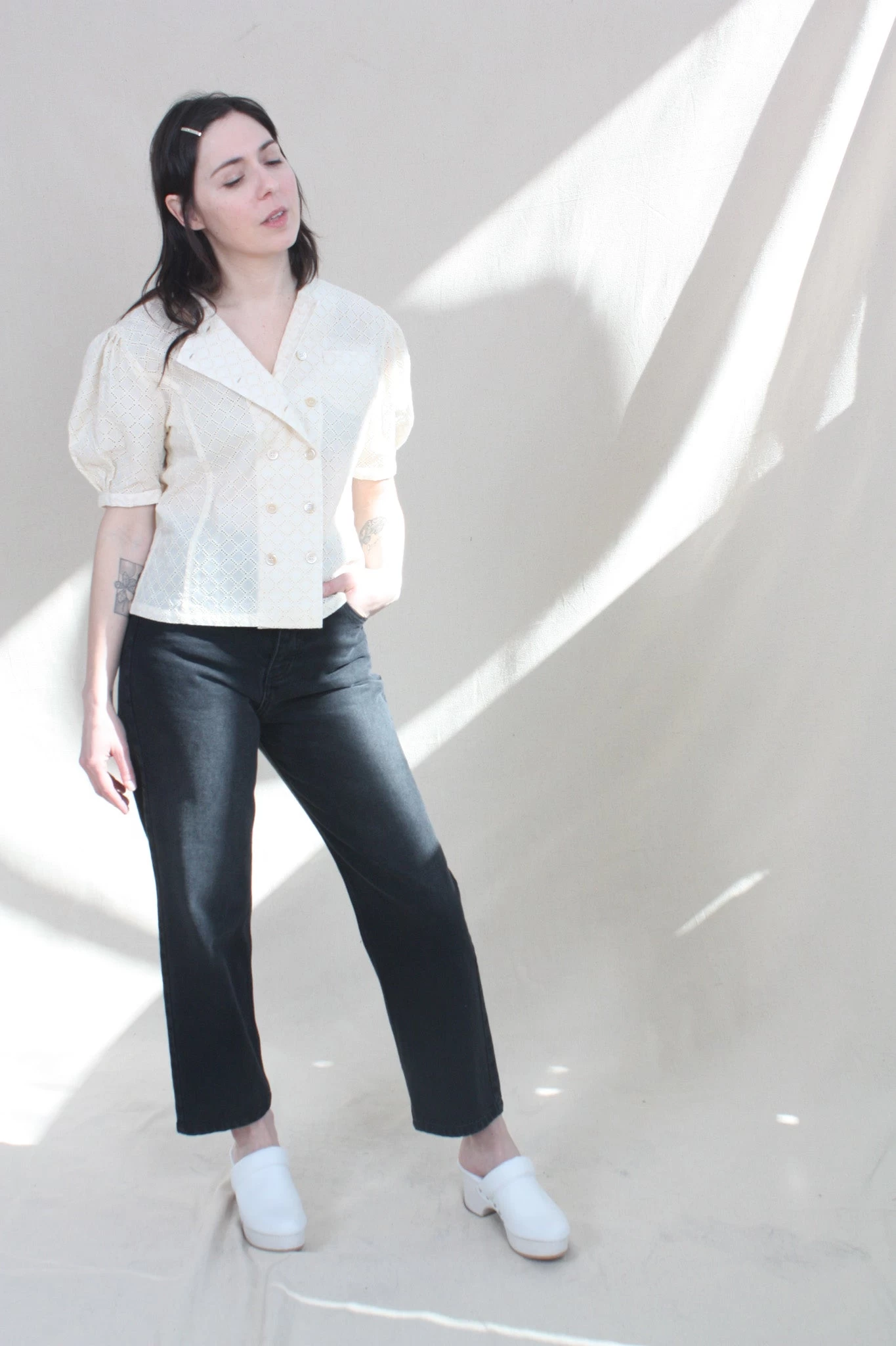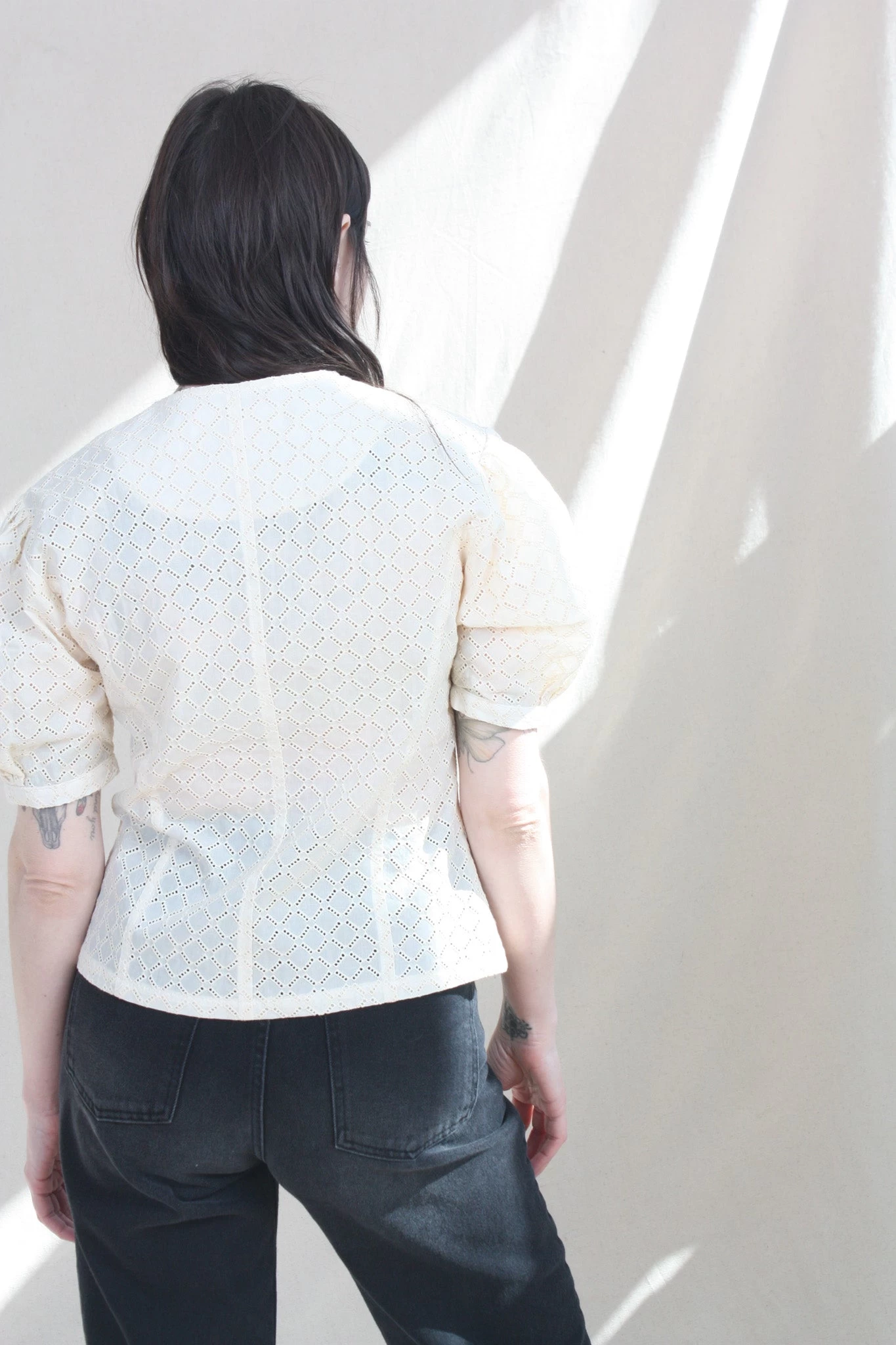 The Olga Shirt is a double-breasted short sleeve blouse with a slightly puffed sleeve and princess seaming through the bodice. Features a coin pocket at the chest and a rounded neckline. Unlined.