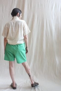 The Olivia Short is a simple short with an elastic waist, button front closure, and a straight leg. Features a single back flap packet for added detail.