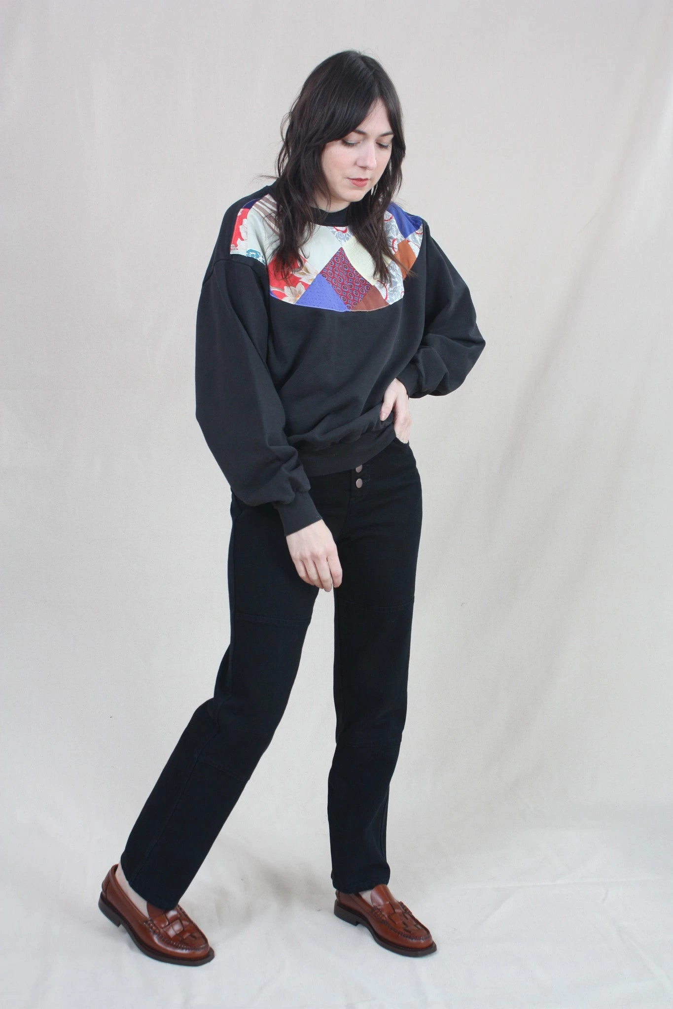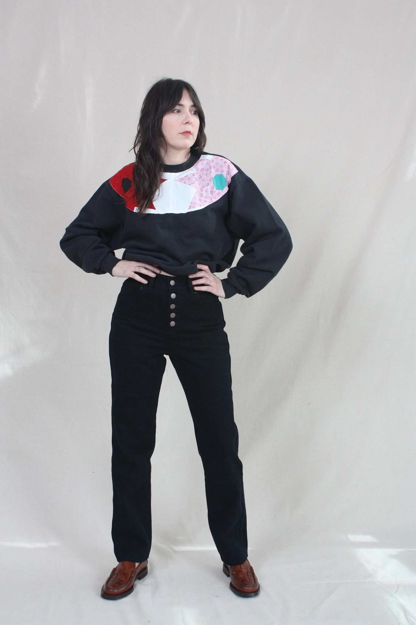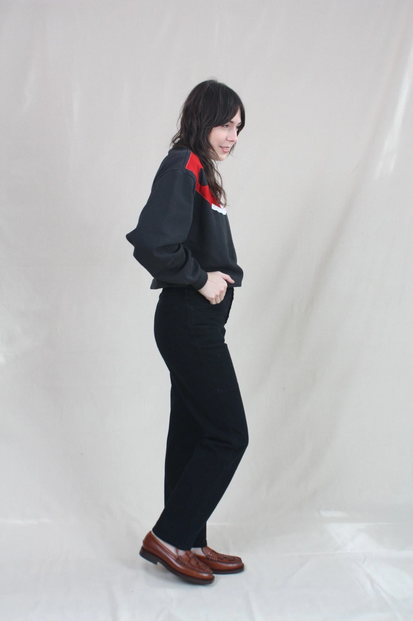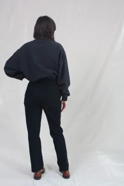 A returning classic! Straight-leg, high-rise jean fit. Based on the fit of Carleen’s two-tone jeans, but translated into a monochrome design, keeping the seaming and adding exposed antique copper buttons at the fly. Constructed of 100% cotton denim and have been pre-washed to soften the stiffness of the raw denim (but they’ll only get better the more you wear them). This season’s Midnight color is a black overdye with subtle dark blue tones in the stitching.