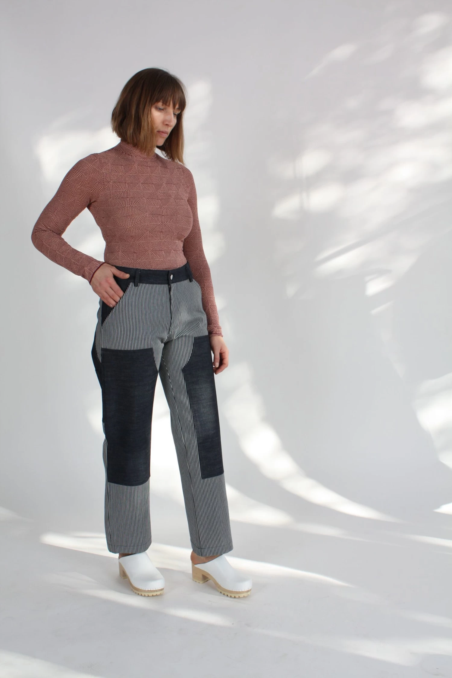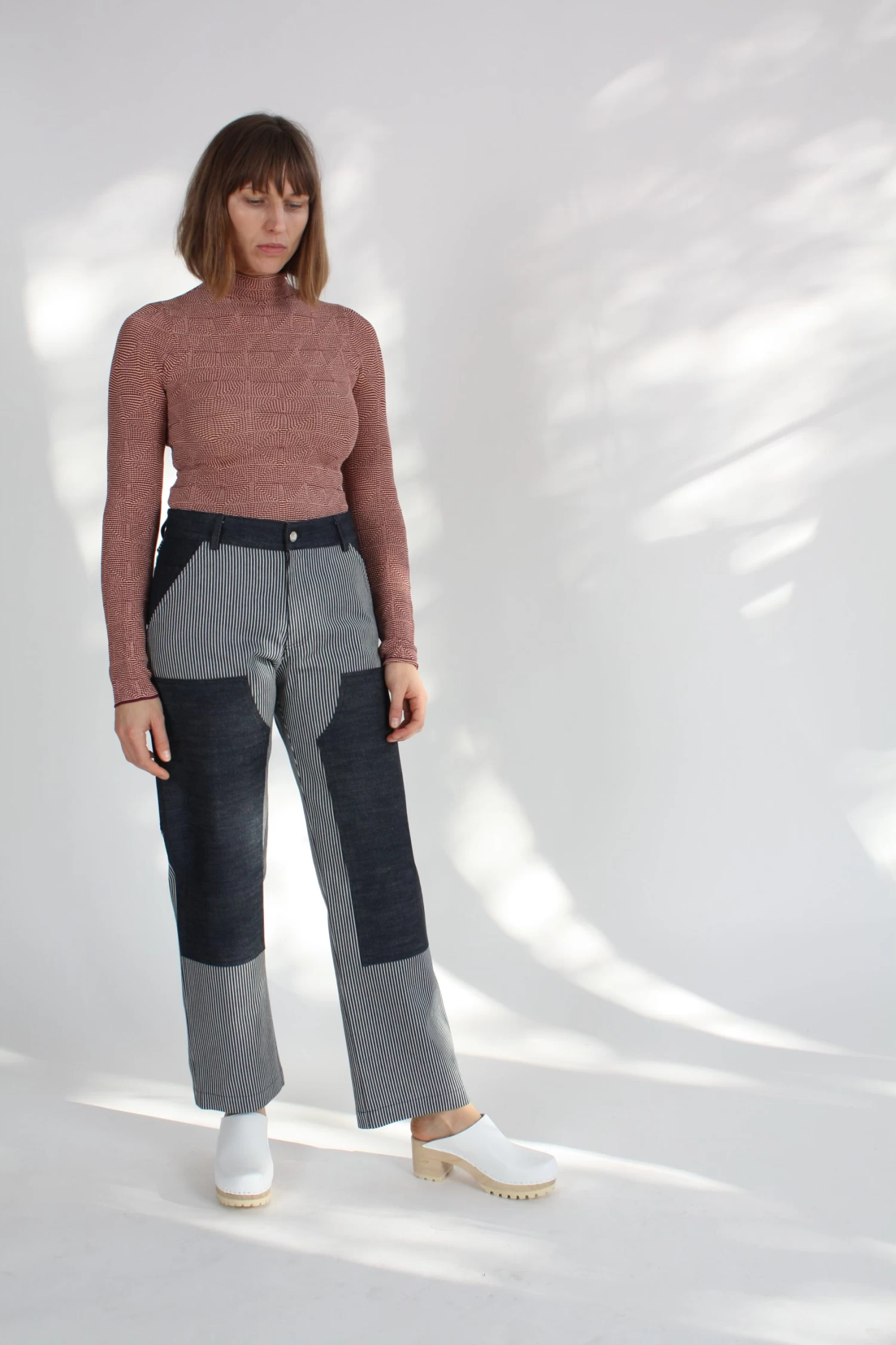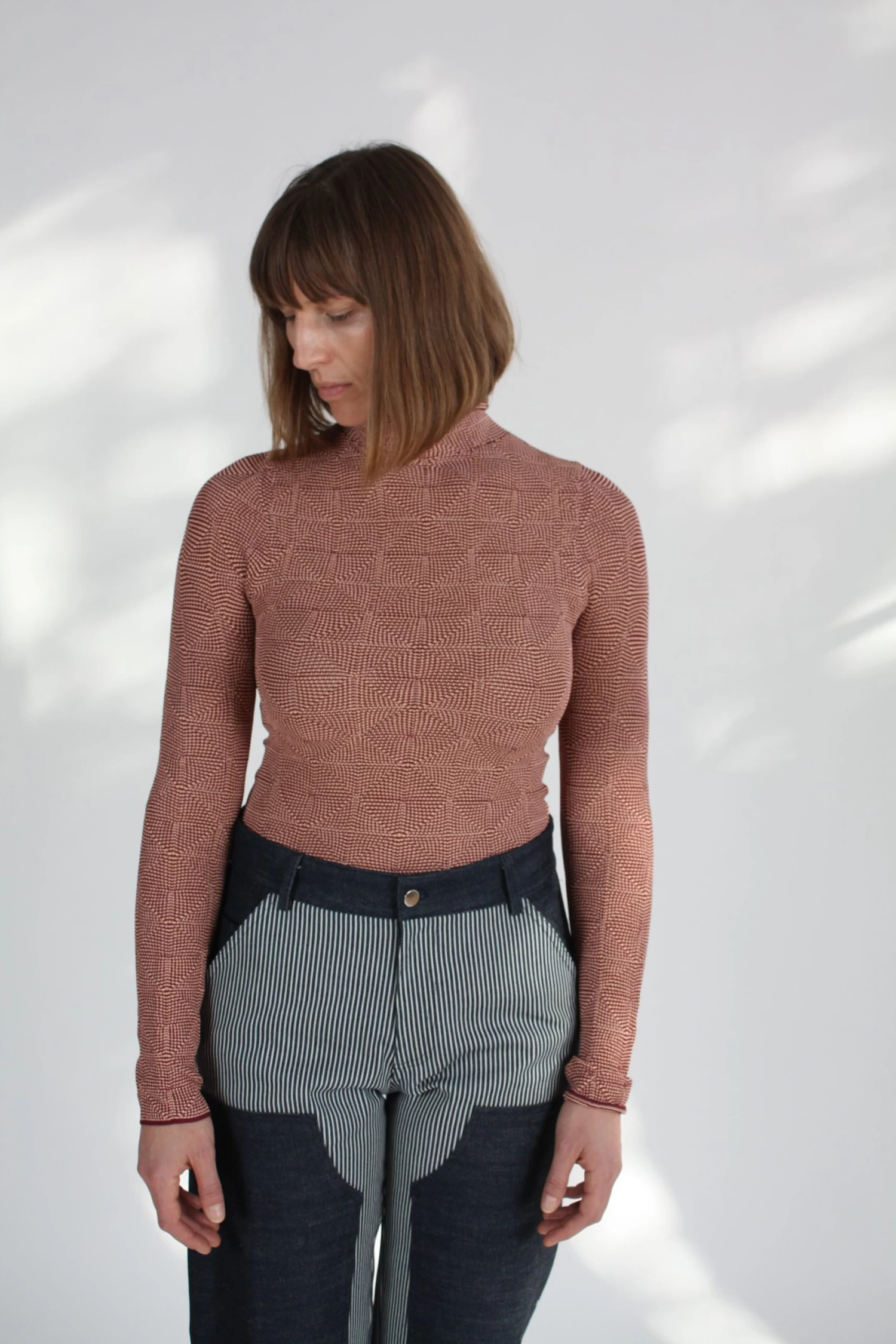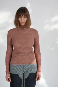 Long sleeve slim-fitting mockneck sweater in burgundy and tangerine “optical” knit.