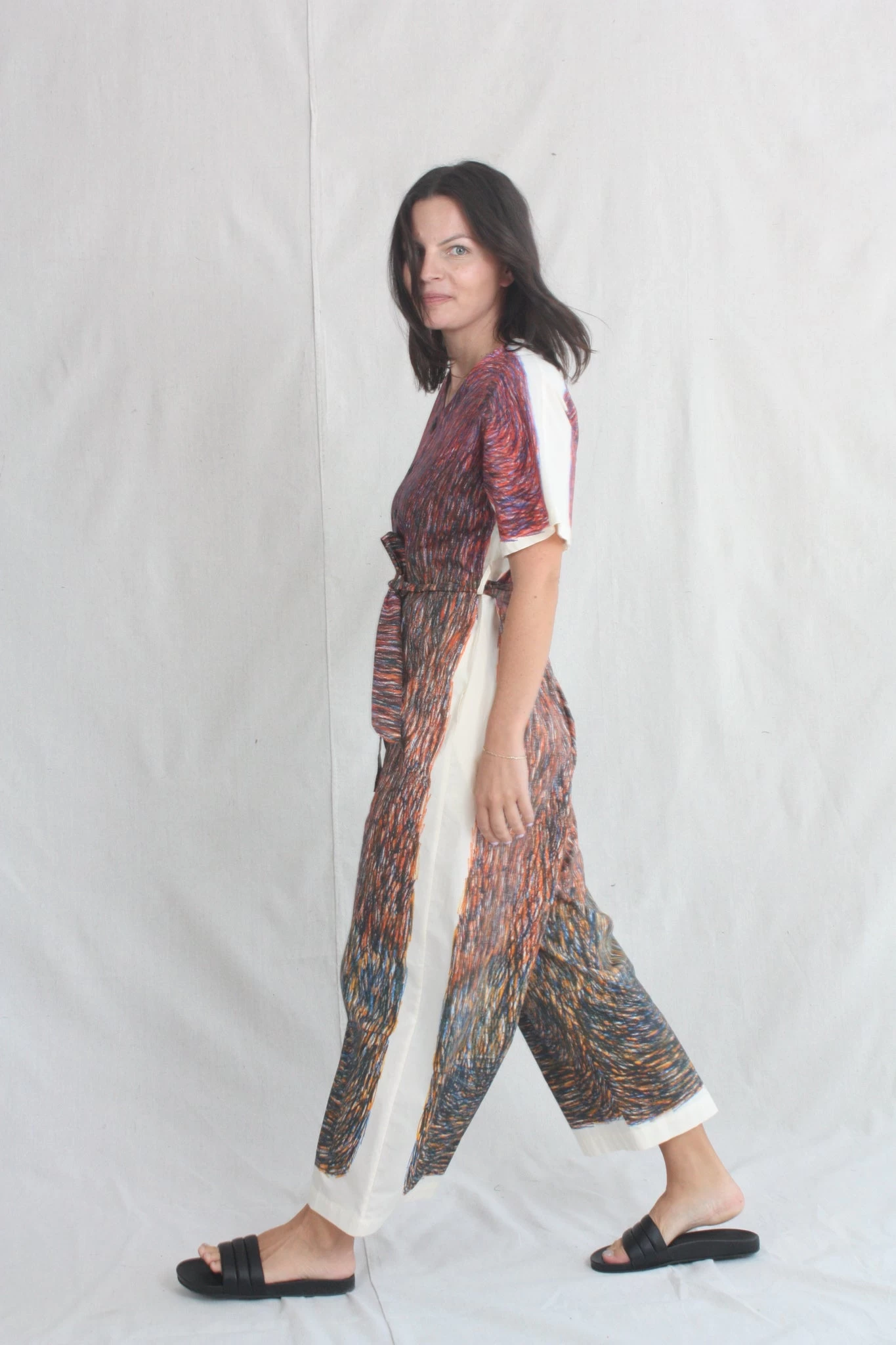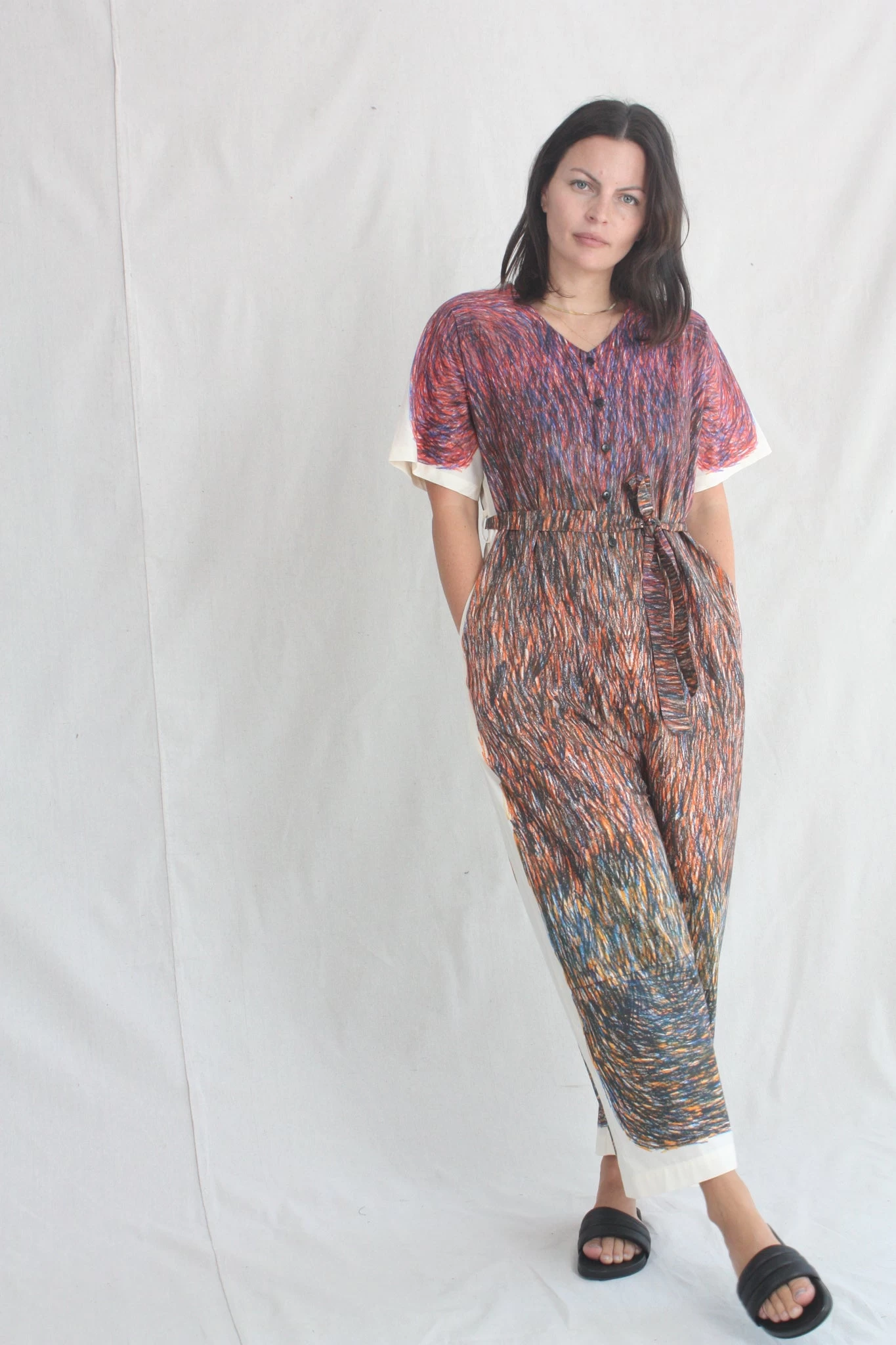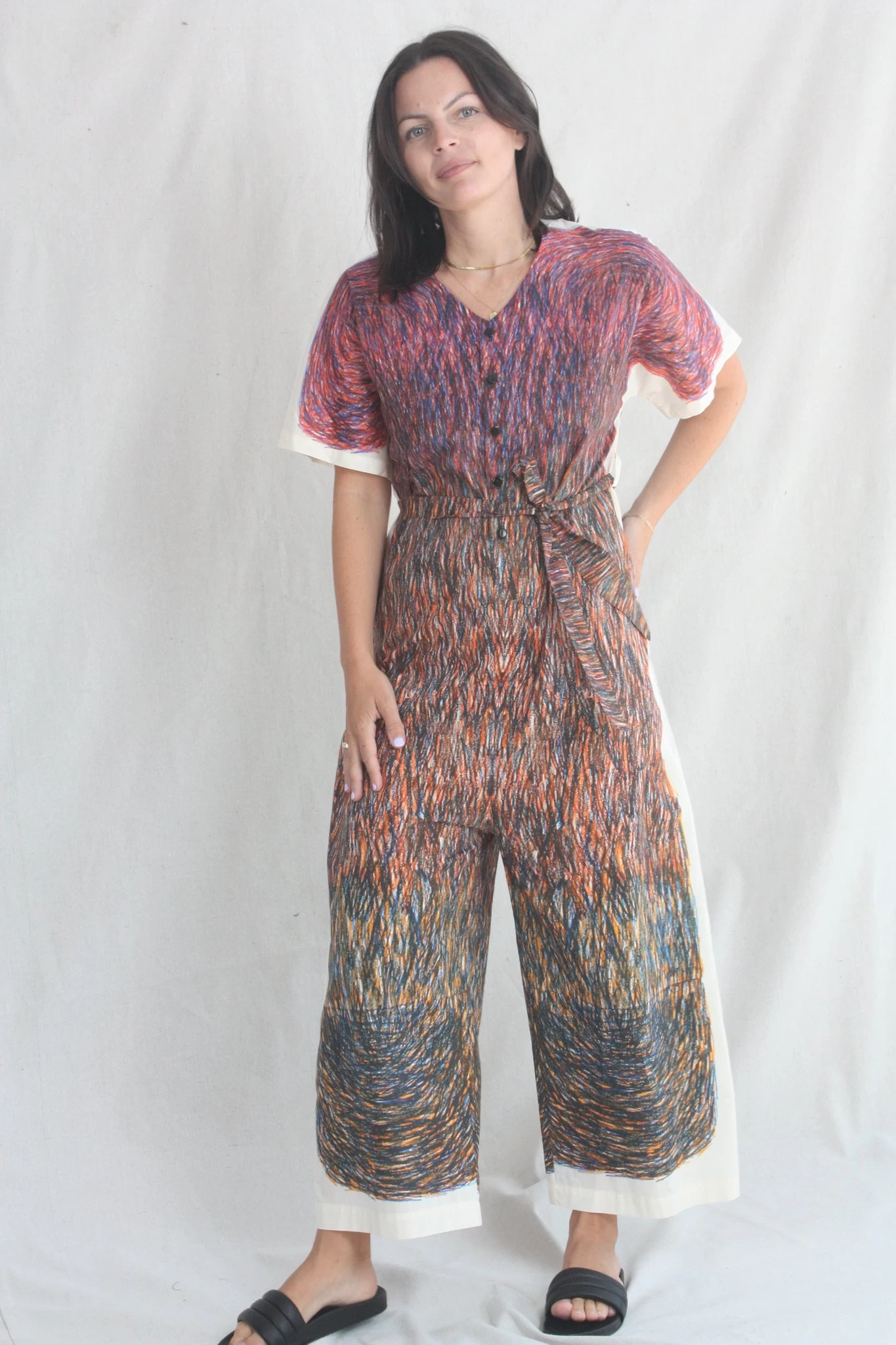 Short sleeve jumpsuit with a slightly cropped curved leg. Round neckline with front button placket closure. Self tie belt.