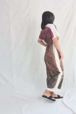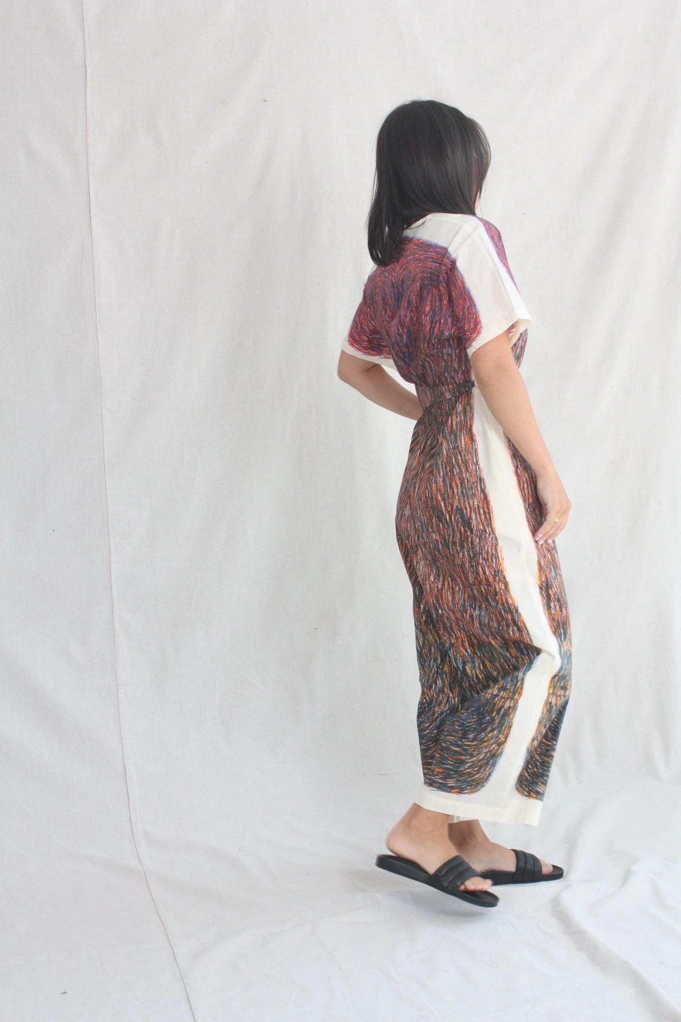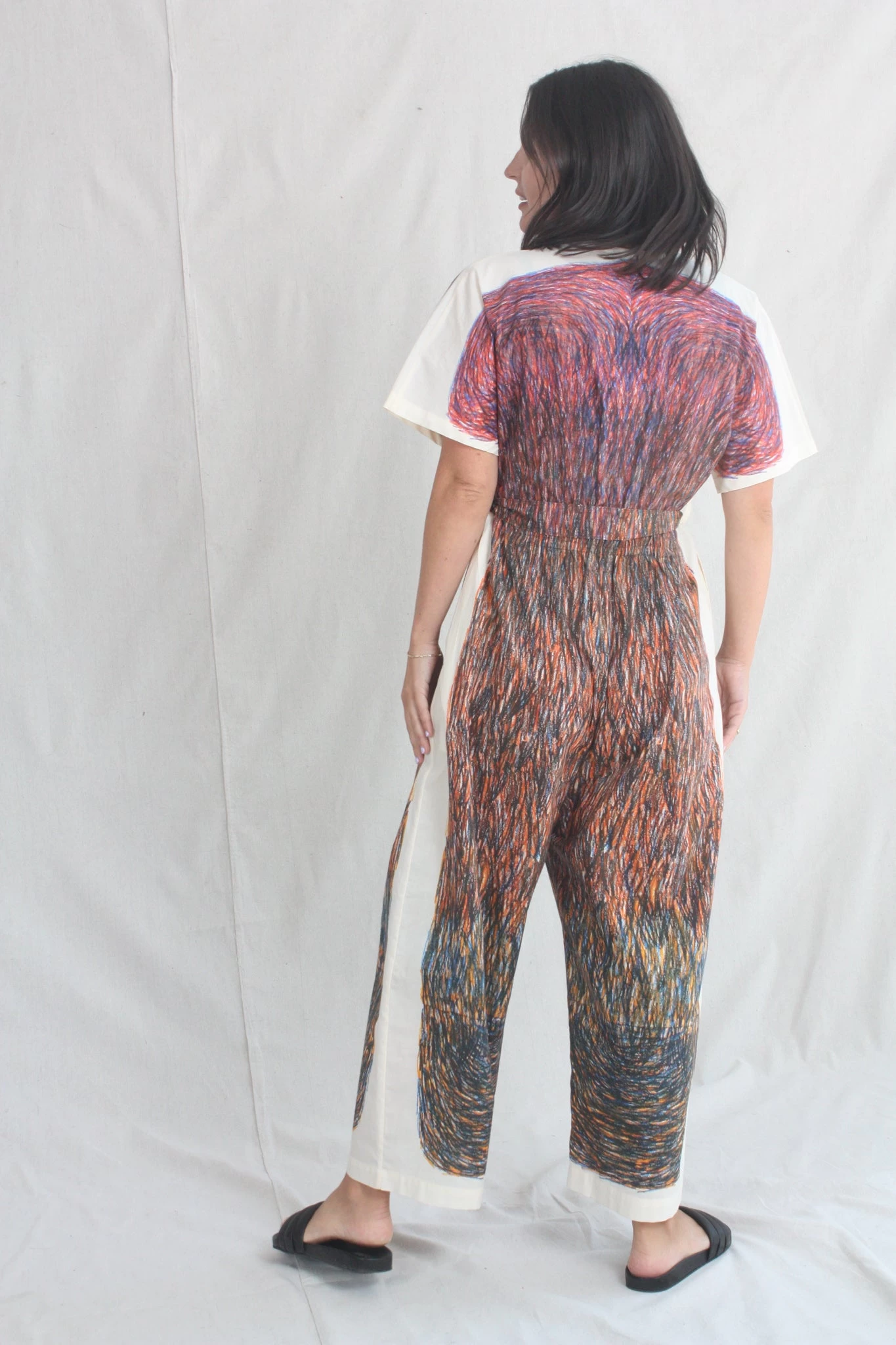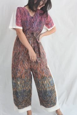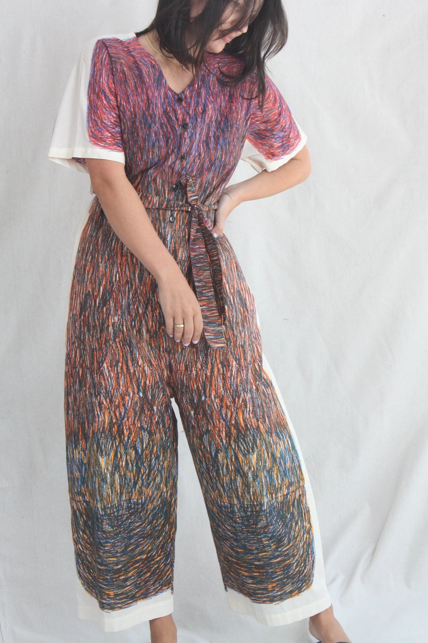 Short sleeve jumpsuit with a slightly cropped curved leg. Round neckline with front button placket closure. Self tie belt.