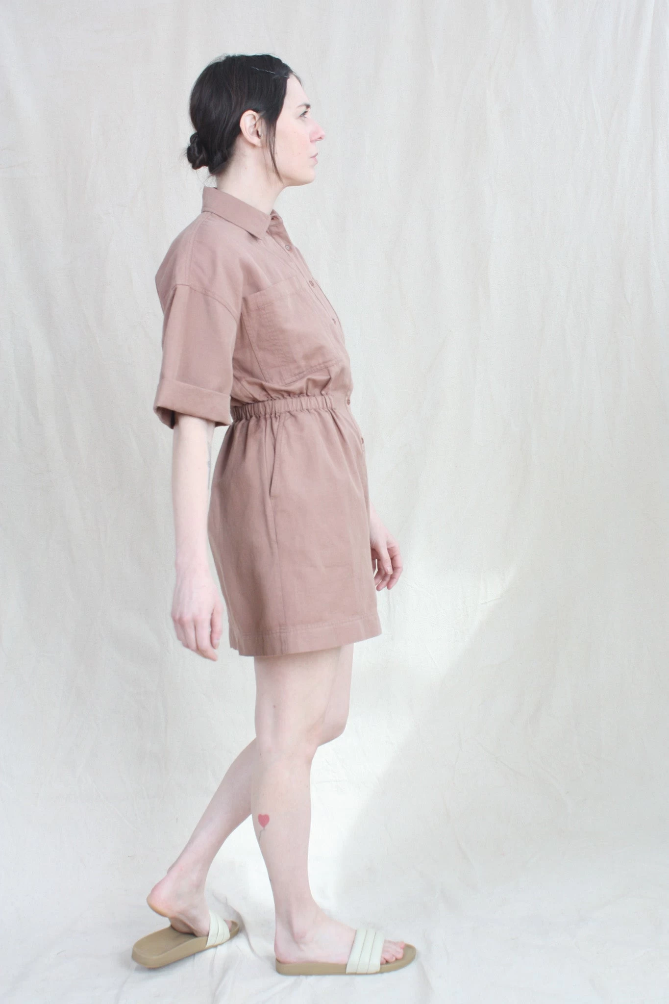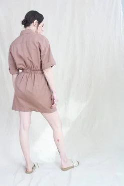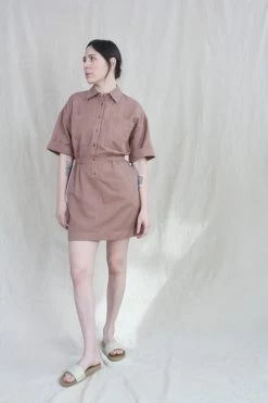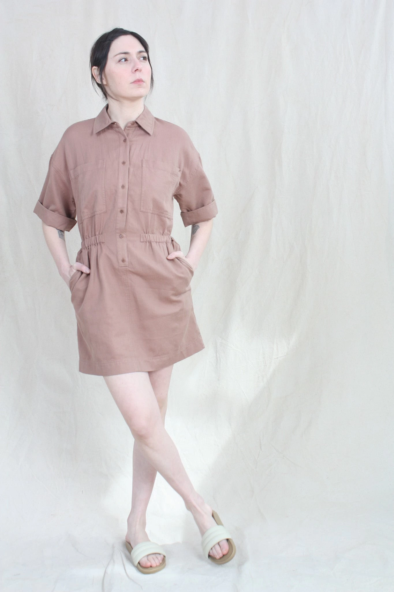 Utility meets femininity in this easy mini dress. Crafted from a cotton/linen blend for a soft and structured shape. Elastic waistband, stand collar with button placket, option to cuff the sleeve. Fits true to size.