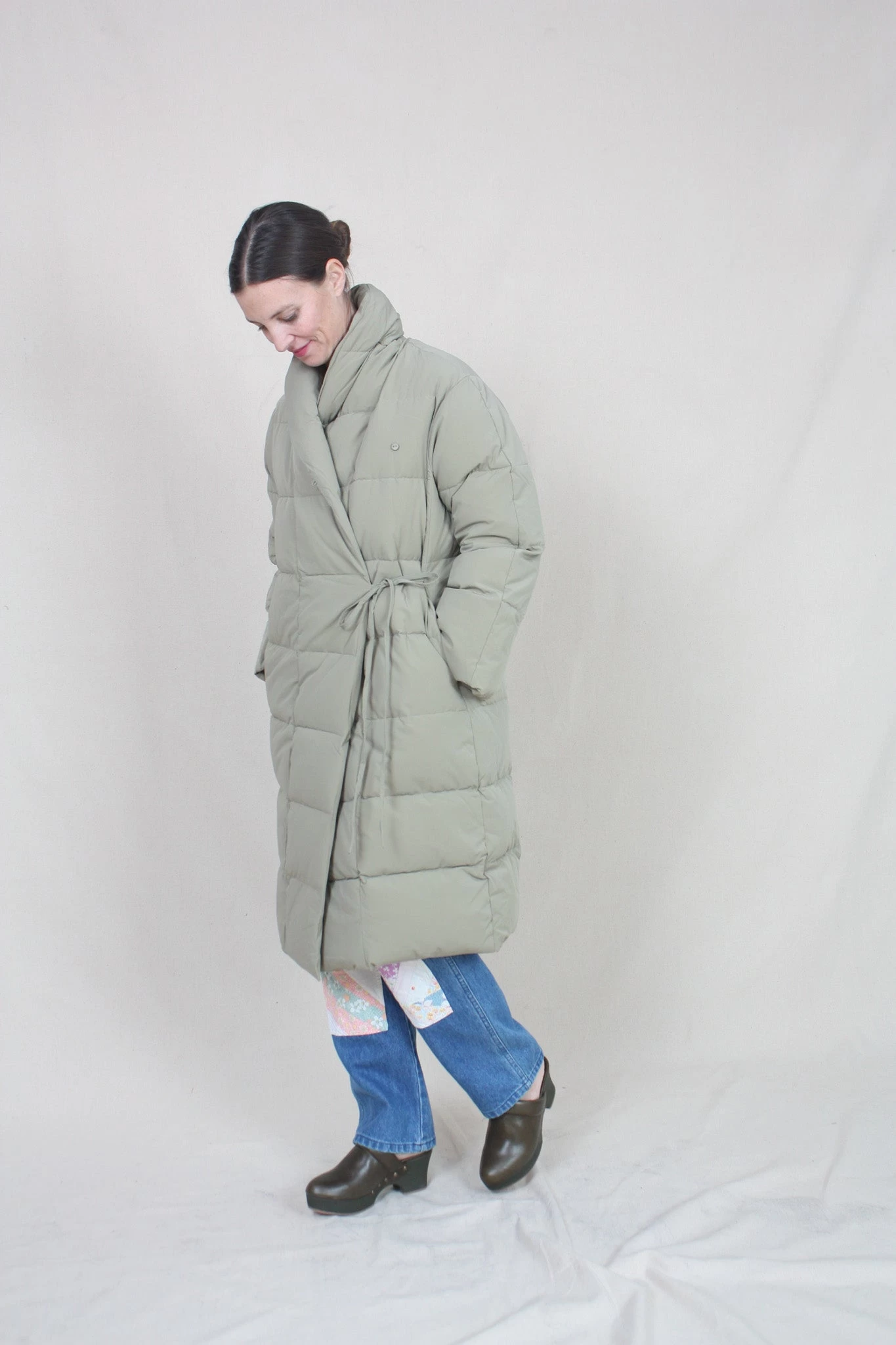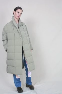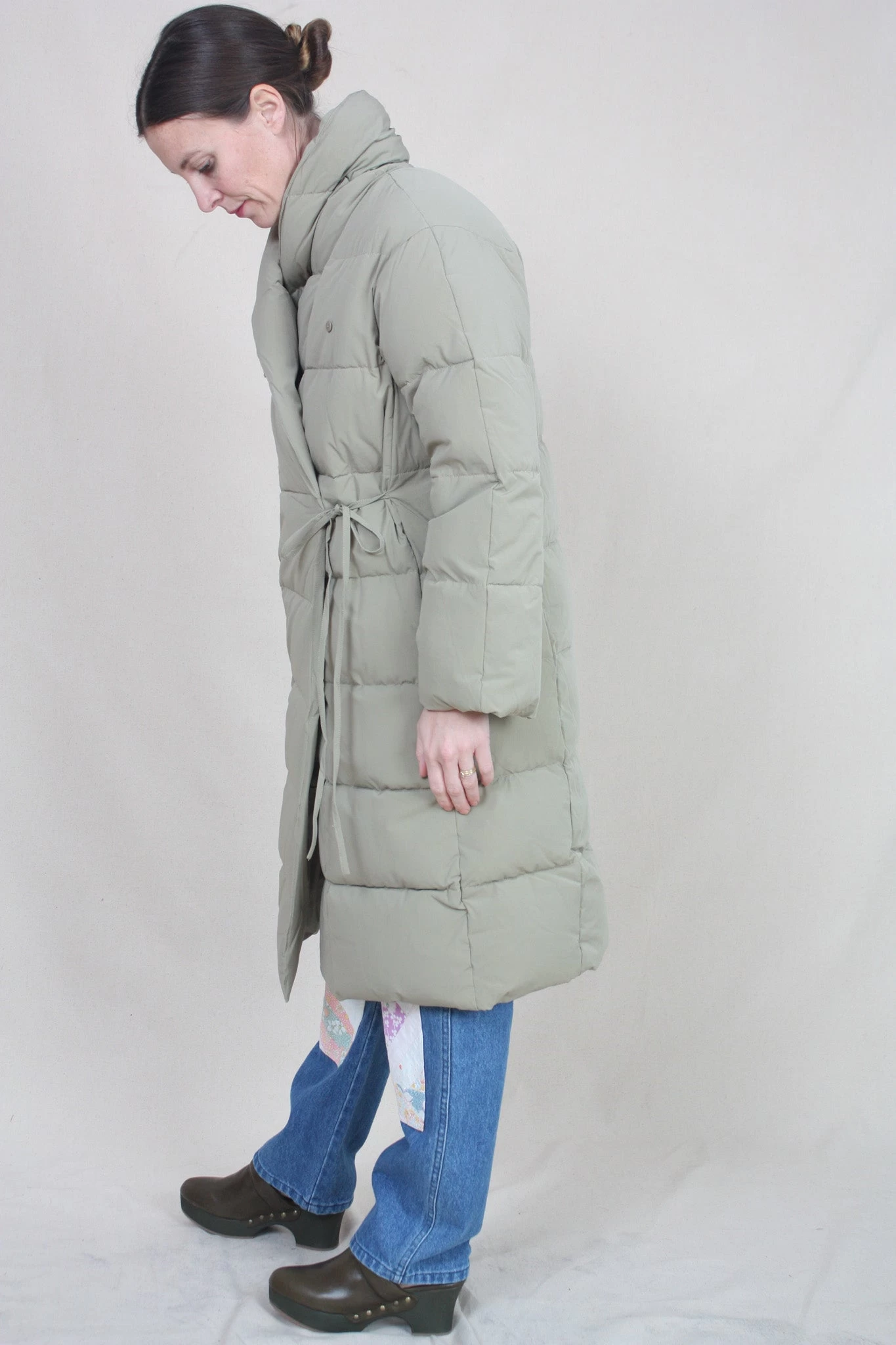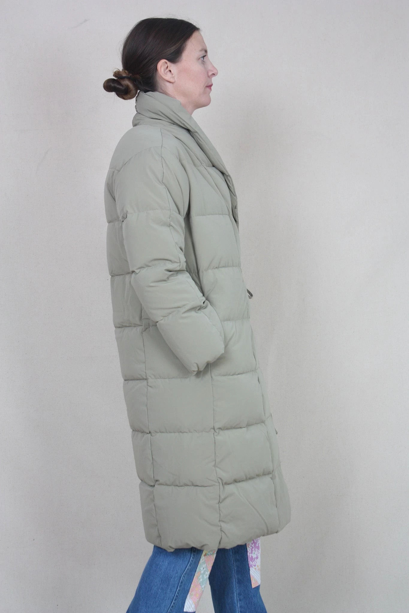 Slightly oversized look, long, recycled down jacket, with side string tie and button. Made in both recycled fabric and feather filling.