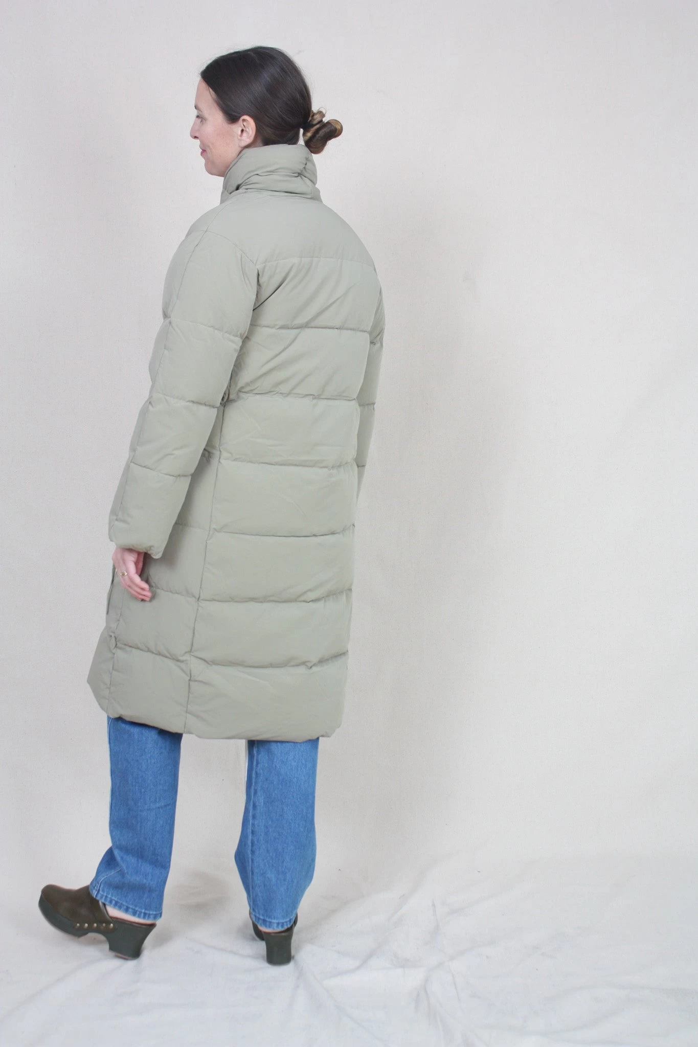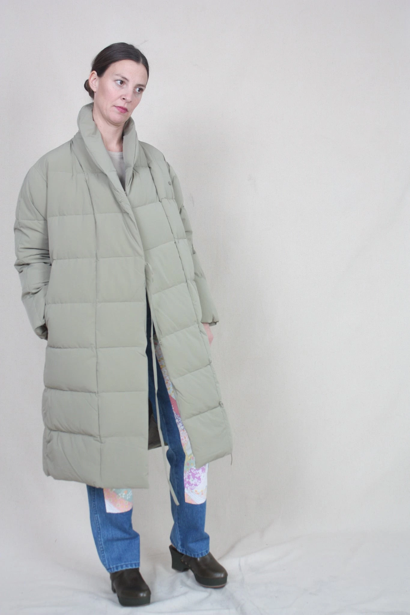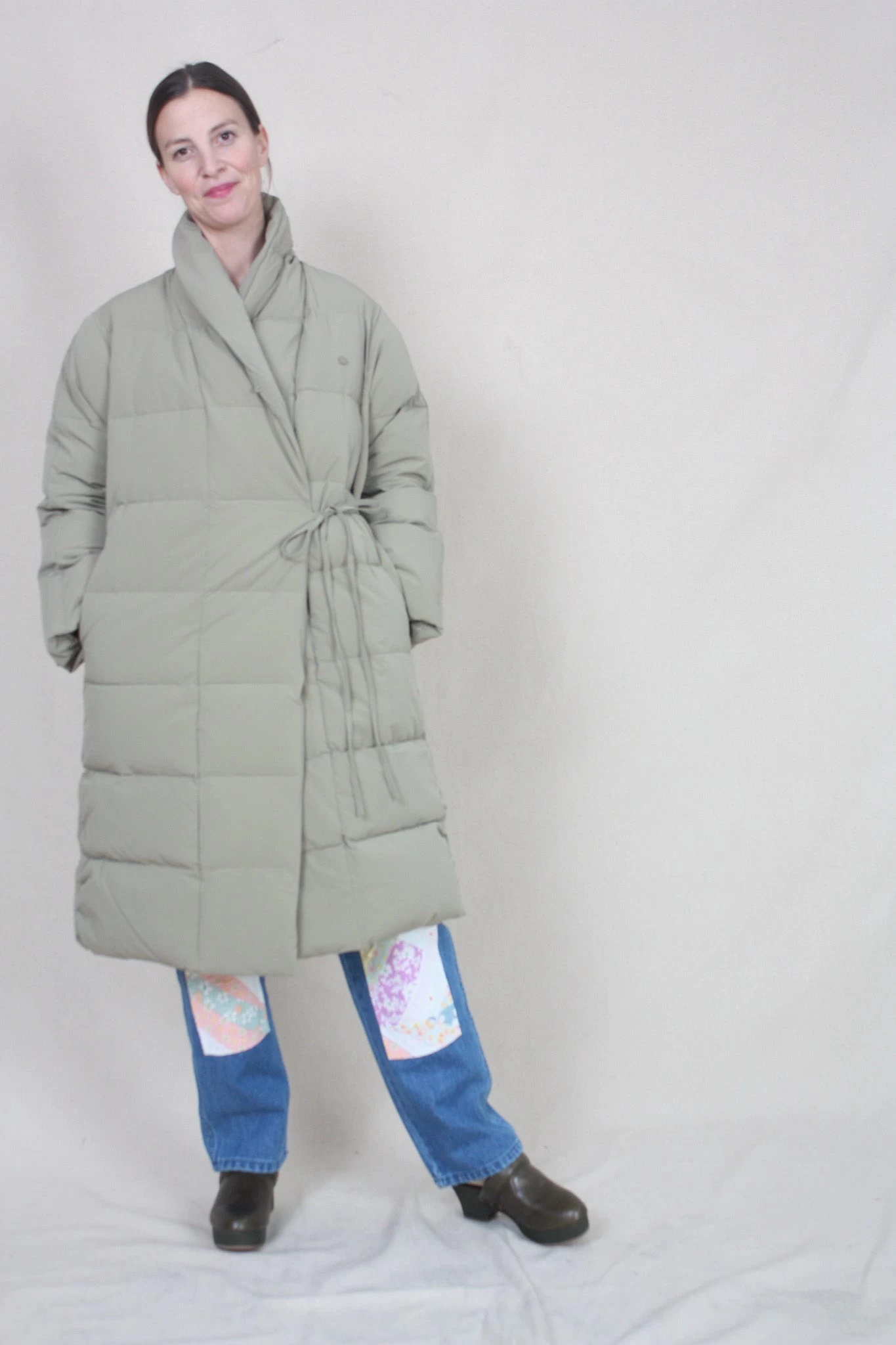 Slightly oversized look, long, recycled down jacket, with side string tie and button. Made in both recycled fabric and feather filling.