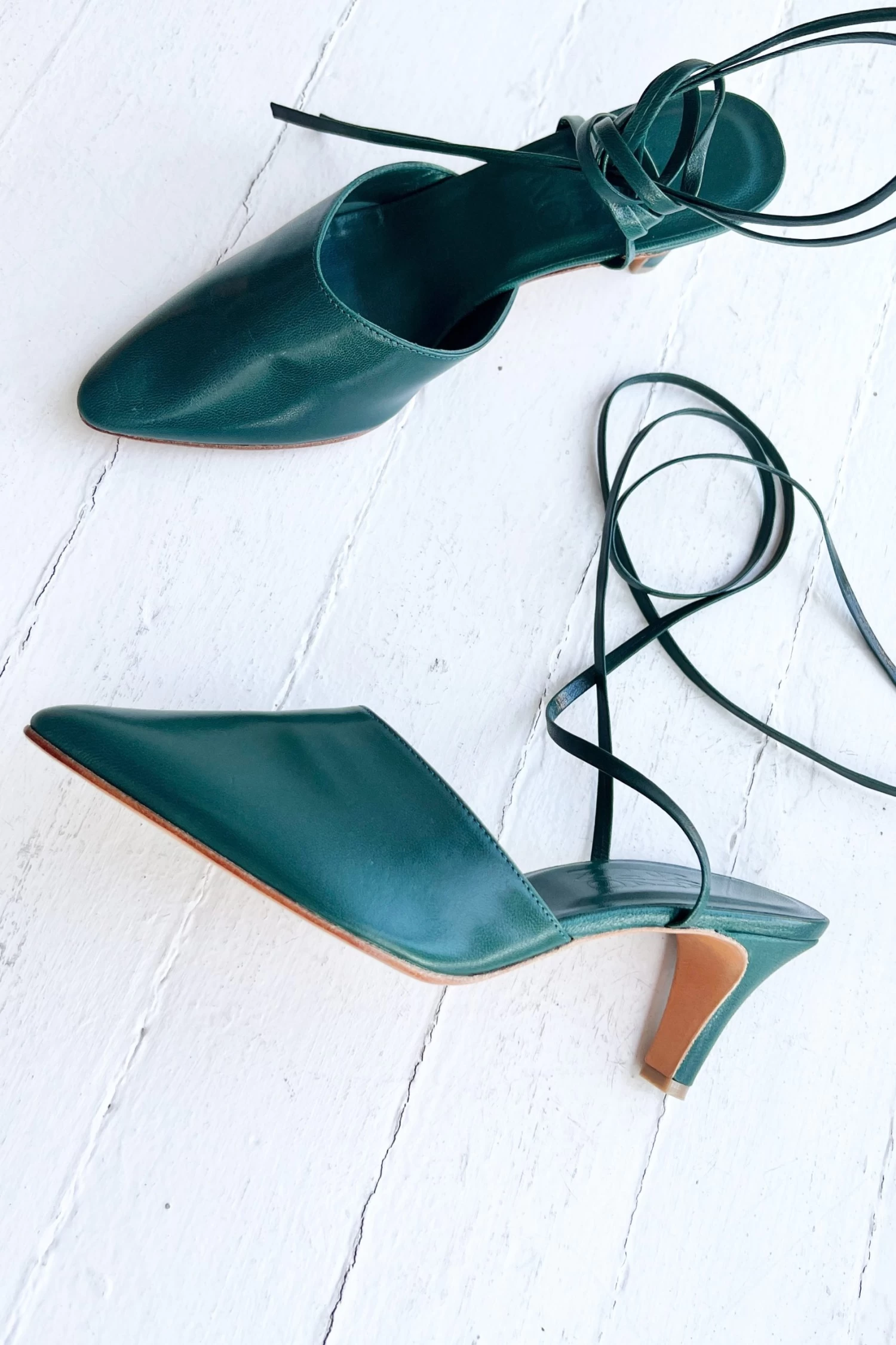 Open heel sandal with laces and pointed toe. Unlined kid leather upper and leather outer sole. Fits true to size.