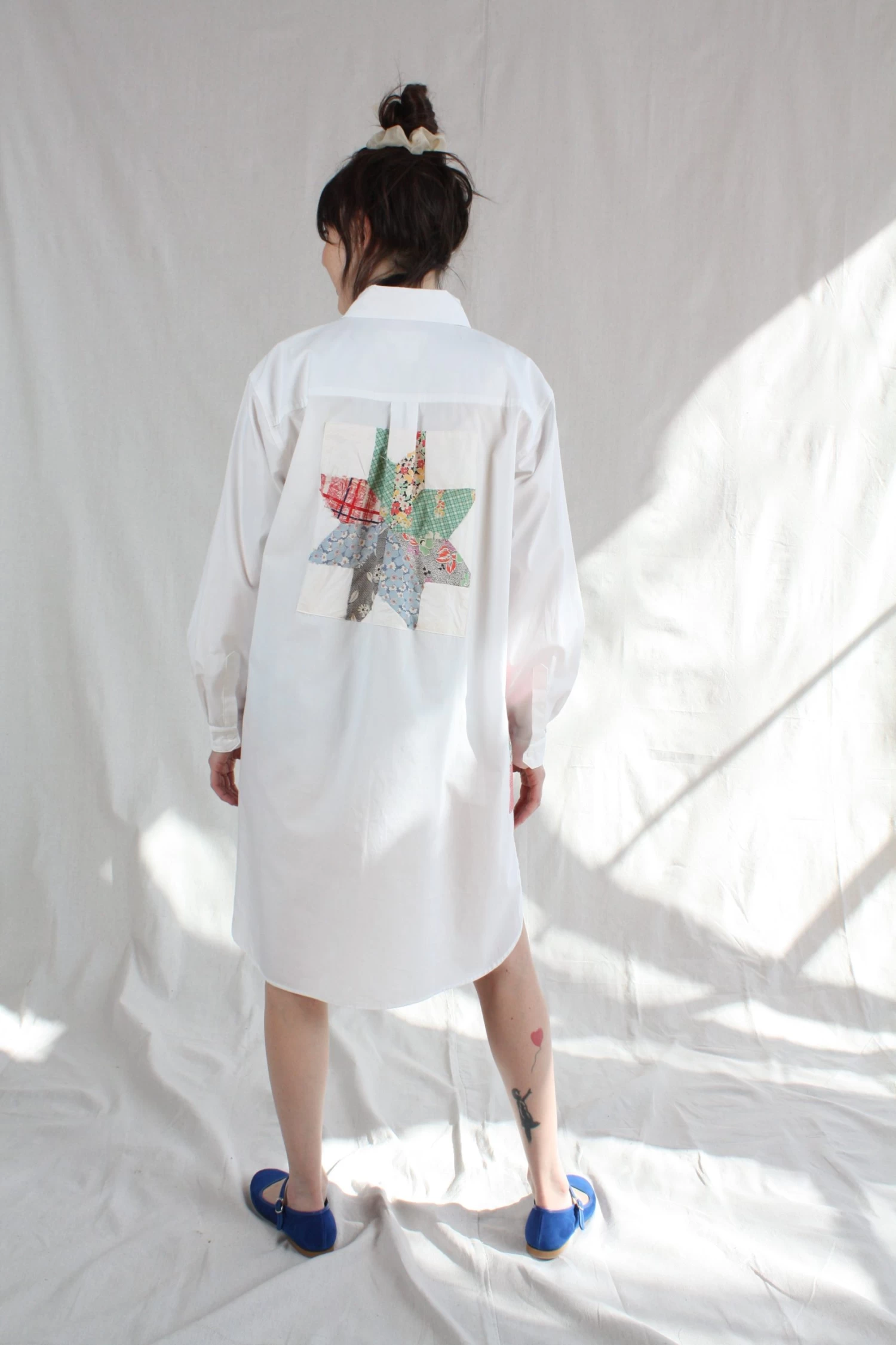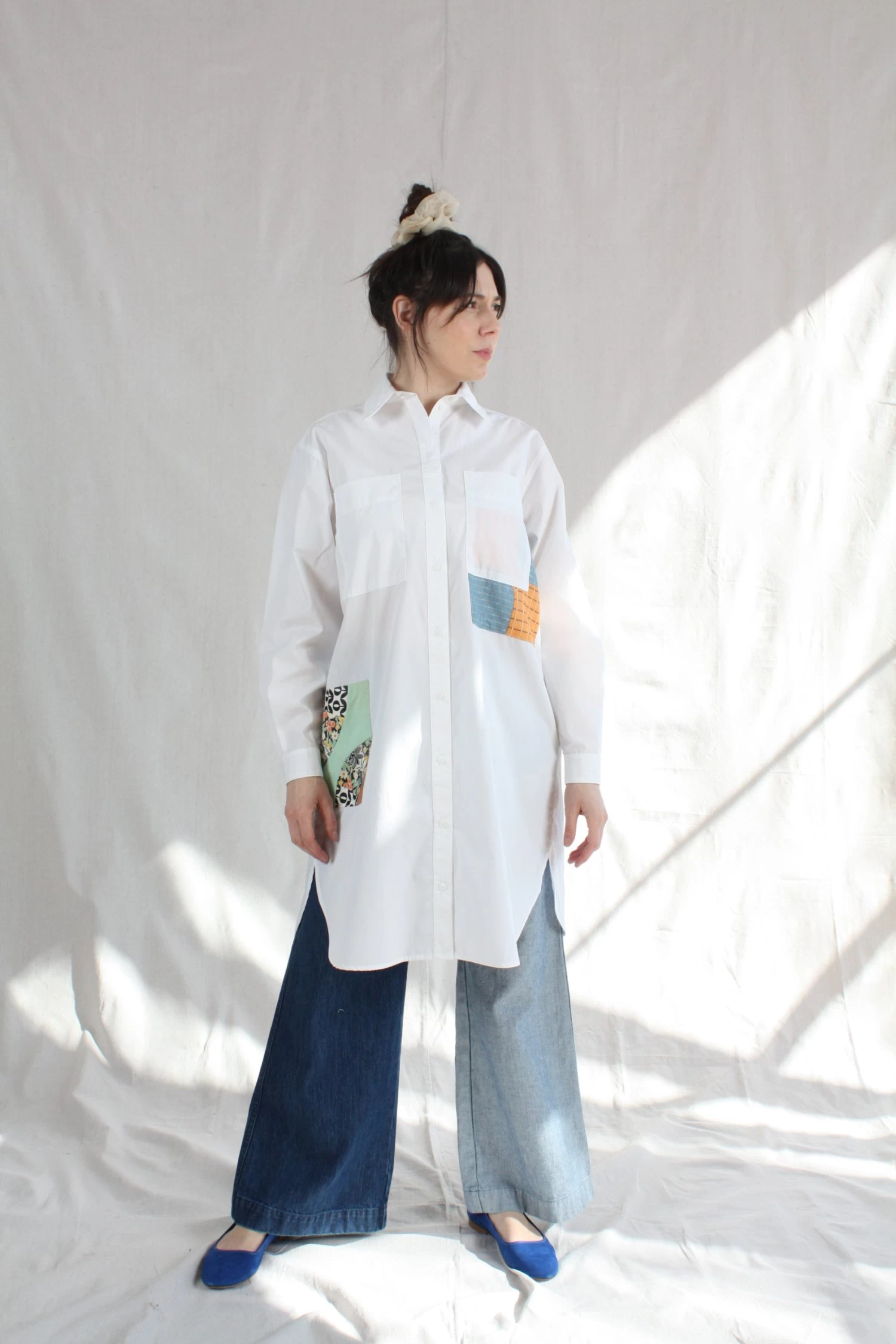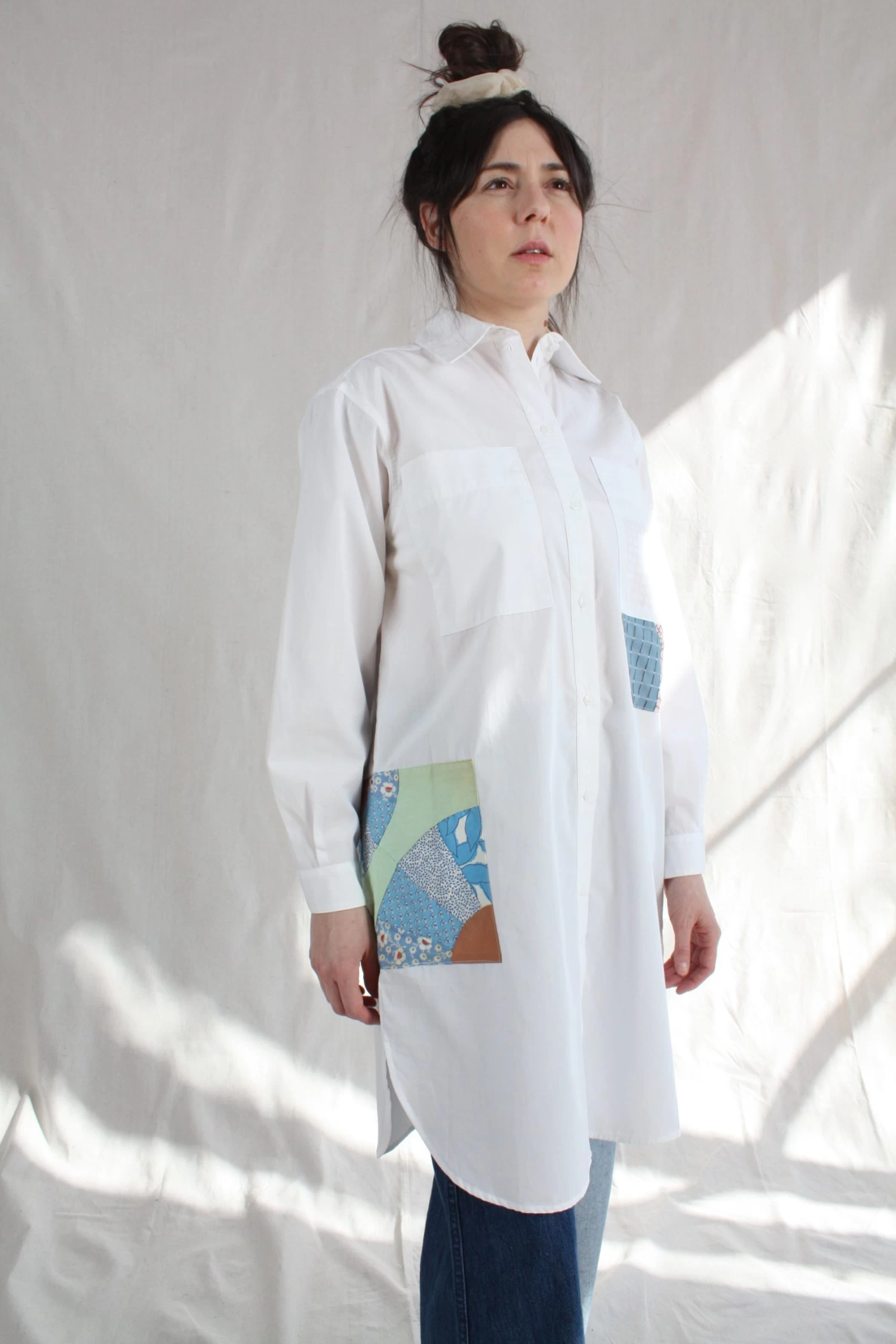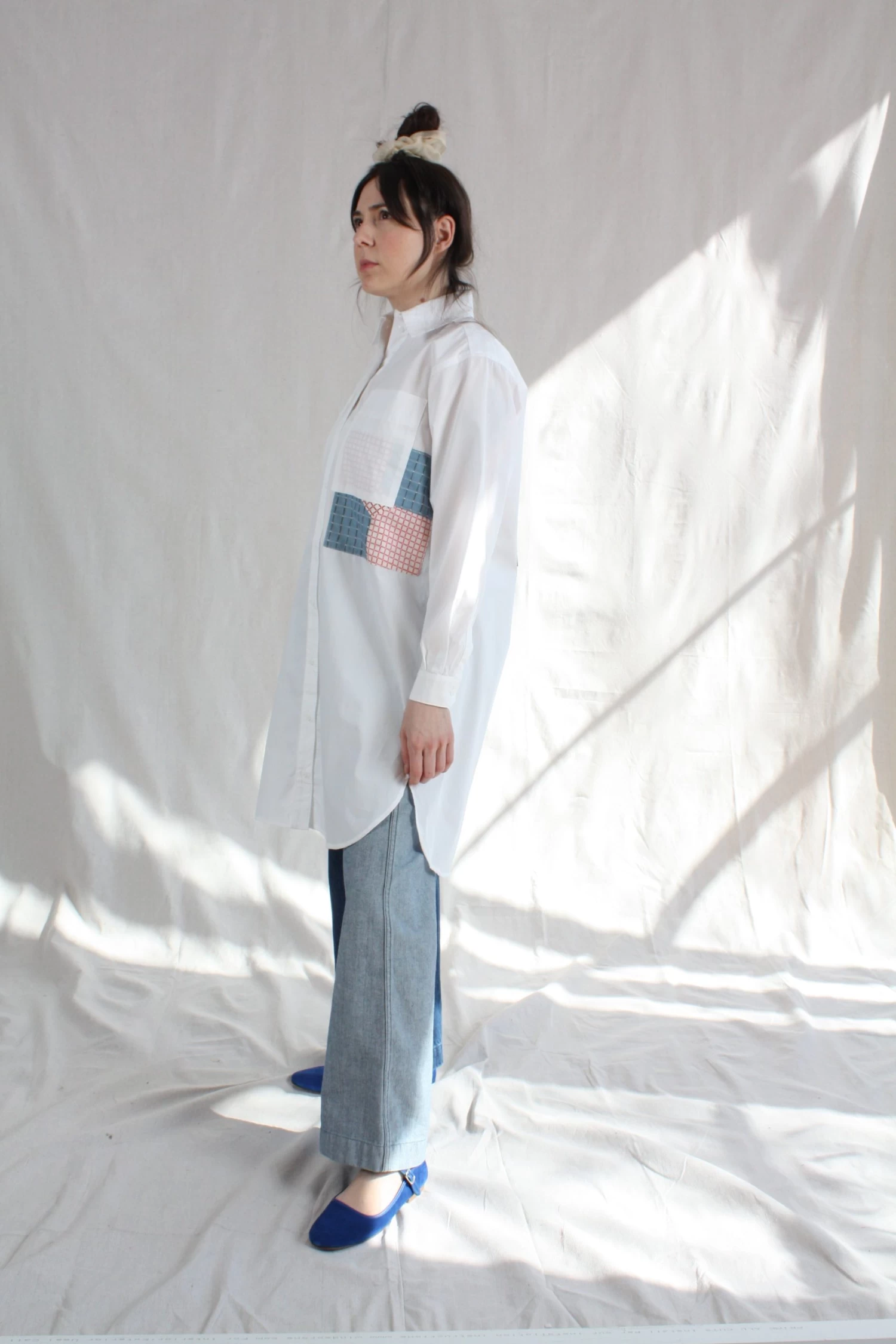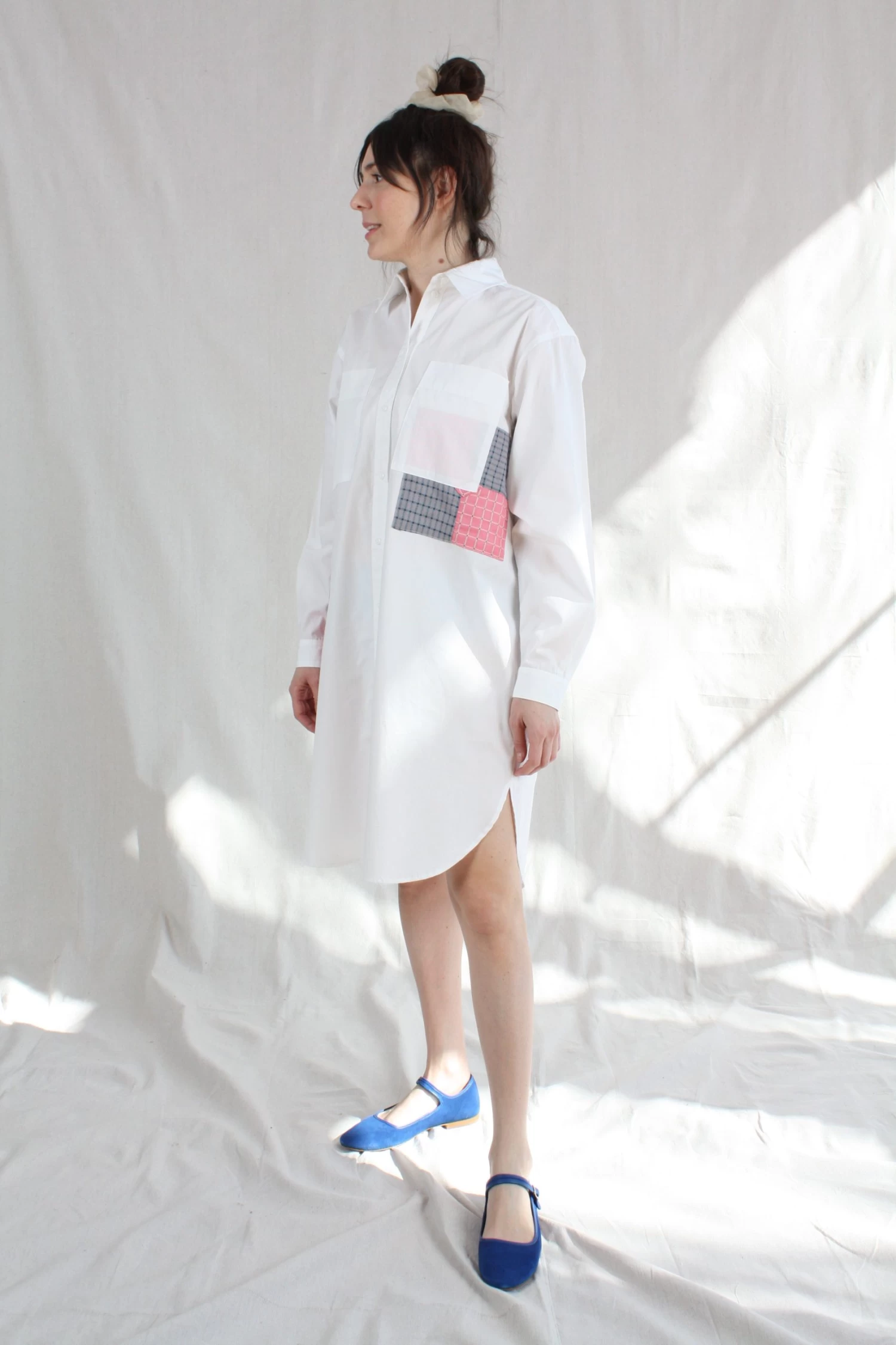 Easy shirtdress in white cotton poplin with vintage patchwork patches. Wear it to work, wear it to the beach, wear it with a big sweater, wear it with most of the buttons undone. Each dress is one of a kind. Carleen handpicks textiles that may include wear, distress, marks, and other signs of age intentionally as we believe this adds to the character of the finished garment.