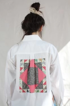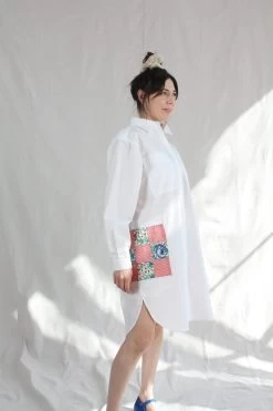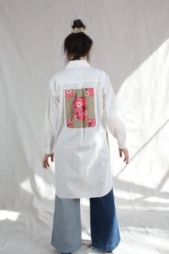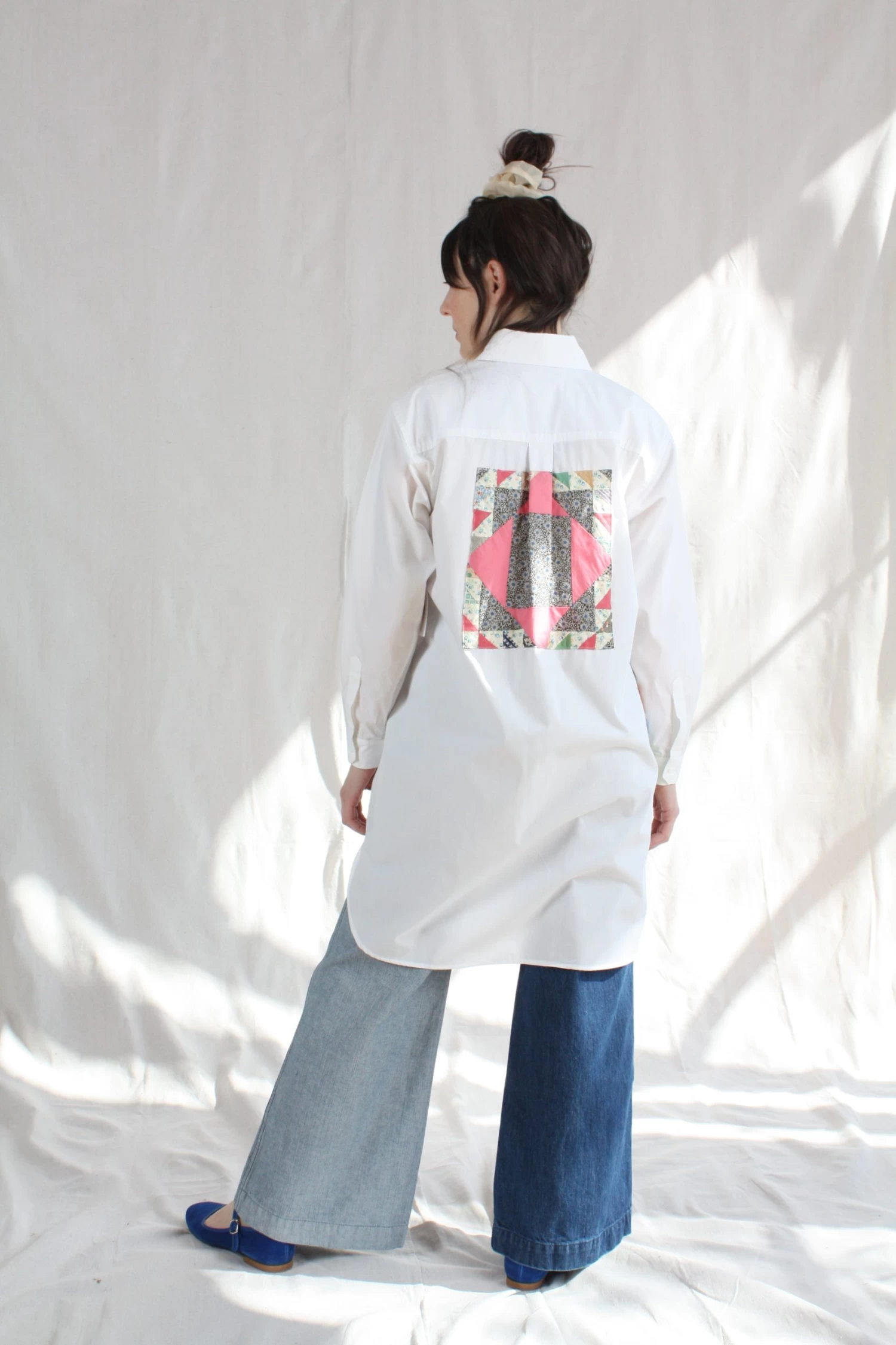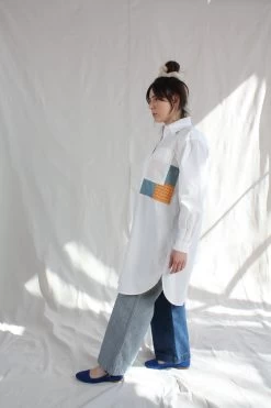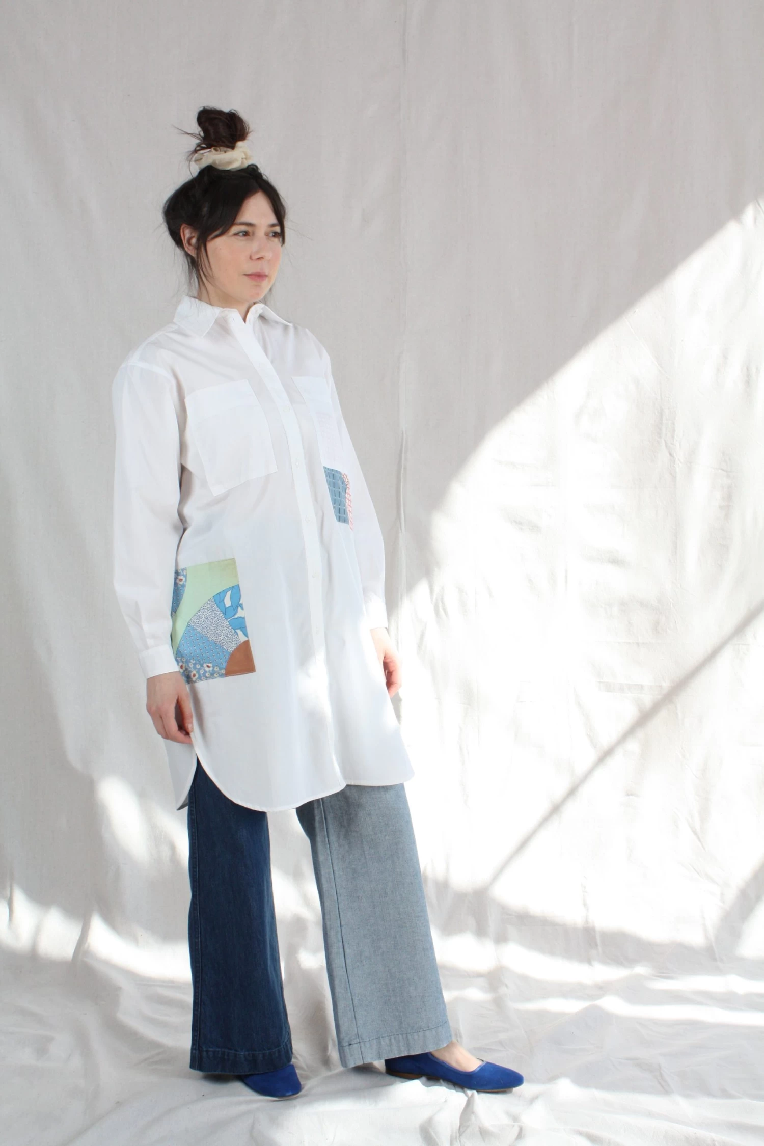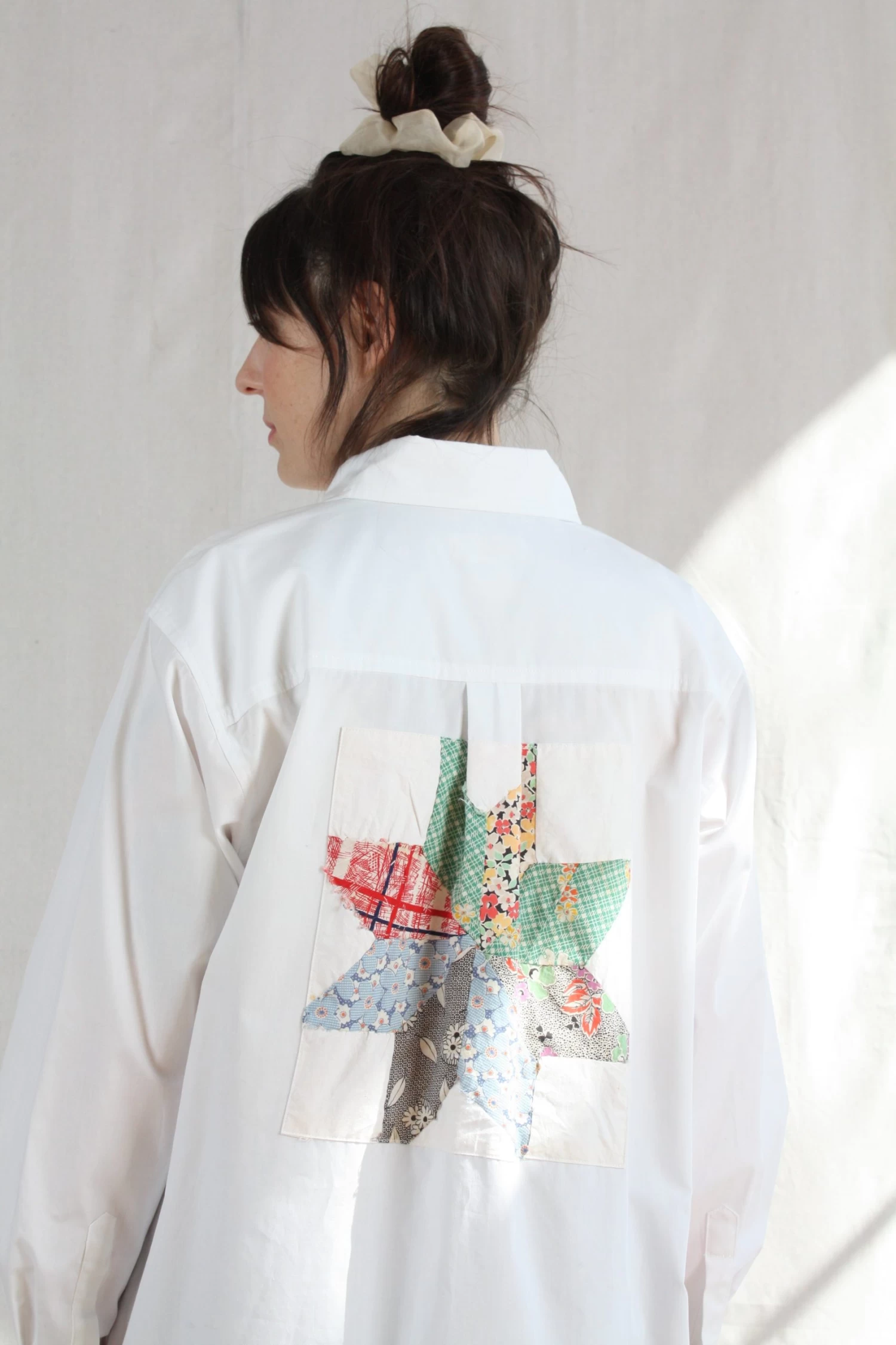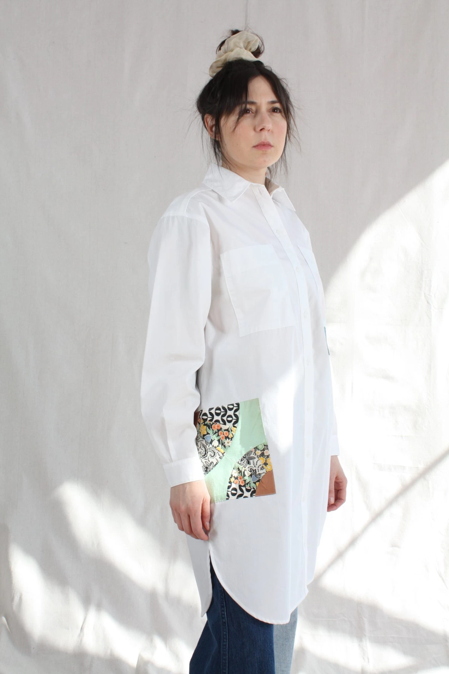 Easy shirtdress in white cotton poplin with vintage patchwork patches. Wear it to work, wear it to the beach, wear it with a big sweater, wear it with most of the buttons undone. Each dress is one of a kind. Carleen handpicks textiles that may include wear, distress, marks, and other signs of age intentionally as we believe this adds to the character of the finished garment.