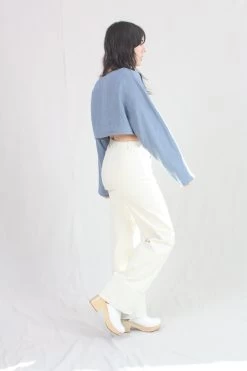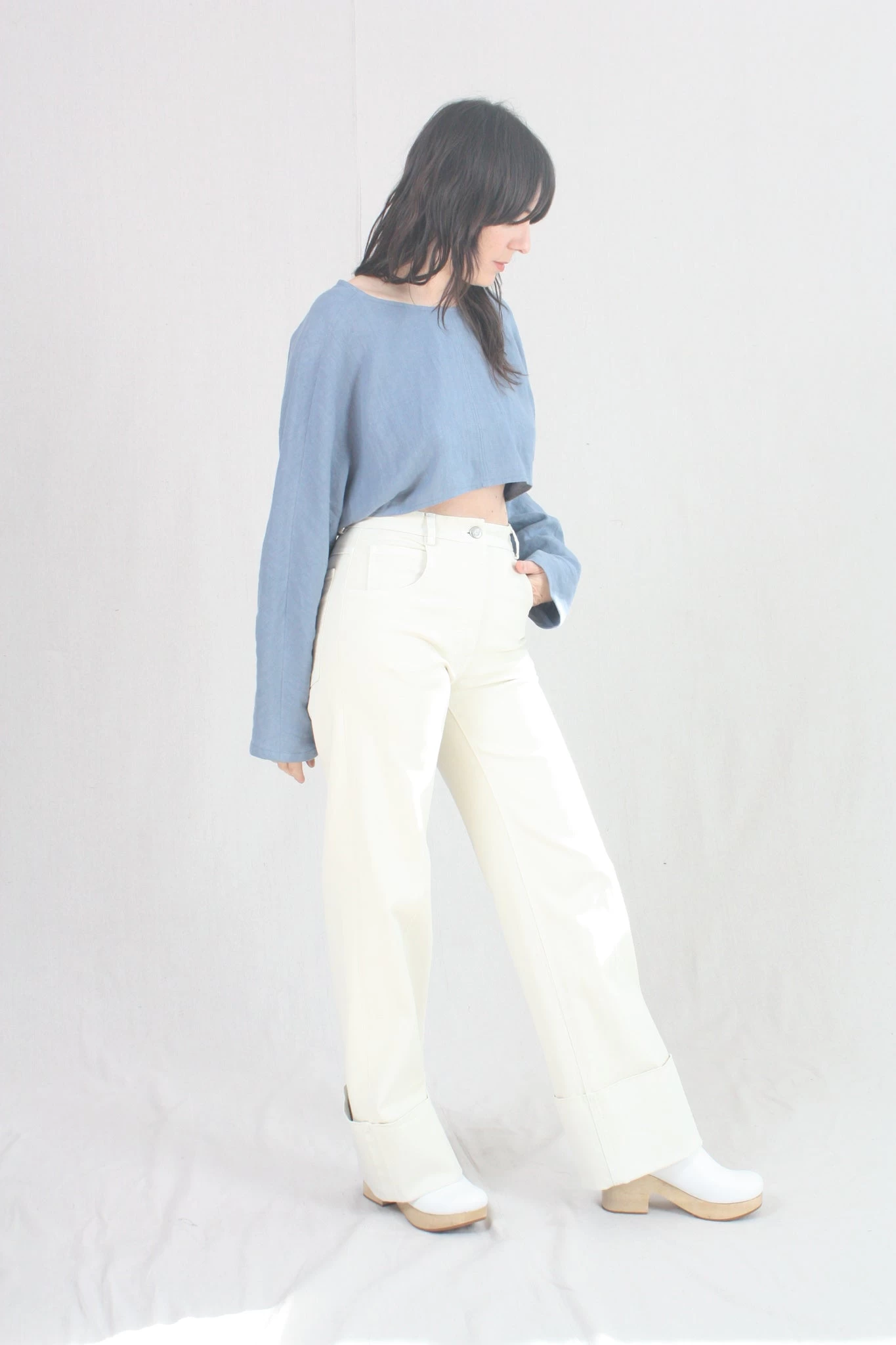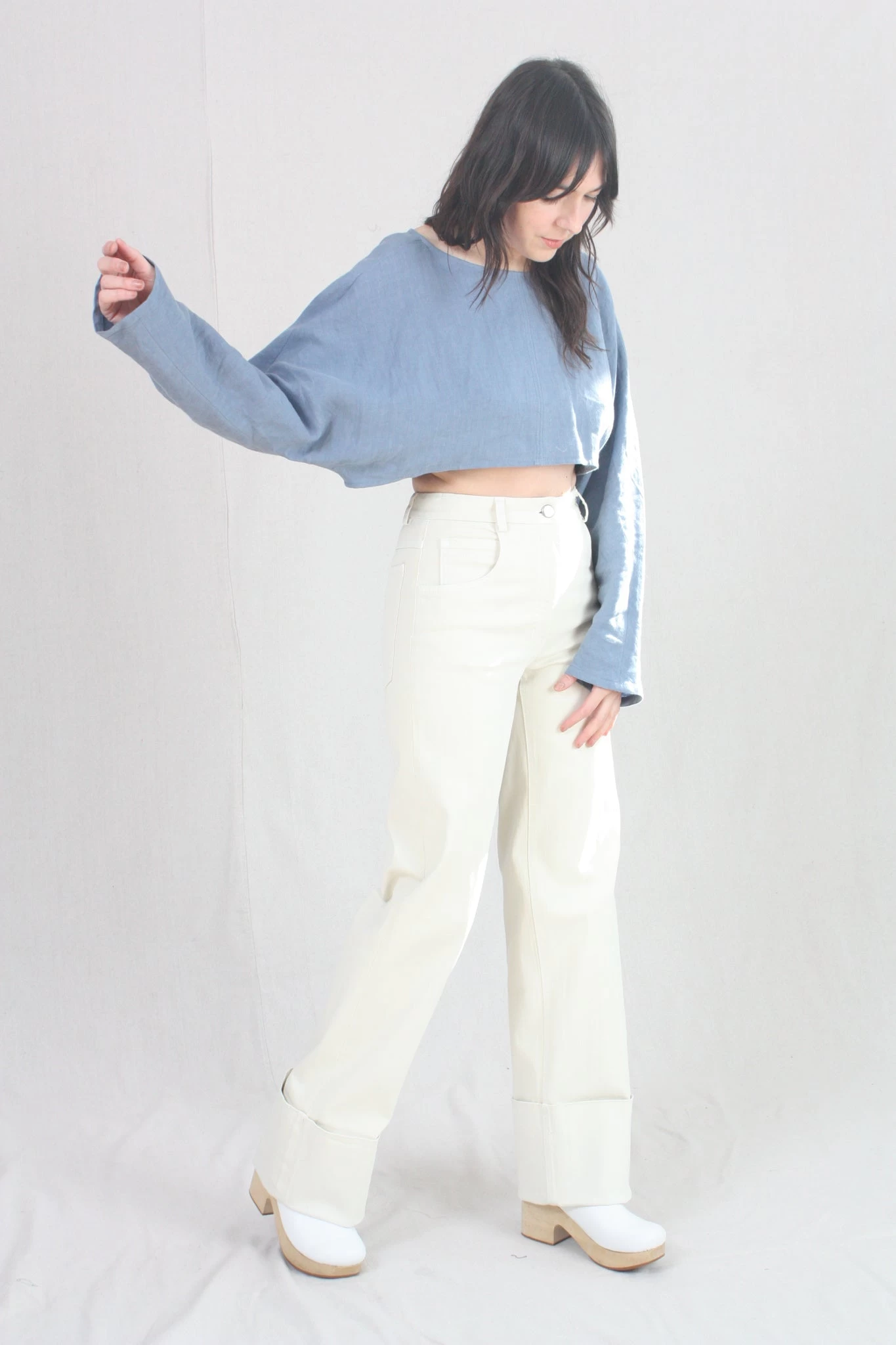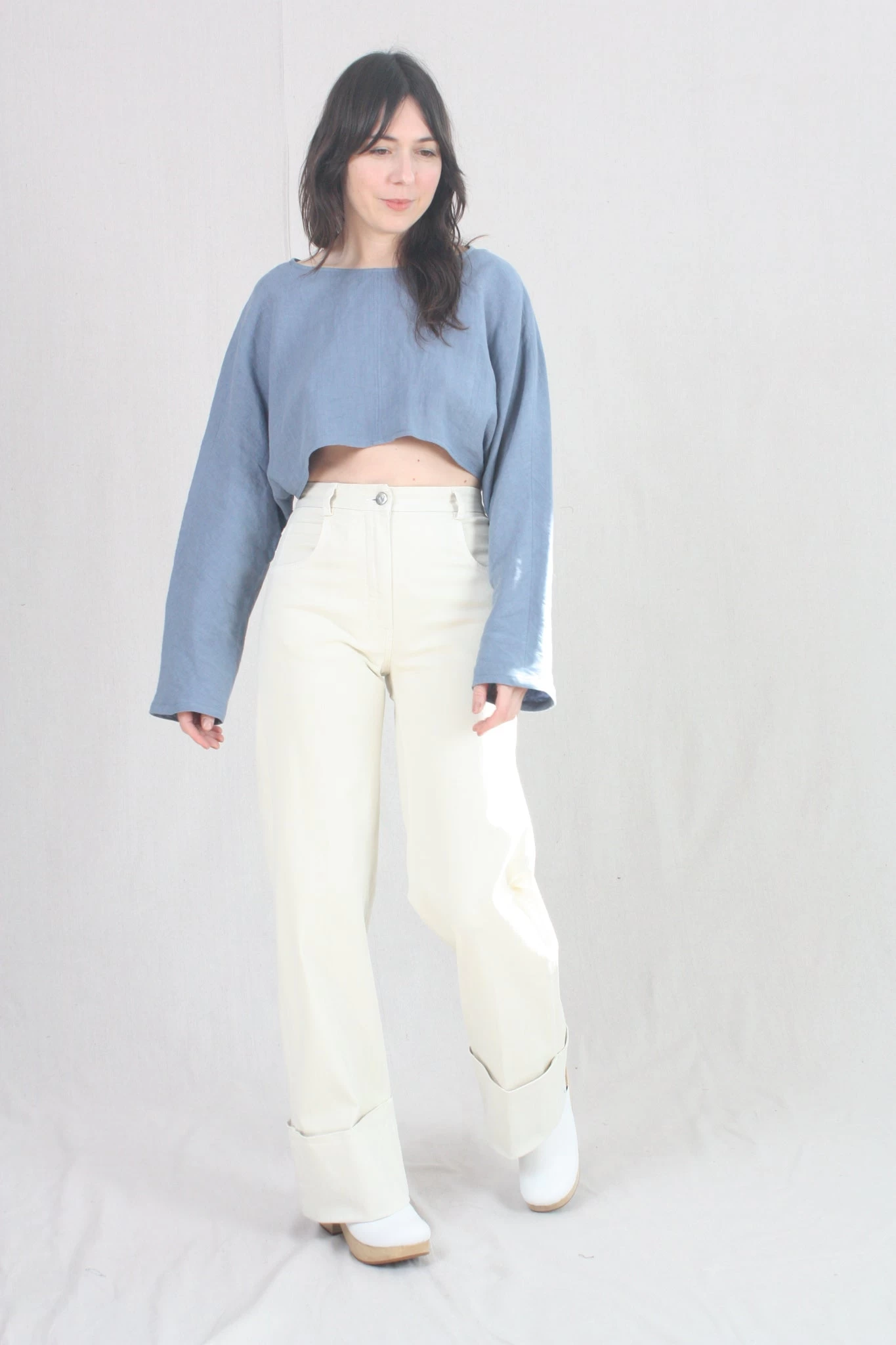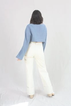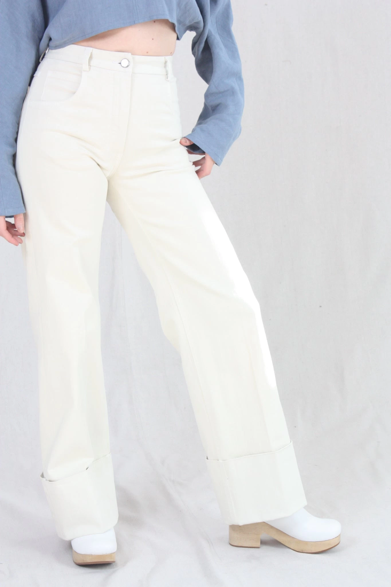 High-waisted wide leg denim pant with cuffed hem. Zipper fly and button closure. Five pocket styling.