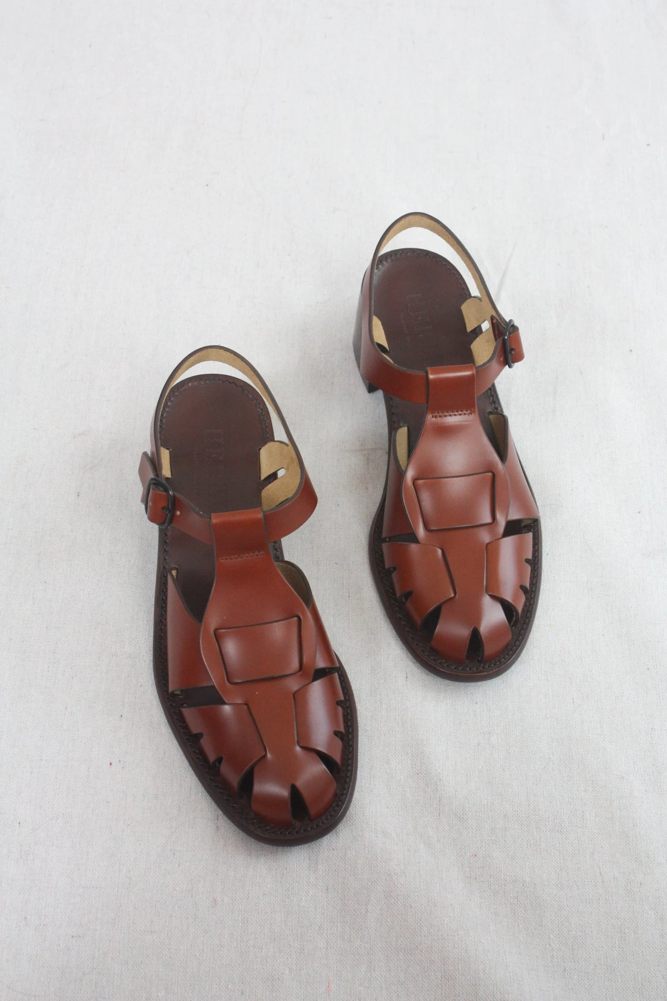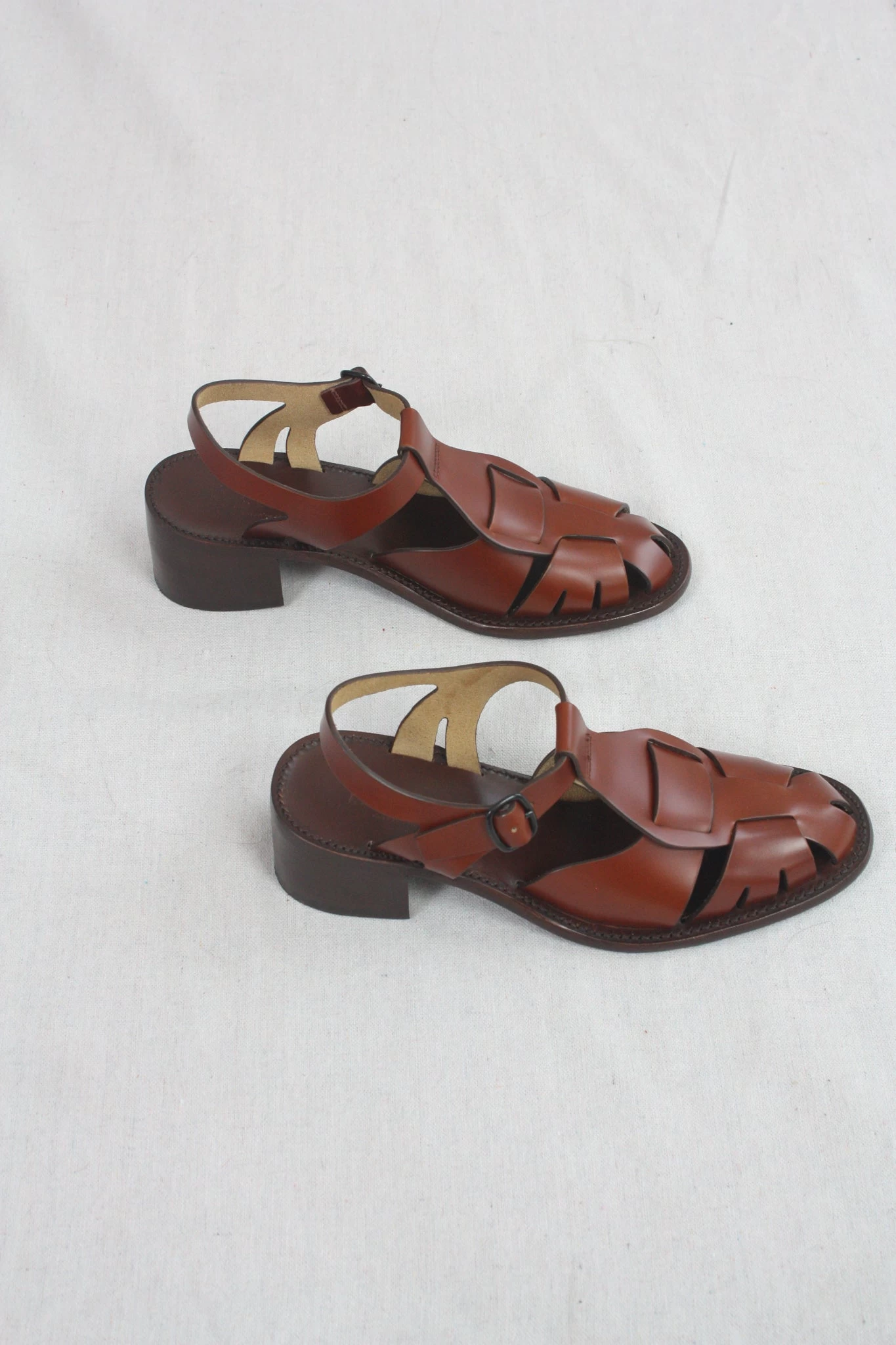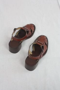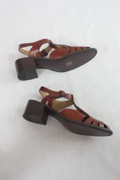 Heeled t-bar sandal crafted in Spanish full-grain leather. Leather outsole with stacked leather heel. Adjustable buckle fastening.