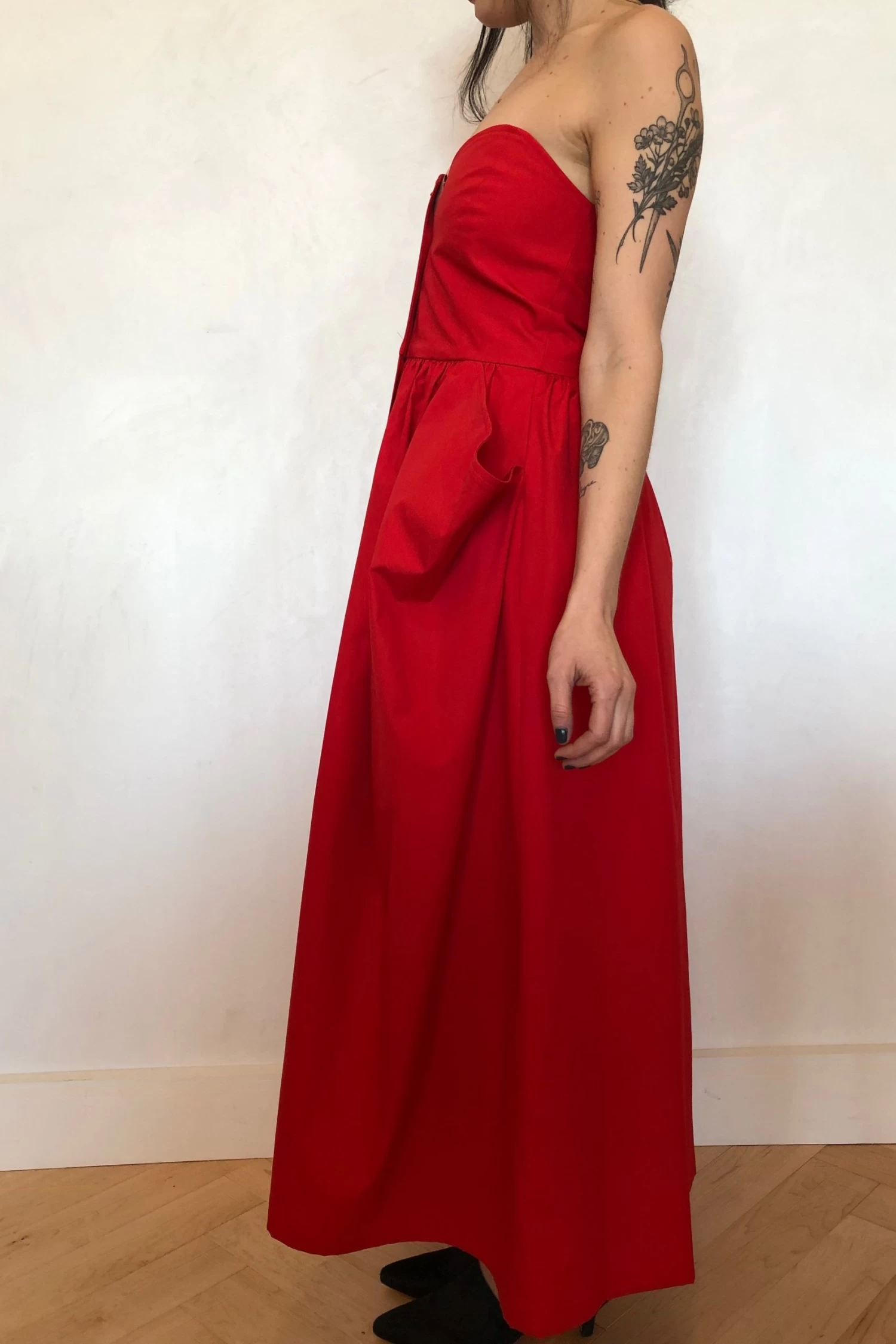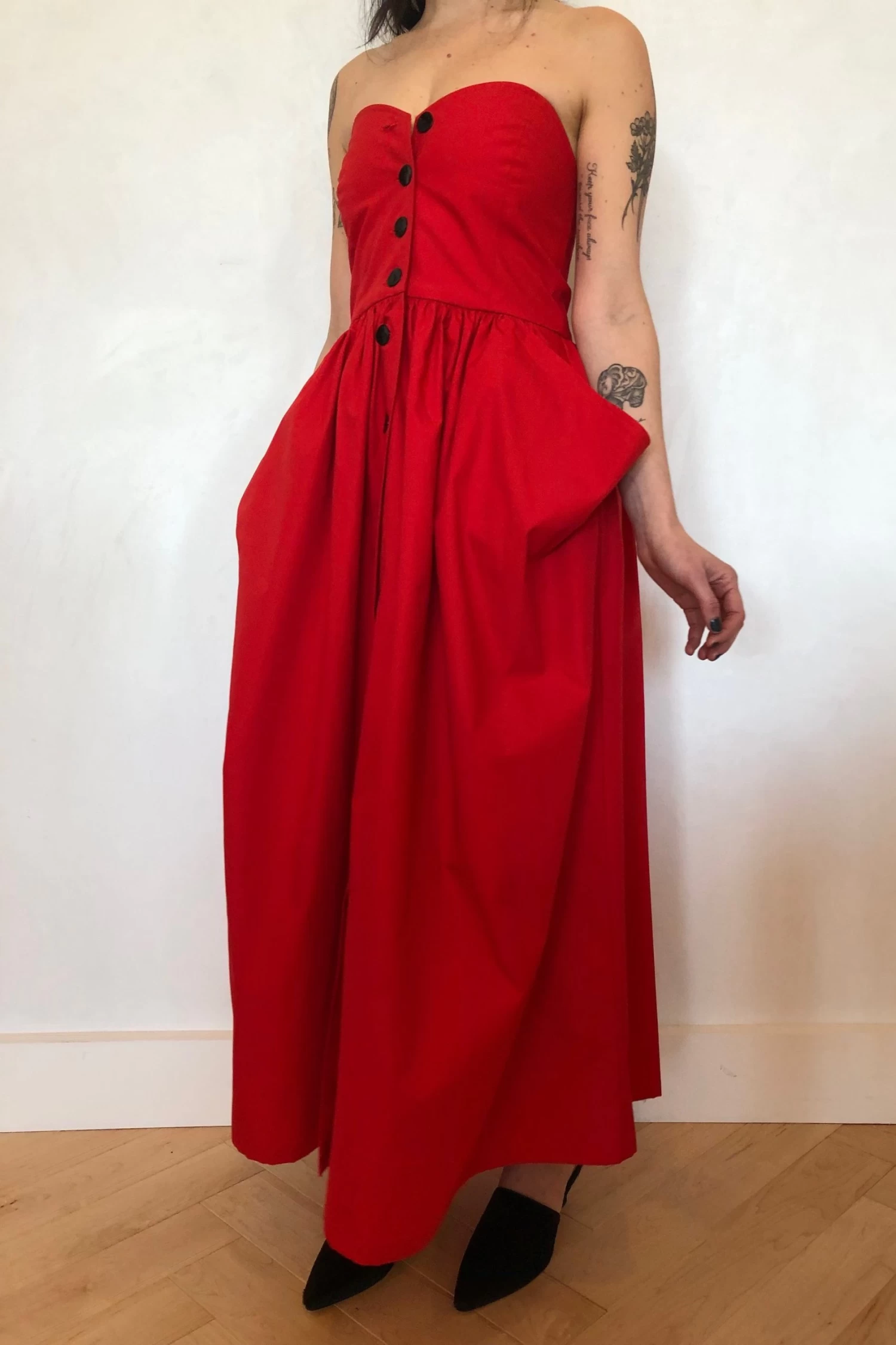 Strapless dress featuring flared pockets, button front detail, and midi‑length full skirt. Unlined.