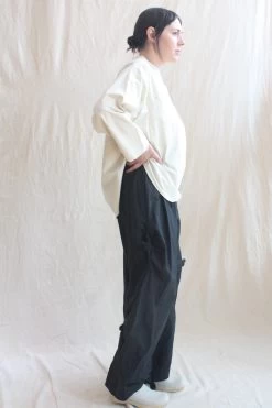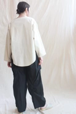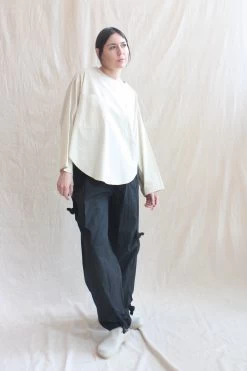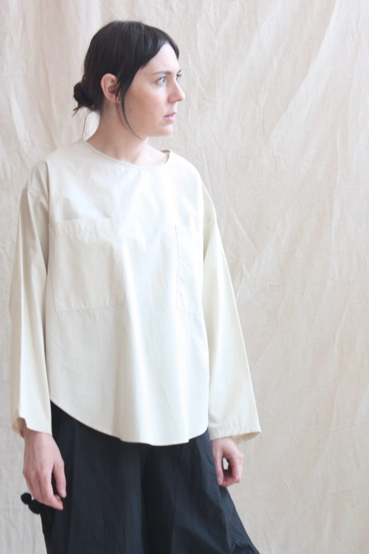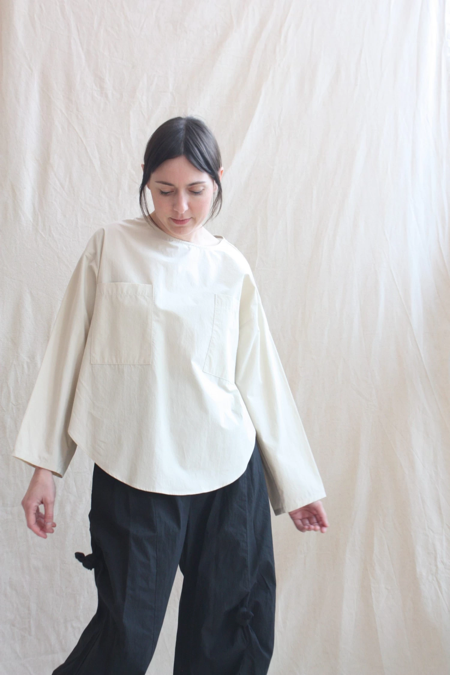 Cotton parchment poplin top with rounded hem. Crisp finish to the fabric. Long shirttail detail and patch pockets on chest. Full sleeve. Relaxed fit, but true to size. Pair with the coordinating Balloon Pant from Modern Weaving for a monochromatic look.
