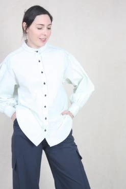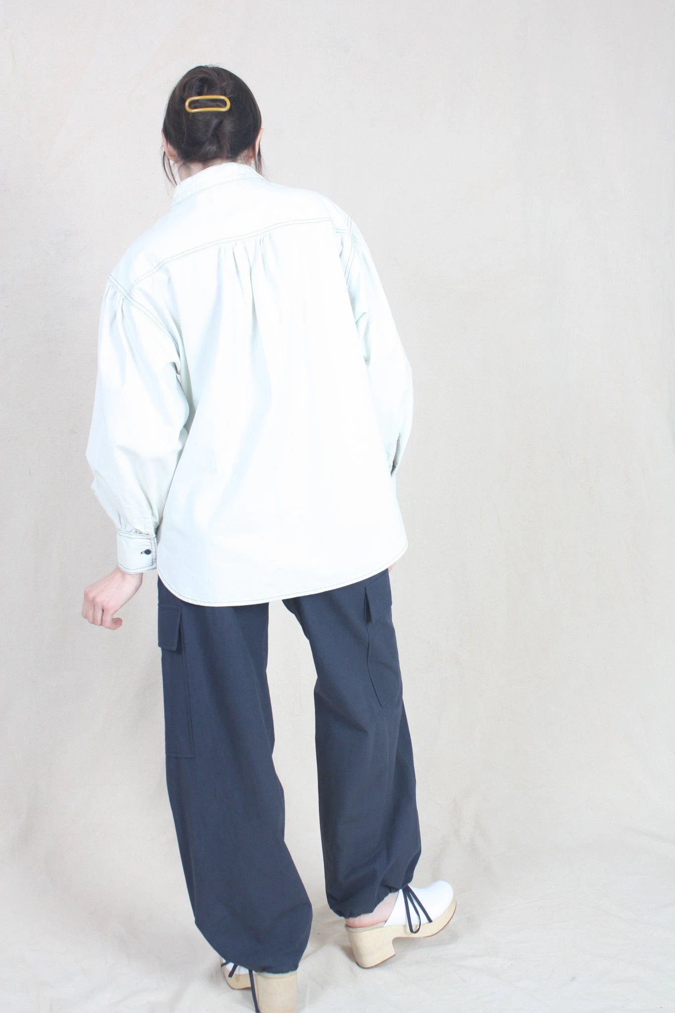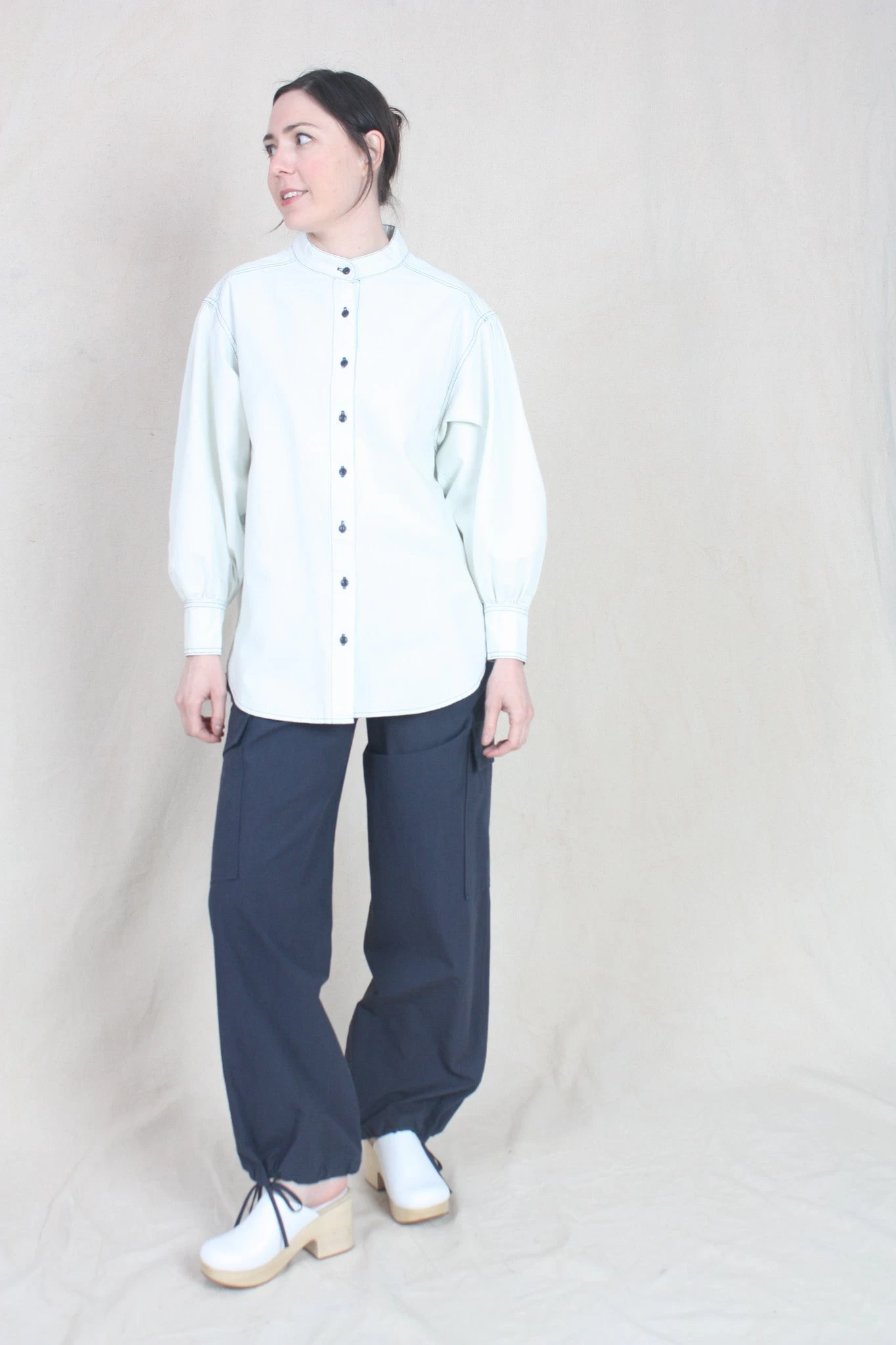 A super wearable shirt with just the right amount of drama, perfect for double-denim looks and great with shorts all summer long. Featuring long voluminous sleeves, a slight drop shoulder, and a stand collar. Available in light wash chambray with contrast stitching that will just keep getting better the more you wear it.