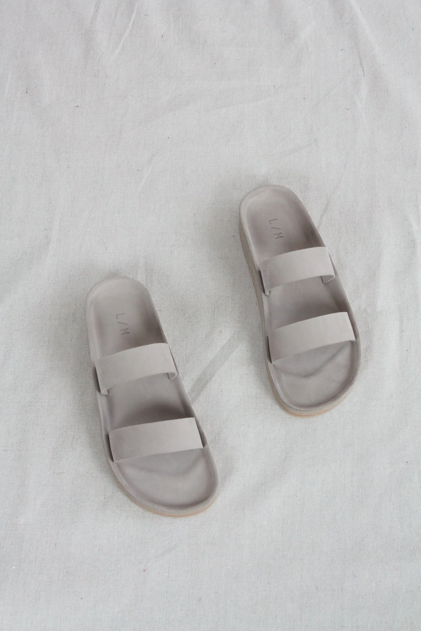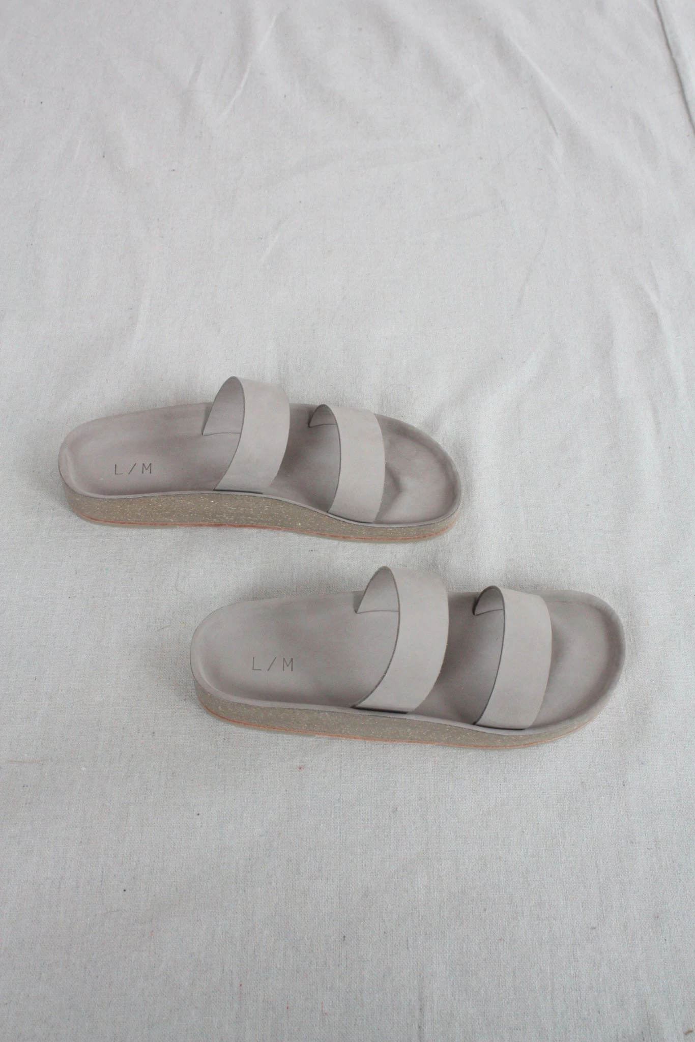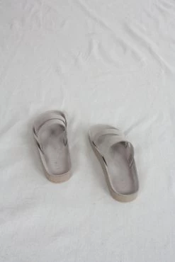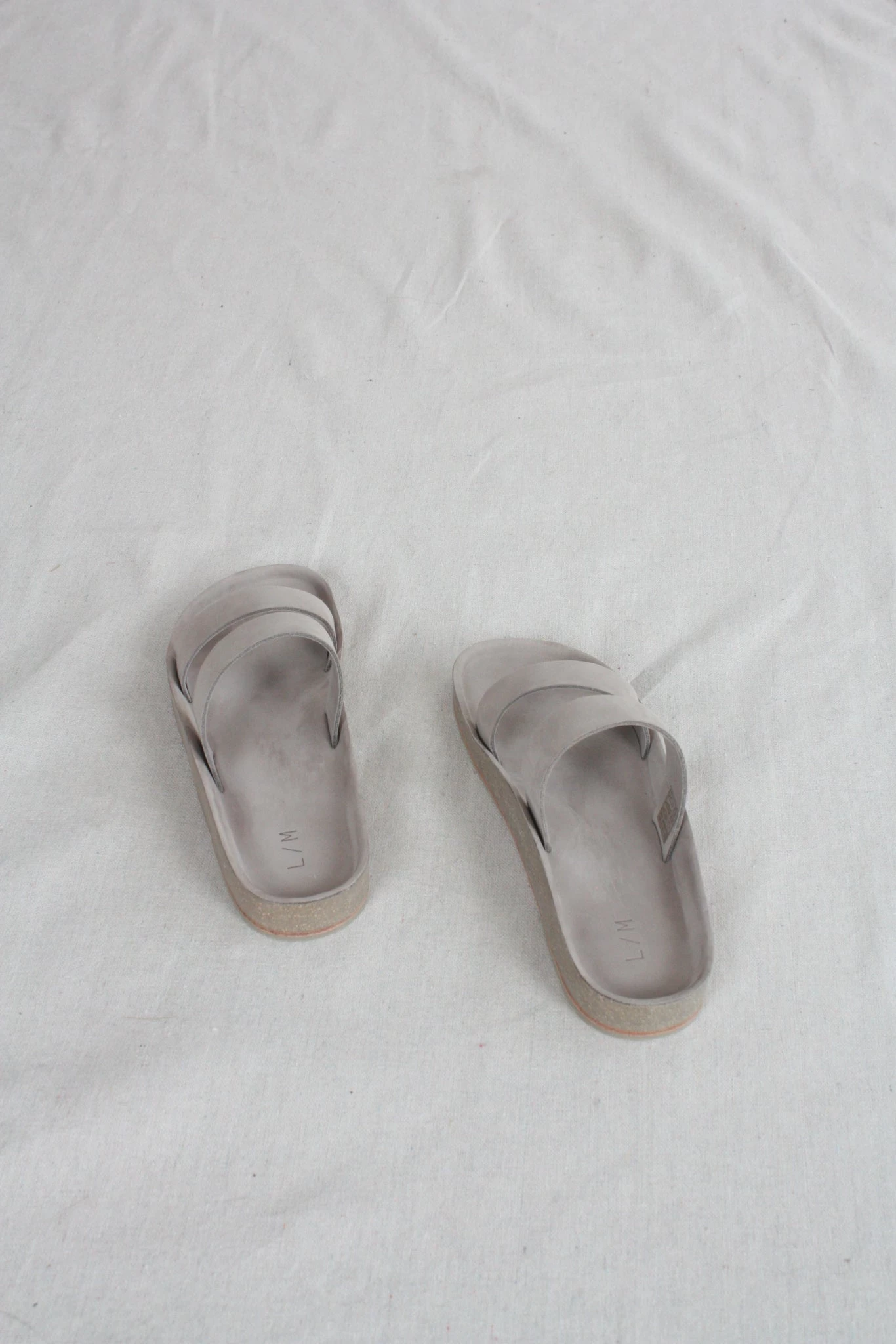 Double band raw vegetable tanned leather upper. Hand skived. Exposed natural cork footbed. Natural leather sole.Â