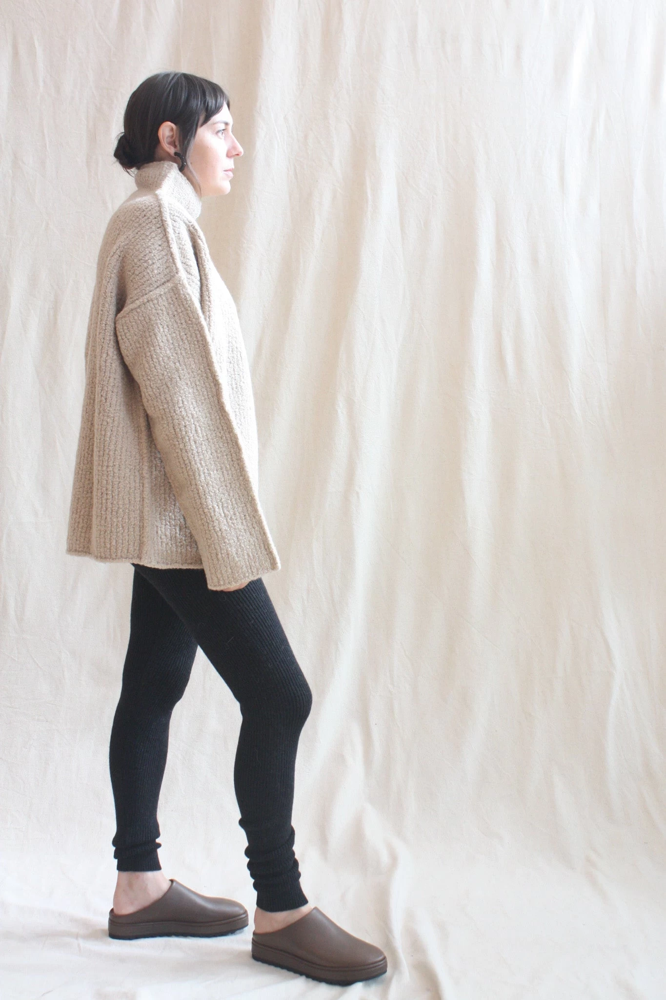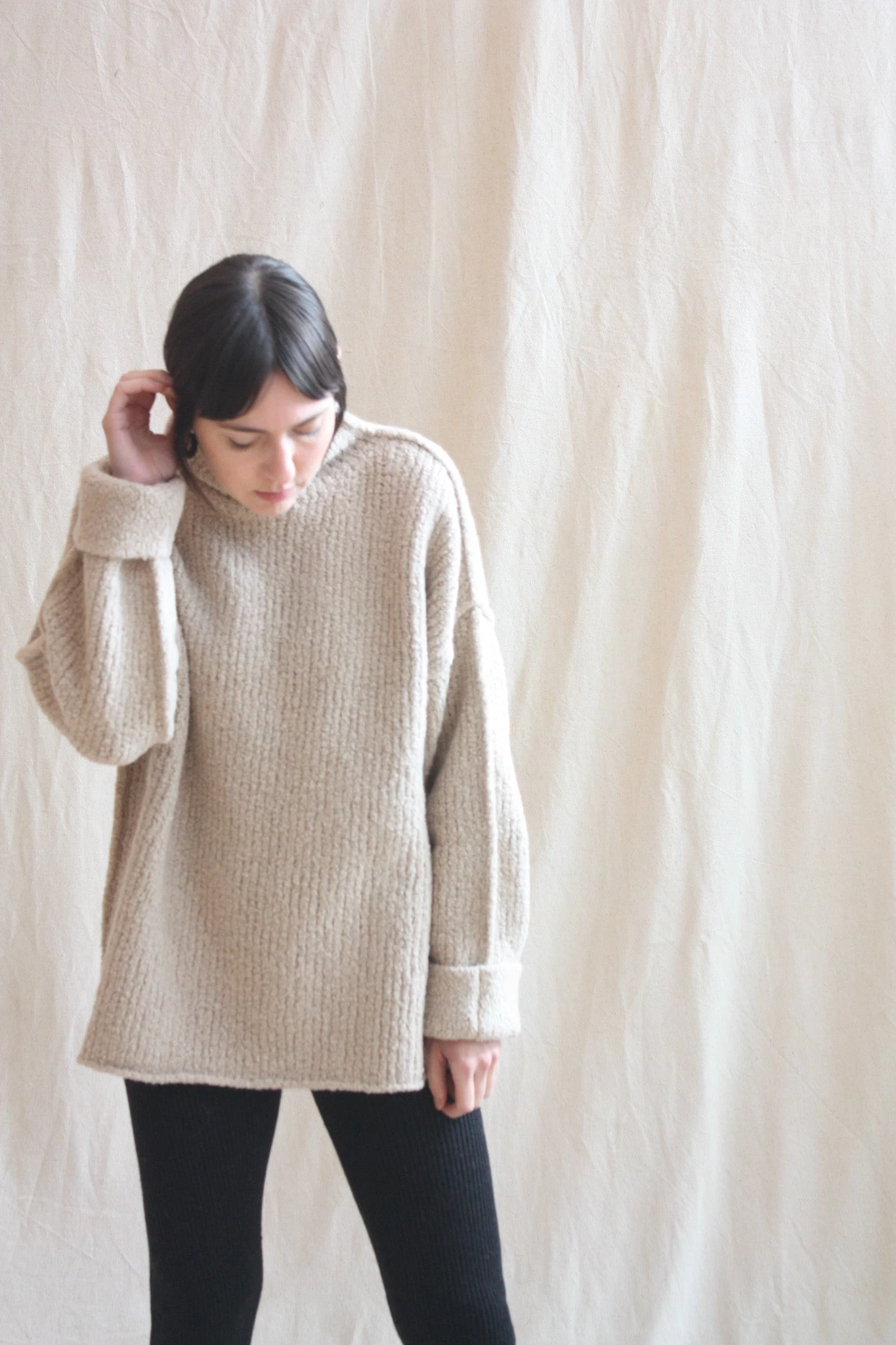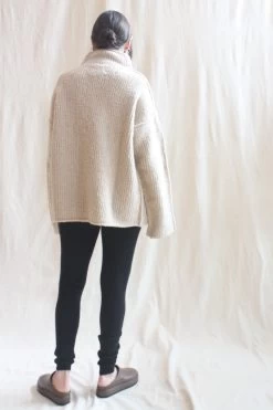 Softly structured, raised seam, knit turtleneck. Washed merino hand with boucle texture. Handloomed.