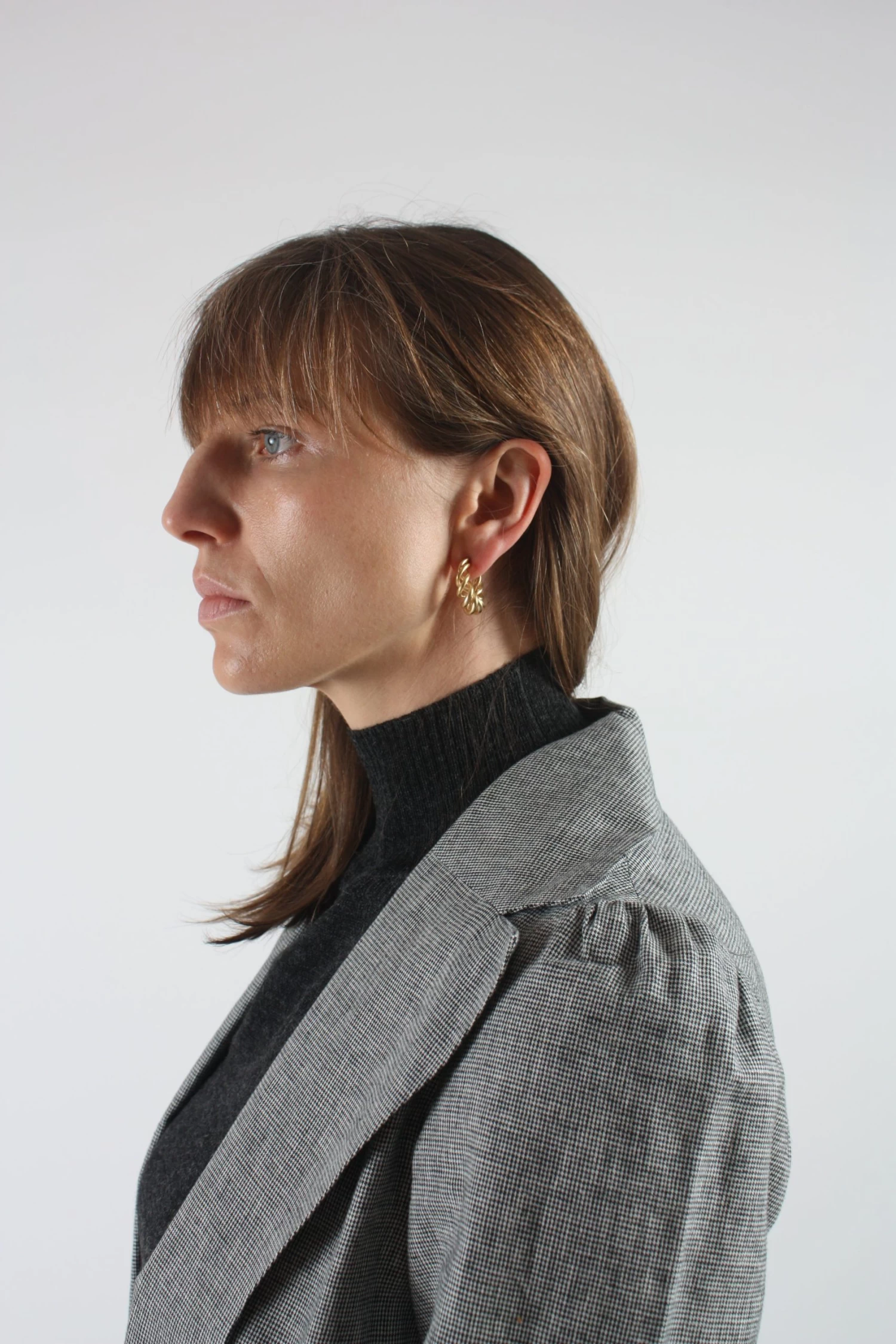 Fully lined open jacket with collar, bell shaped sleeves & gathered shoulder seams in black and grey striped linen blend.