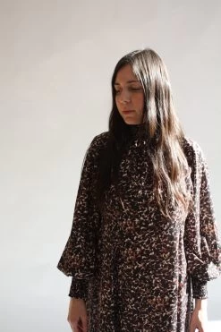 Animal printed dress with smocked detail at neck and cuffs. Bell sleeves. Relaxed fit with subtle pleats at neck for shape.