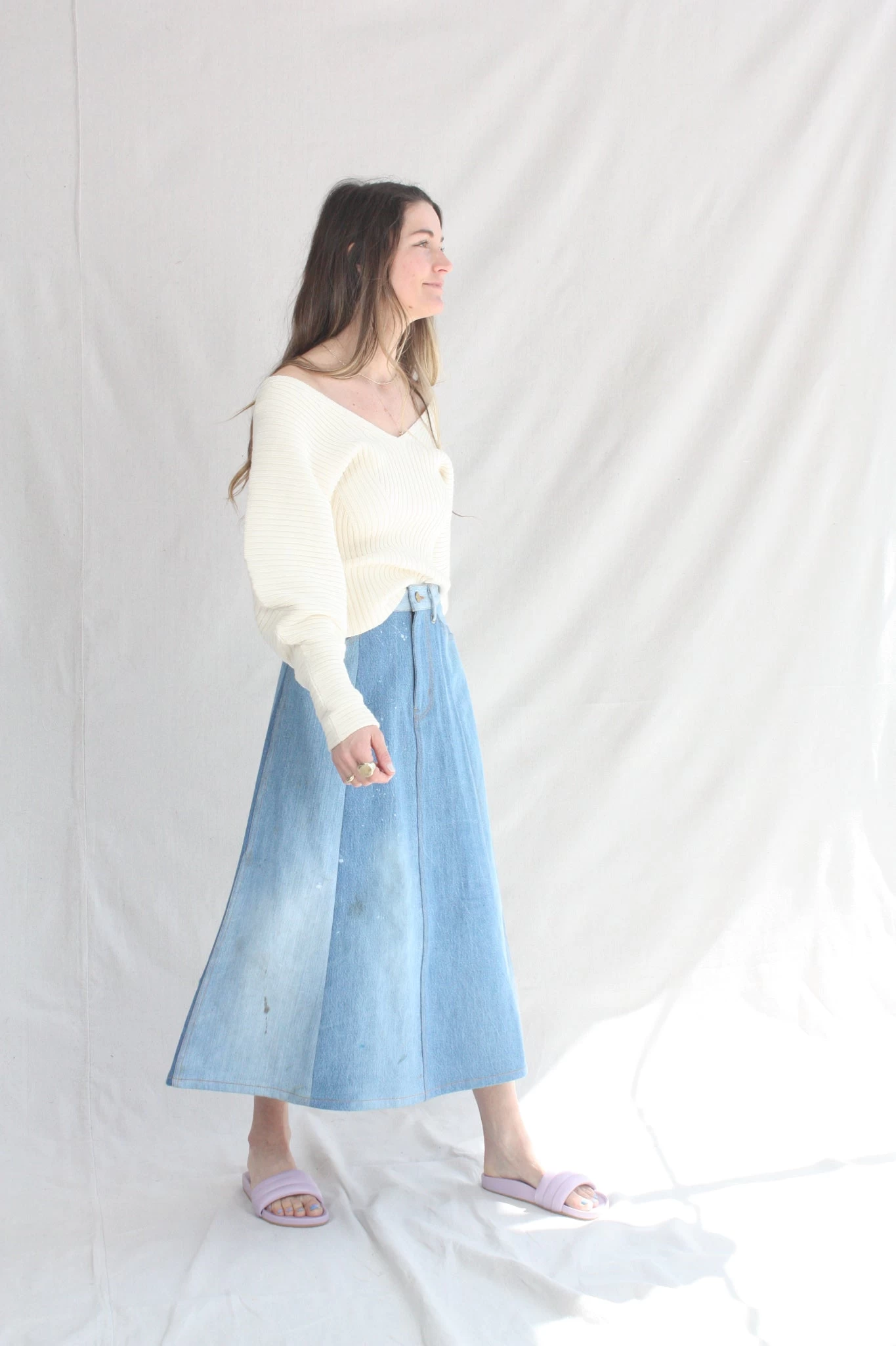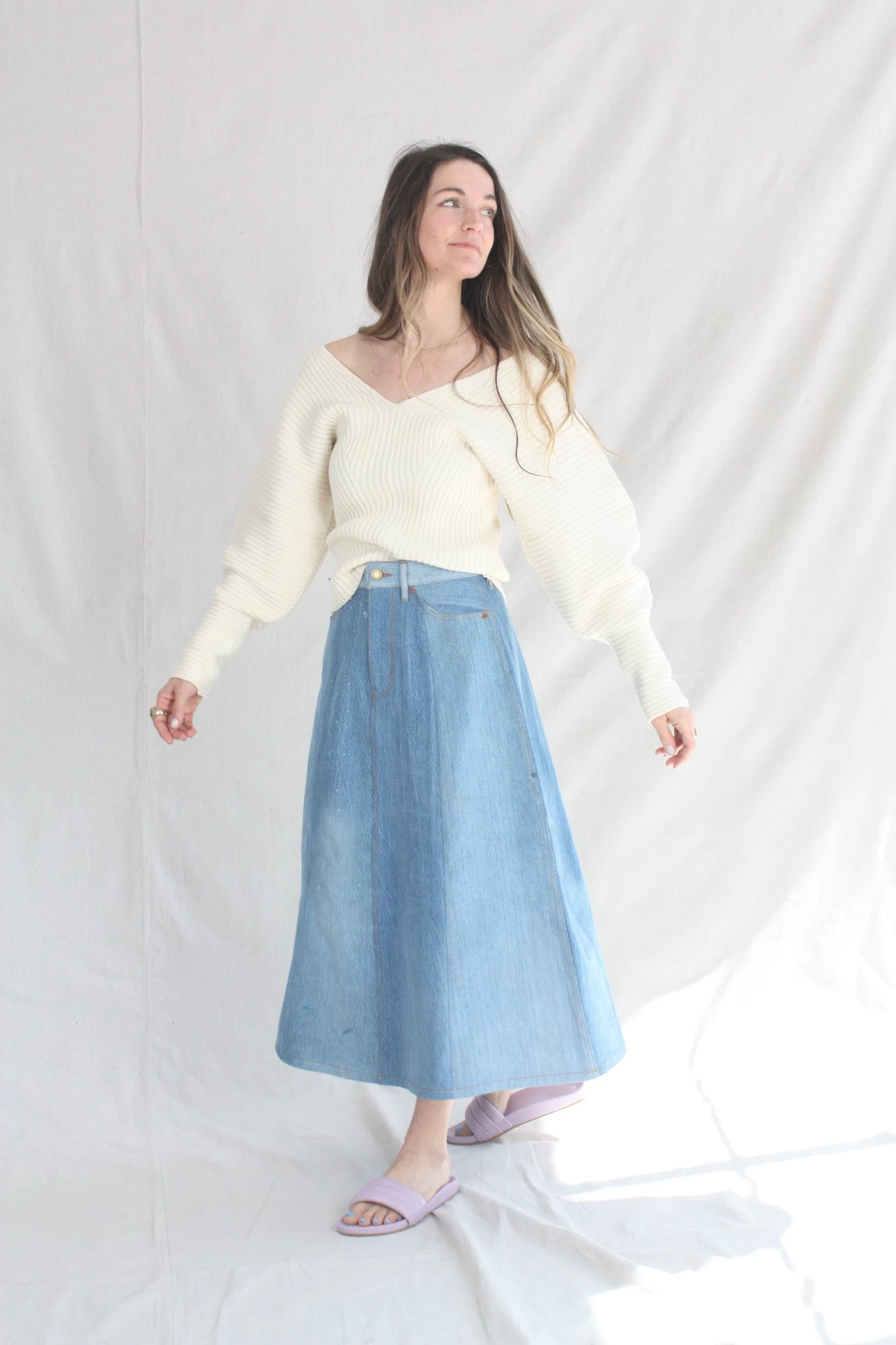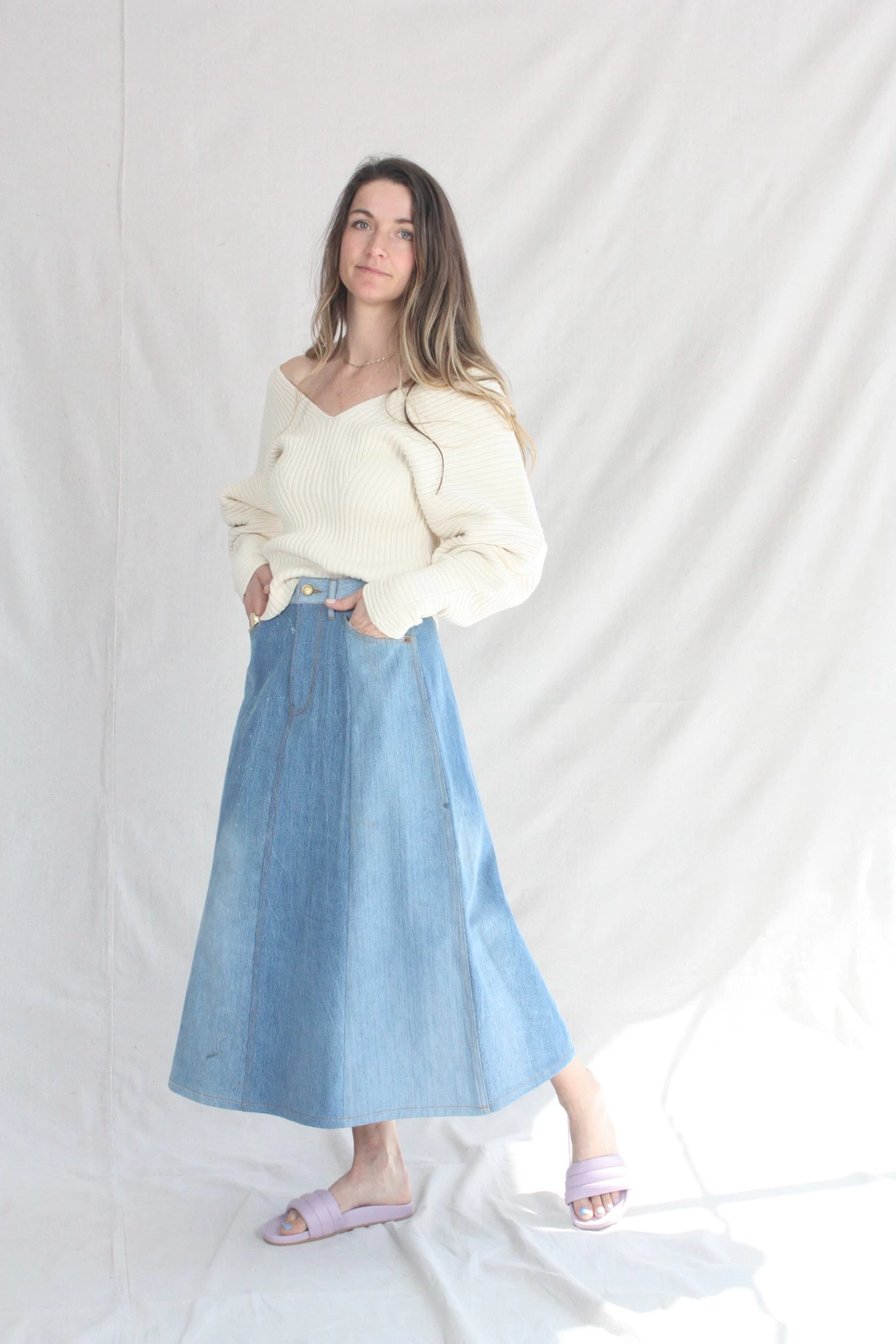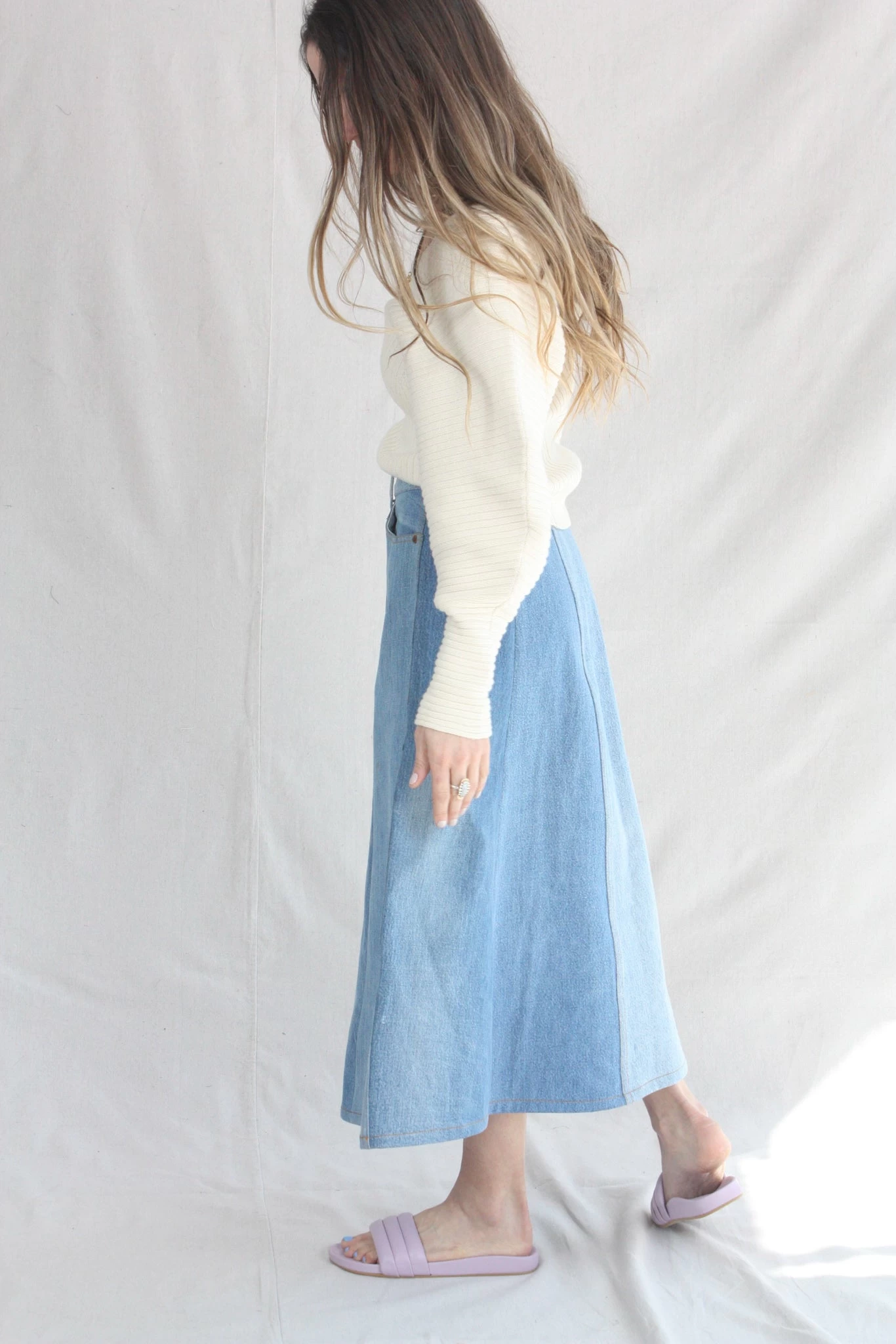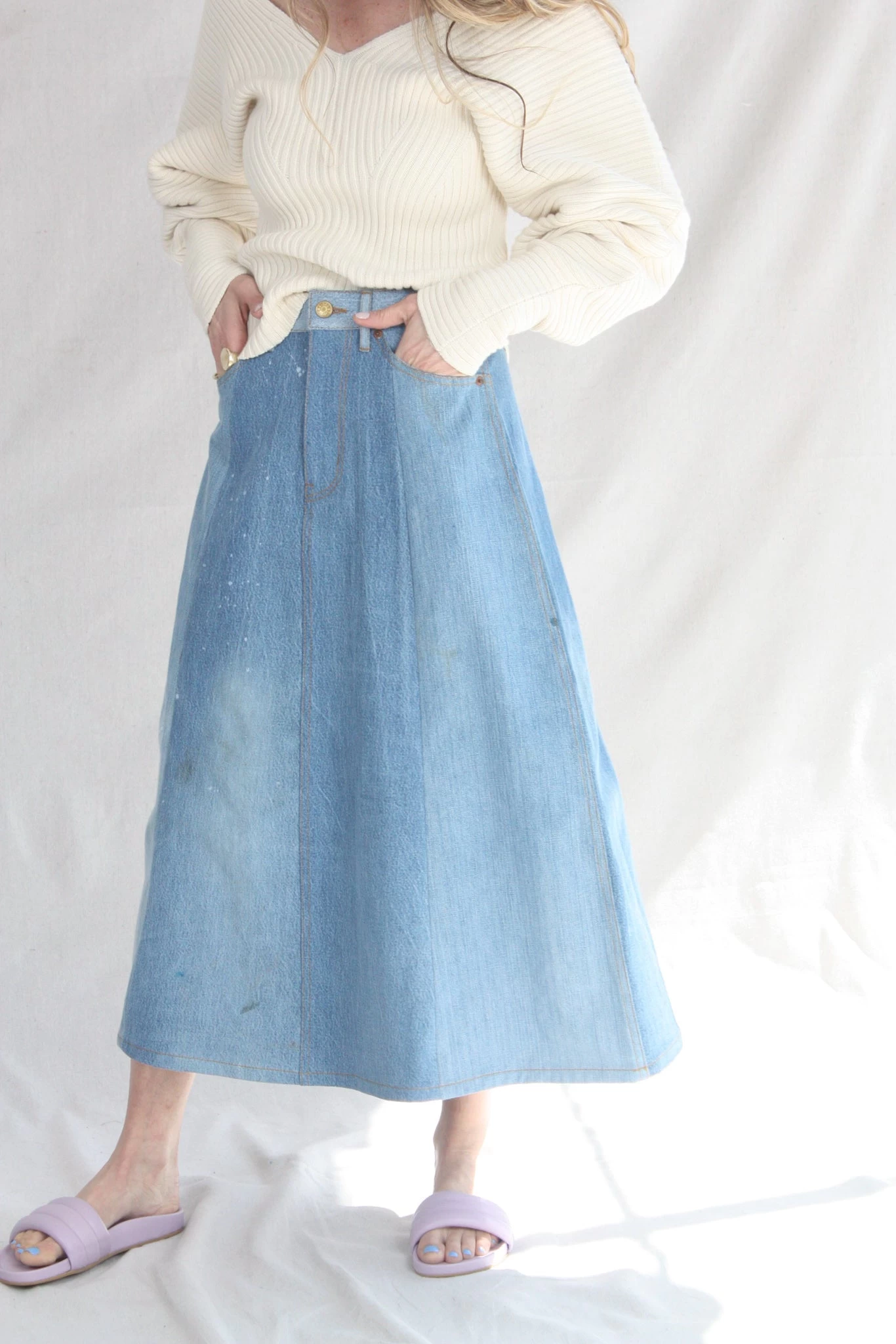 Upcycled and one-of-a-kind, a classic A-line midi length skirt, cut from a collection of 1970’s and 80’s vintage Lee, Wrangler and Levi’s jeans. Classic marigold single needle tailoring, with front zip fly closure and brass button hardware to finish each piece. High waisted A-line with a broad flattering sweep. Finished roped hem. Each skirt is one-of-a-kind.