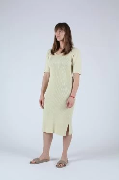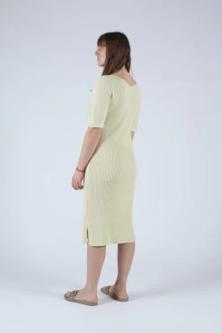 Half sleeve, double v-neck rib dress. With a straight fit that’s body skimming, ends below the knee with 2 side slits. This is made with a mid weight organic, color grown cotton. 50% of the yarn is the natural cotton color and 50% is dyed creating a marled affect.