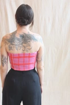 Rilynn is a bustier top with sweetheart neckline. Fitted throughout, designed with form-flattering princess seams, curved boning at the neckline and waist with a smocked back. Falls at the natural waist.