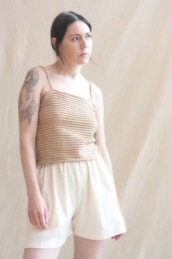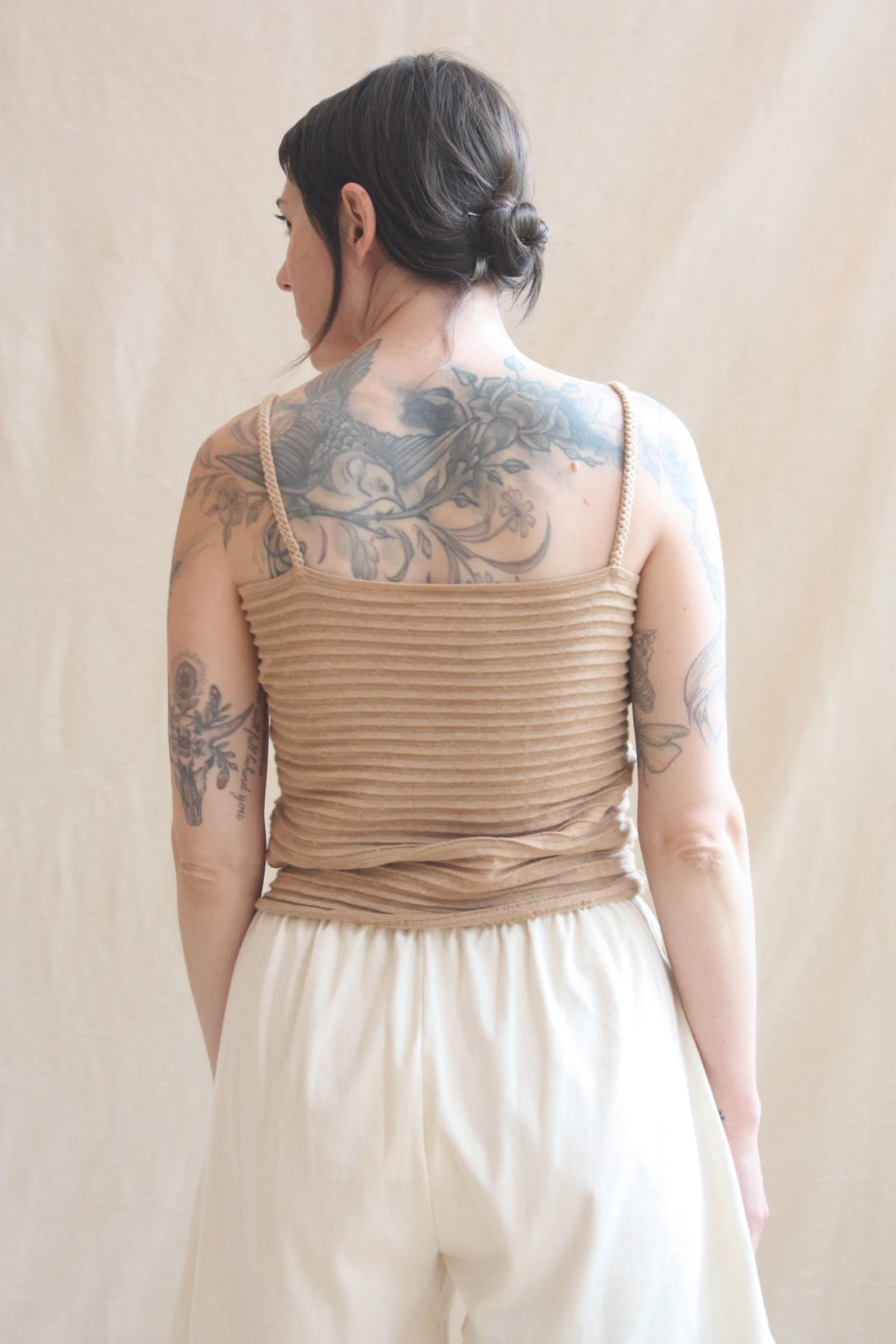 Fitted and bare camisole in a textured, 3D stitch with delicate braided yarn straps.