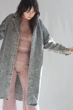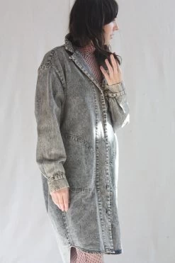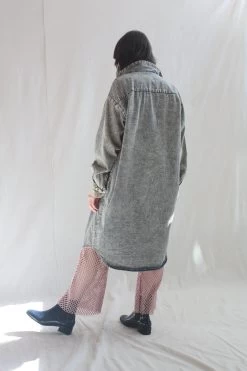 A shirtdress in Rachel Comey’s signature acid wash denim. Makes a great layering piece and pairs well with tall boots. Snap button closure. Side pockets.