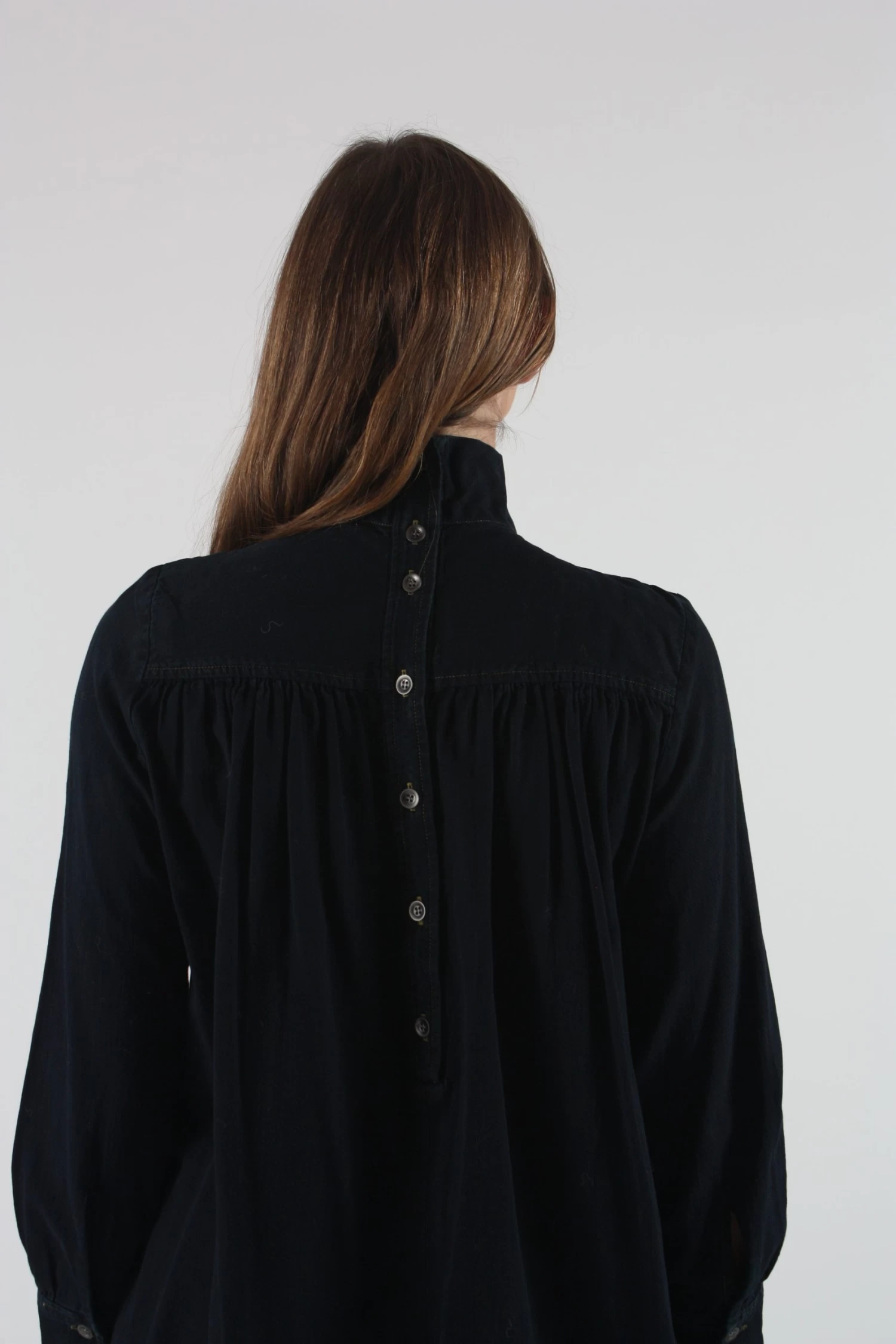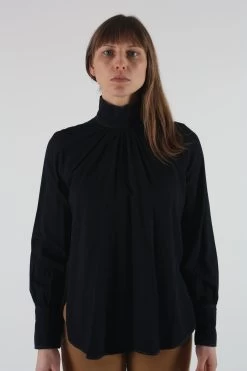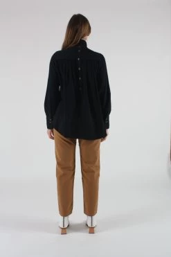 The Rite Top is a turtleneck blouse with a gathered seam that creates fullness and movement. It’s cut to have a flattering drape as is, or it’s great for tucking into pants and skirts. Button cuffs are a nice counterpoint to the turtleneck. Button placket at back neck. Curved hem with slits at the side seams. Back yoke with gathering.